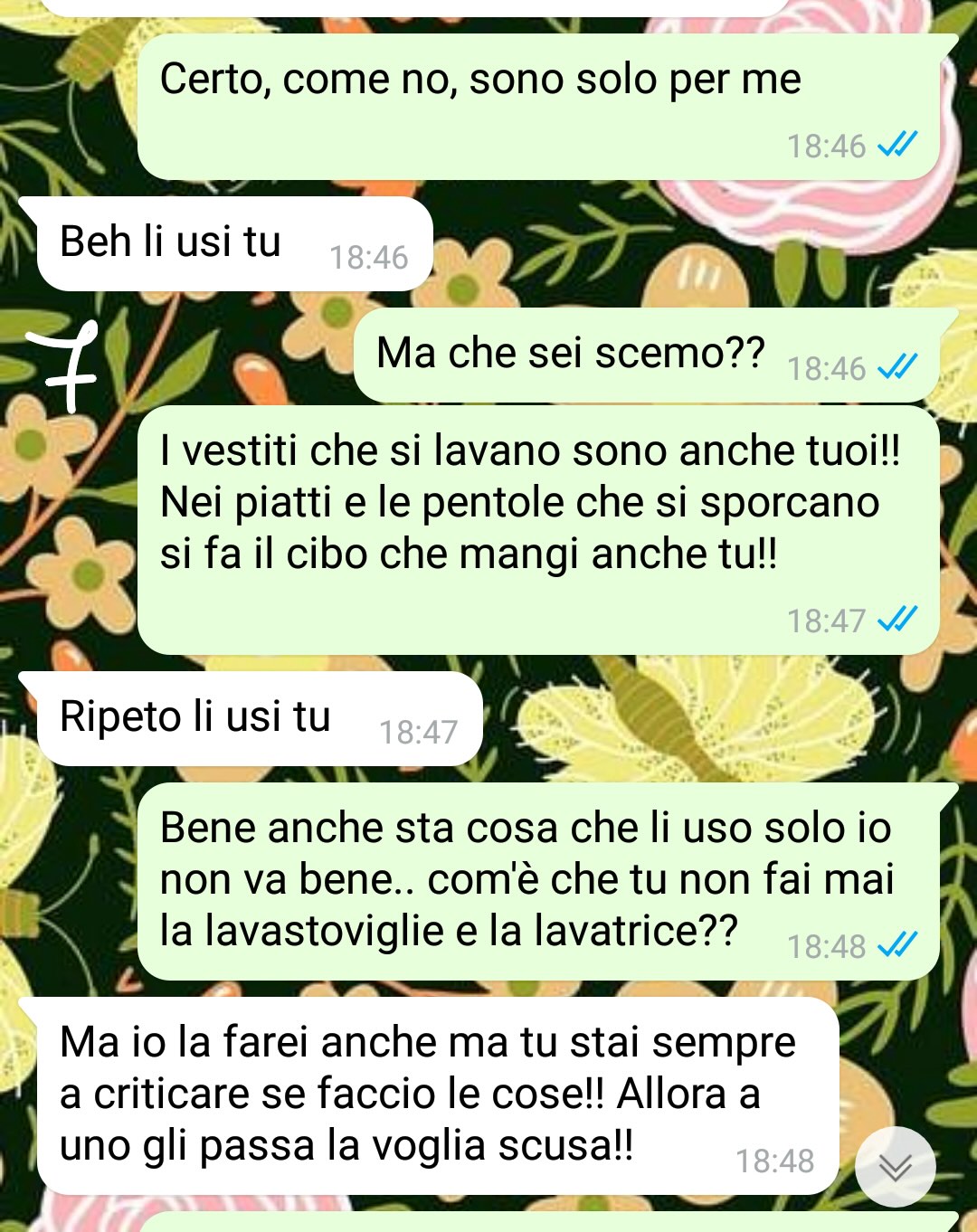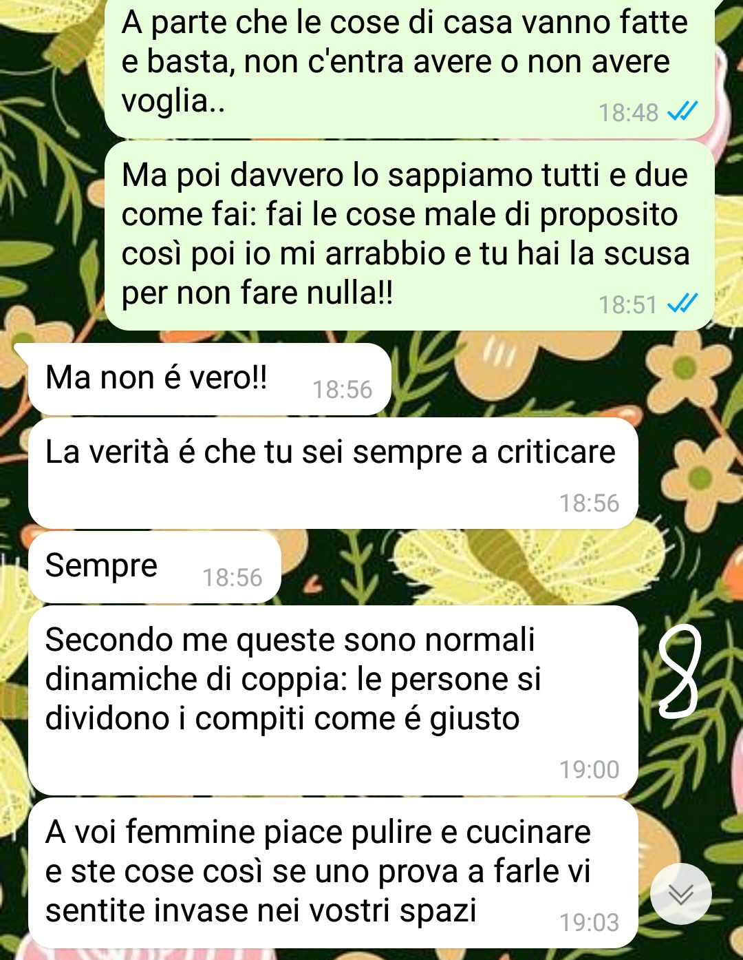 Non è solo una questione di pigrizia: la nostra follower racconta che, quando lo sprona ad aiutarla, lui esegue i compiti con evidente svogliatezza, commettendo errori grossolani. Un modo, secondo lei, per dimostrare che non è capace o che comunque è inutile insistere. E così, ogni tentativo di collaborazione finisce con un litigio e con lui che si giustifica dicendo che è lei a essere troppo perfezionista.