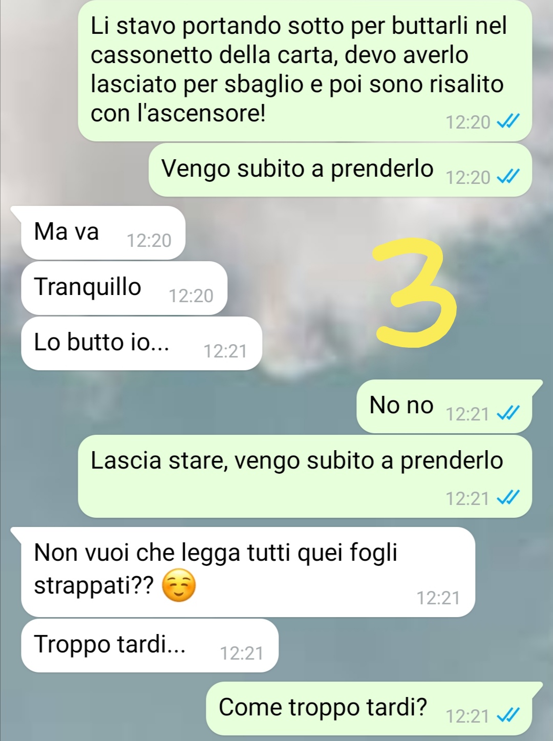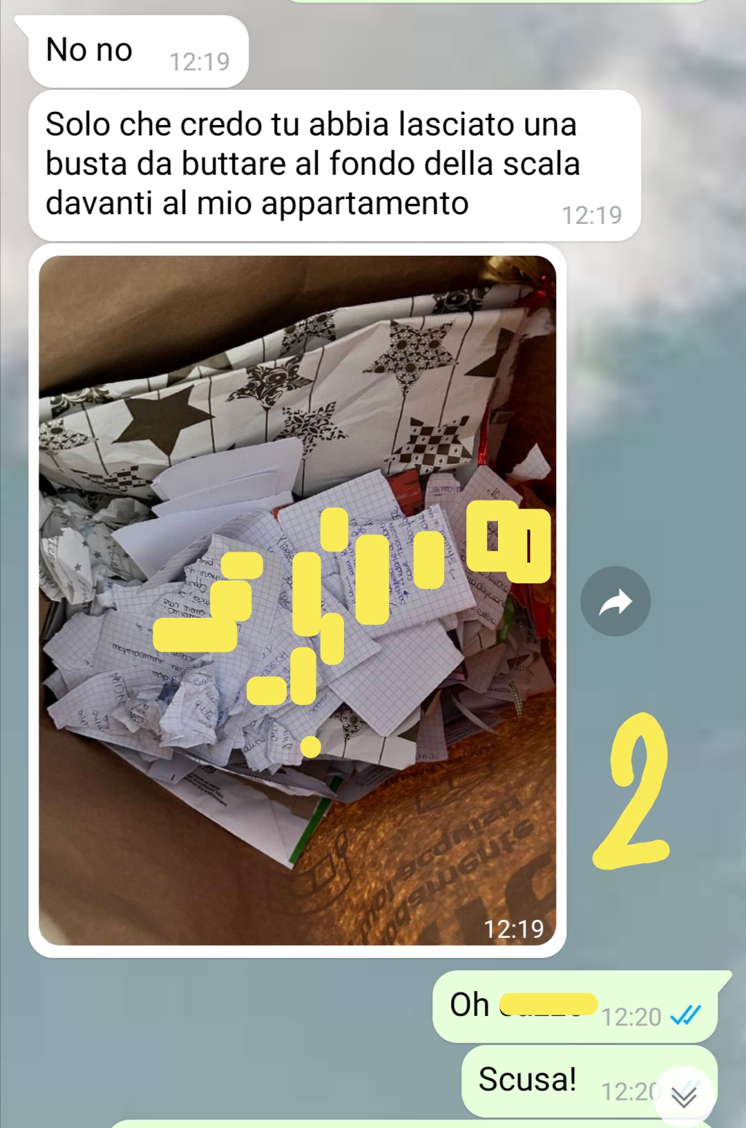 Mi chiamo Davide e vi leggo spesso. L’altro giorno mi è successa una cosa un po’ assurda e quindi ho pensato che sarebbe stato carino condividerla con voi.Parto dal raccontare che da qualche anno mi sono trasferito in un appartamento a vivere da solo.In pochi anni ho accumulato un sacco di roba, soprattutto libri, quaderni, scritte…io lavoro spesso da casa e ho avuto l’esigenza di dare una gran bella pulita al mio studio perché davvero c’era di tutto. Ho approfittato dei giorni di pioggia di queste settimane.Anche perché si dice che quando pulisci e butti via, fai spazio affinché qualcosa di nuovo arrivi e io ne avrei davvero bisogno.Comunque sia, butto via davvero un sacco di roba, faccio sacchi e sacchi di carta.Ritrovo molti miei vecchi quaderni sui quali scrivo di tutto, a volte soprappensiero, e dato che non voglio che qualcuno li ritrovi e legga le mie cose personali, li strappo tutti in pezzi più o meno piccoli. Tutto questo per dirvi che, quando pensavo di aver portato tutti i sacchi giù in cortile per rovesciarli nel bidone della carta, mi scrive la mia vicina dicendo che ha ritrovato una busta sul suo pianerottolo…capisco subito che me ne ero dimenticato una scendendo, forse l’ho appoggiata lì per caso, perché non mi stavano tutte in mano, non lo so…ma quando mi manda la foto e vedo il contenuto, mi manca un attimo il fiato. E il resto ve lo lascio leggere, perché davvero è incredibile!