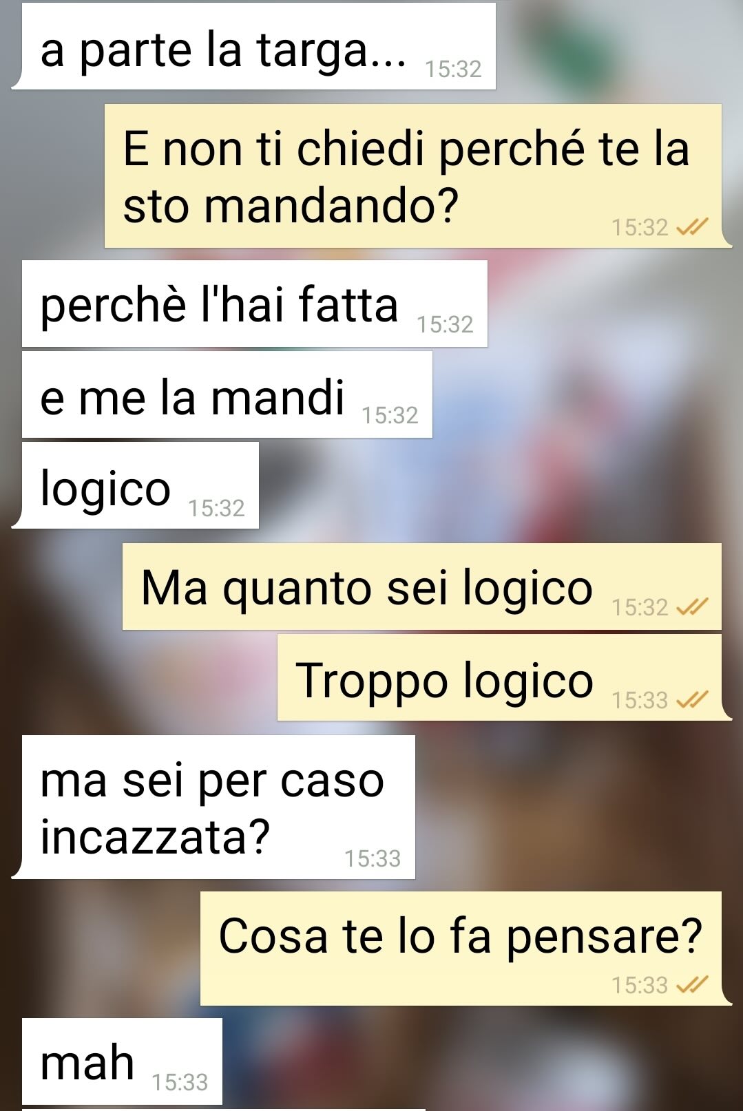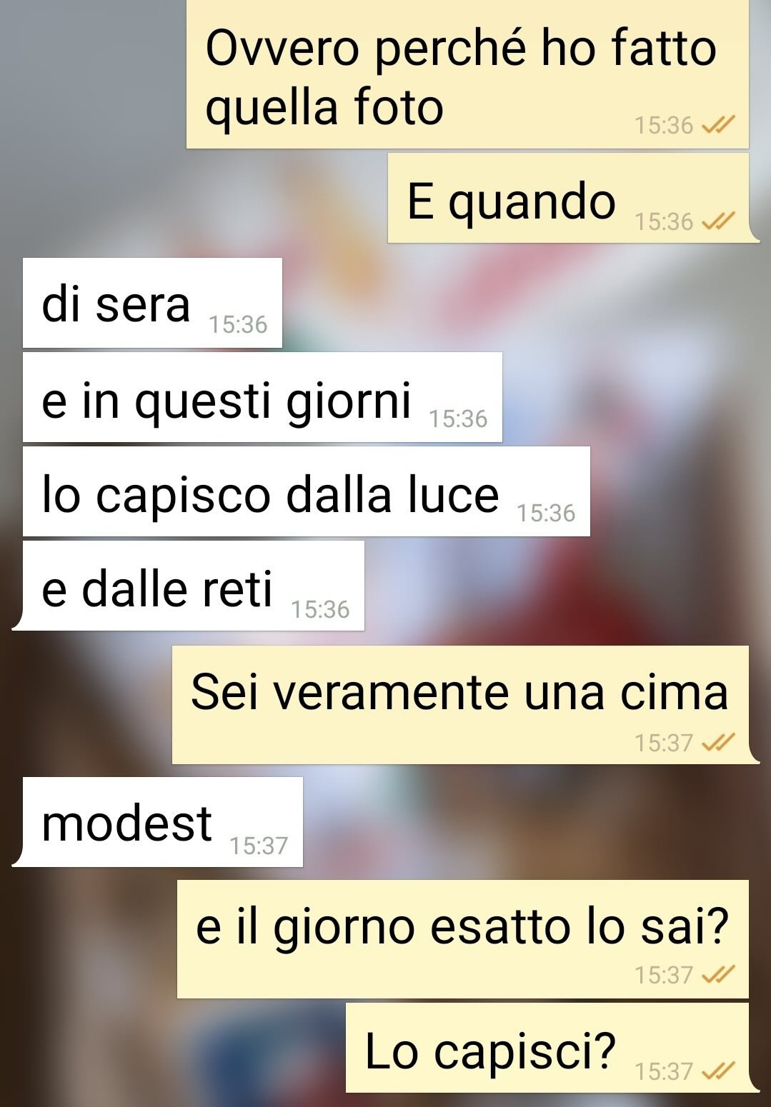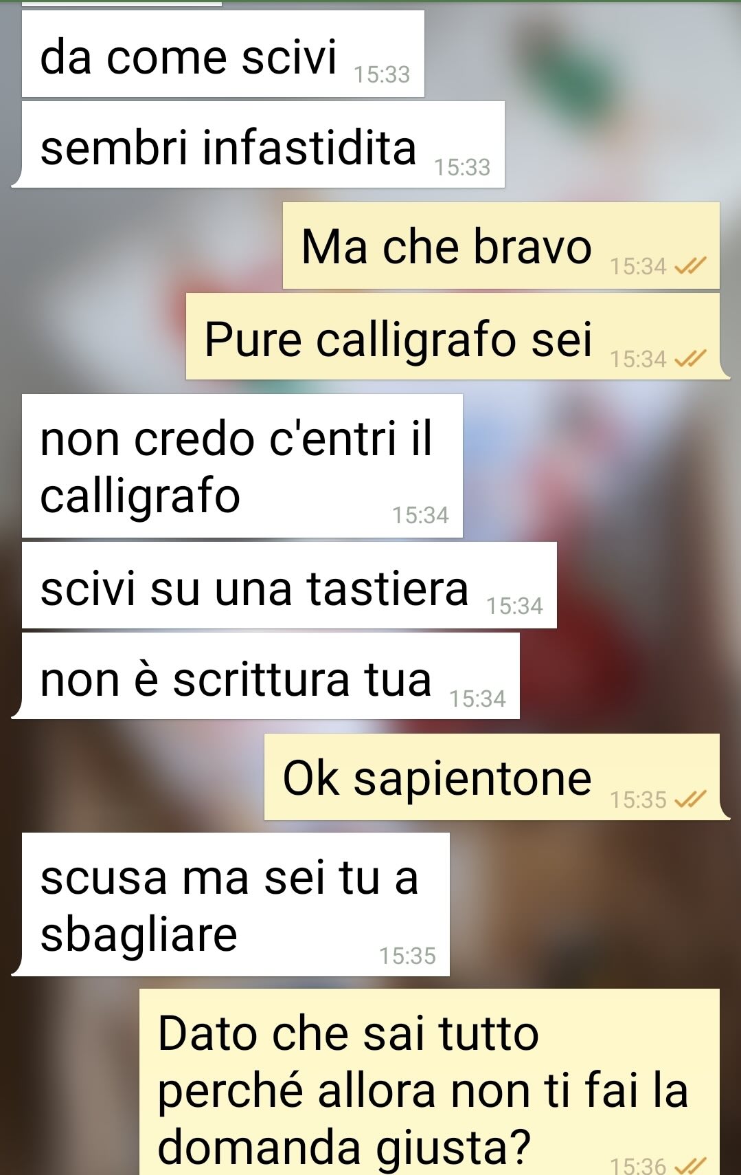 “vi mando questa storia perché avere dei pareri di gente che non sa chi io sia, che non è coinvolta direttamente o solo per conoscenza mi sarebbe ora molto utile. Ve lo dico perché tra le mie conoscenze qualcuno ha incominciato a dirmi che ho esagerato, che il tempo è passato, che forse non vale la pena mandare tutto a monte ecc. Voglio pareri senza condizionamenti, e quindi vi dico di cosa si tratta nel modo più neutrale possibile. Parto col dirvi che questa chat, tra me e il mio fidanzato è di qualche tempo addietro, non tantissimo ma neanche recentissimo. Ero ad un addio al nubilato con altre 15 ragazze e al porto mi rendo conto che il mio fidanzato mi ha mentito. La cosa che penso è che mi stia tradendo, e nei giorni seguenti cerco delle prove. Non trovo niente e allora gli scrivo con l’idea precisa di incastrarlo. Alla fine la verità viene a galla, e non si tratta di un tradimento. Ma è comunque qualcosa di molto brutto secondo me. Voi cosa ne pensate?”