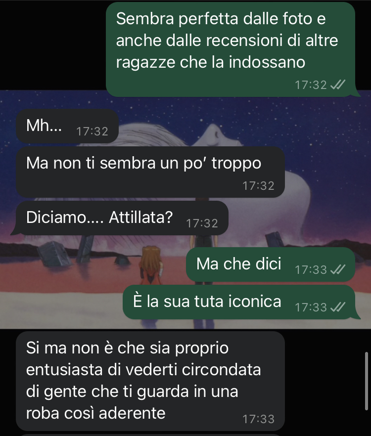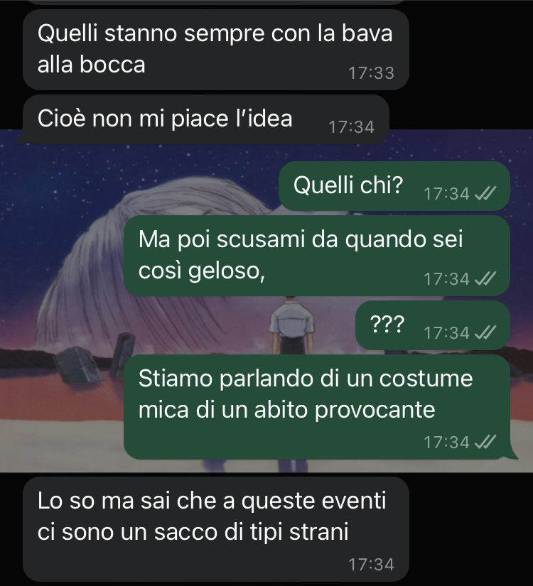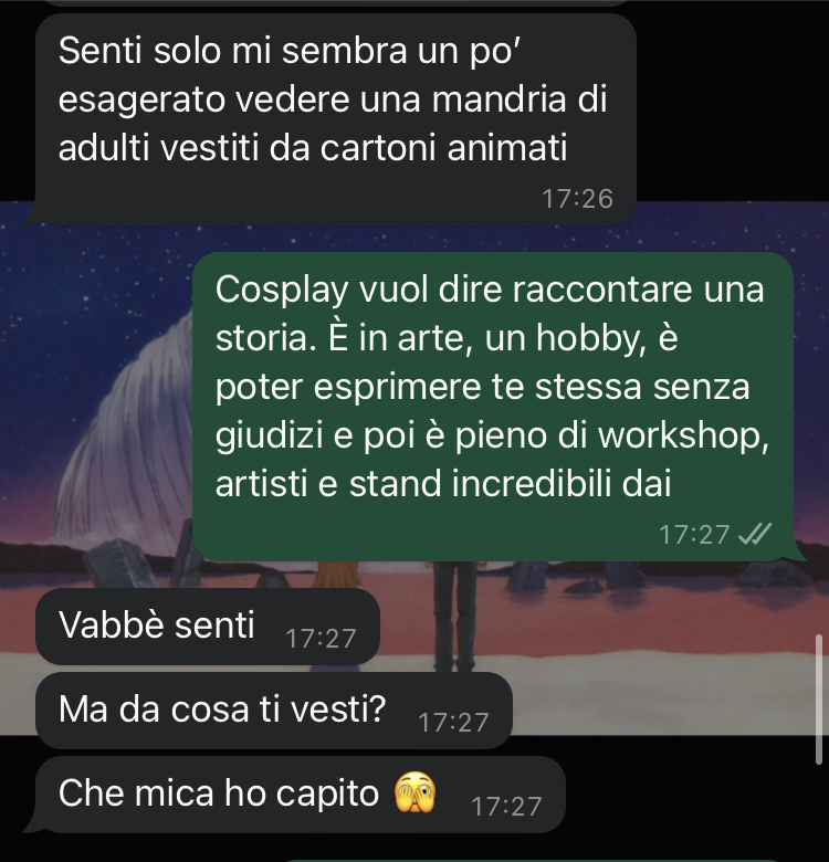 La nostra amica si trova in una situazione complicata proprio mentre il Lucca Comics ha finalmente preso il via. Dopo settimane di preparativi e di attenta pianificazione del suo cosplay, la follower dovrebbe essere al culmine dell’entusiasmo per partecipare all’evento nel weekend. Tuttavia, la gioia per questa passione che tanto ama è offuscata da un conflitto con il suo ragazzo, che non sembra comprendere l’importanza che il cosplay riveste nella sua vita. Il partner continua a fare commenti sarcastici e a minimizzare questa forma d’arte, trattandola come qualcosa di infantile e ridicolo, costringendo la nostra fan a giustificarsi continuamente per una passione che dovrebbe invece essere fonte di felicità.