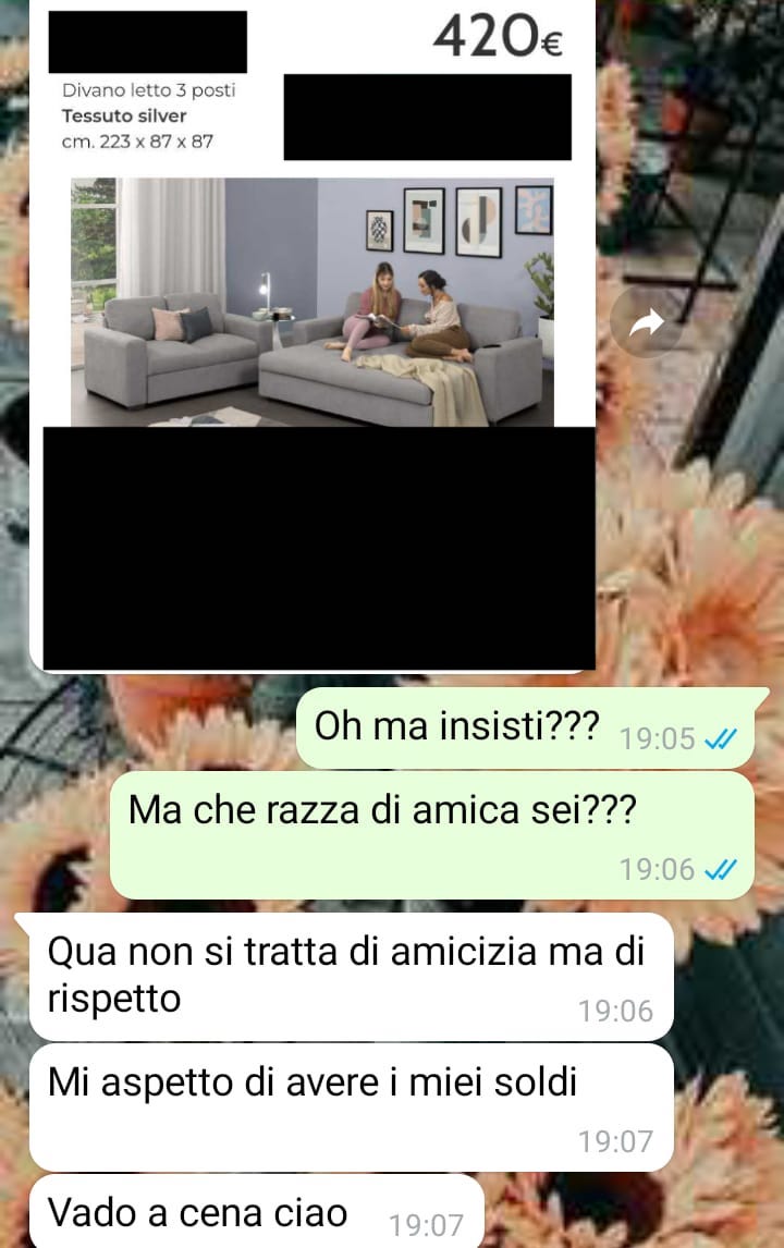 Durante l’uscita, si è verificato un incidente domestico che può capitare a tutti. Nonostante la banalità dell’incidente e il fatto che l’amica fosse consapevole della presenza di Ilaria, ha chiesto alla nostra fan di contribuire economicamente per comprare un nuovo divano. Questo ha portato a un grosso litigio, poiché la richiesta è stata considerata esagerata e ingiustificata.