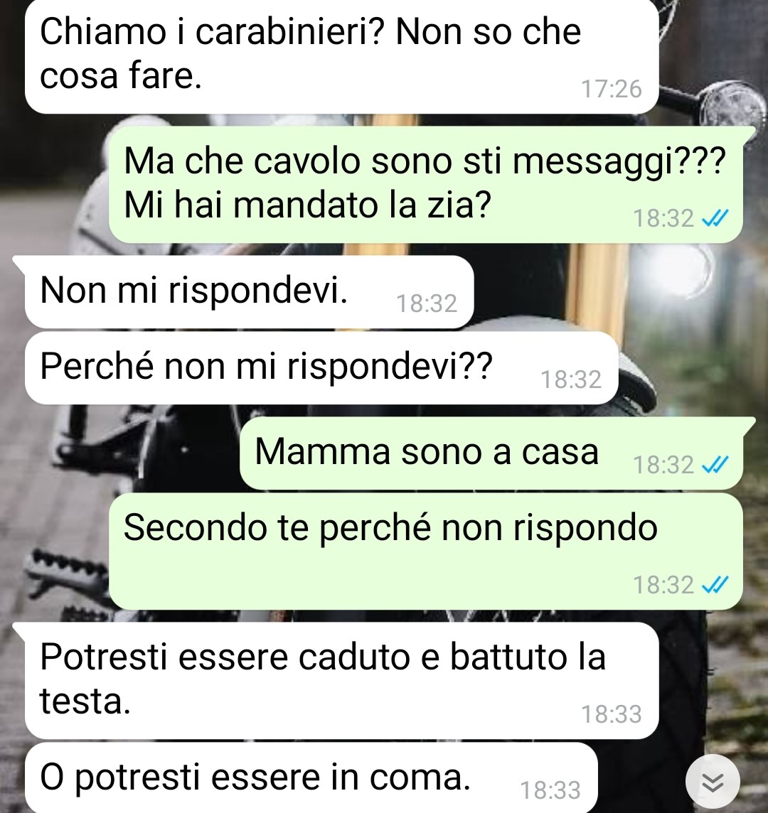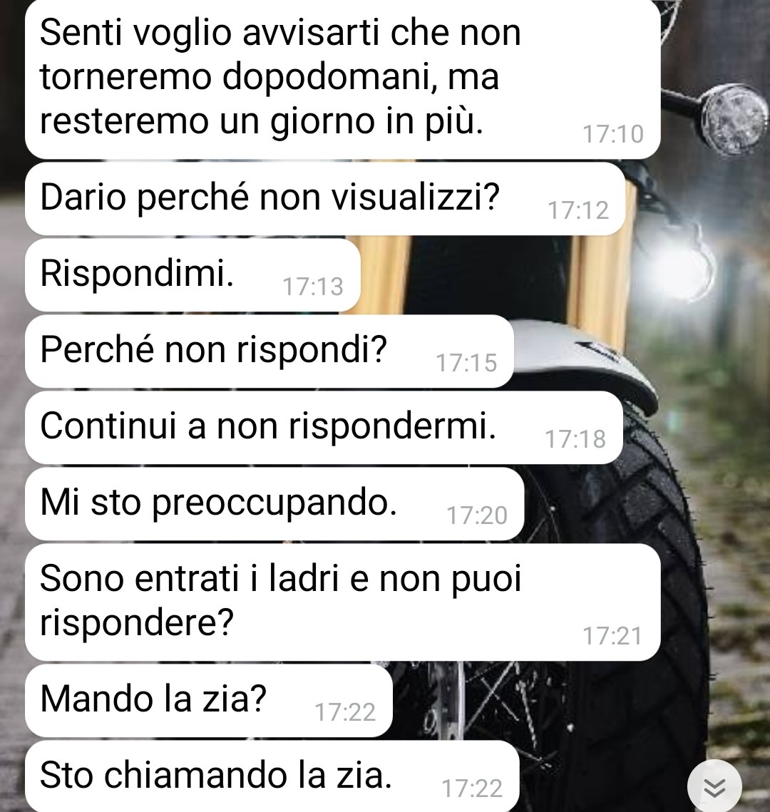 Spiega che ogni uscita o ogni mancata risposta a un messaggio diventa motivo di preoccupazione eccessiva, invadenza e, spesso, discussioni. Questa volta, ad esempio, la madre era partita per una vacanza con il compagno, diretti dai genitori di lui. Dario non ha risposto subito a un suo messaggio e da lì è scattata l’ennesima reazione sproporzionata, come già successo molte altre volte.