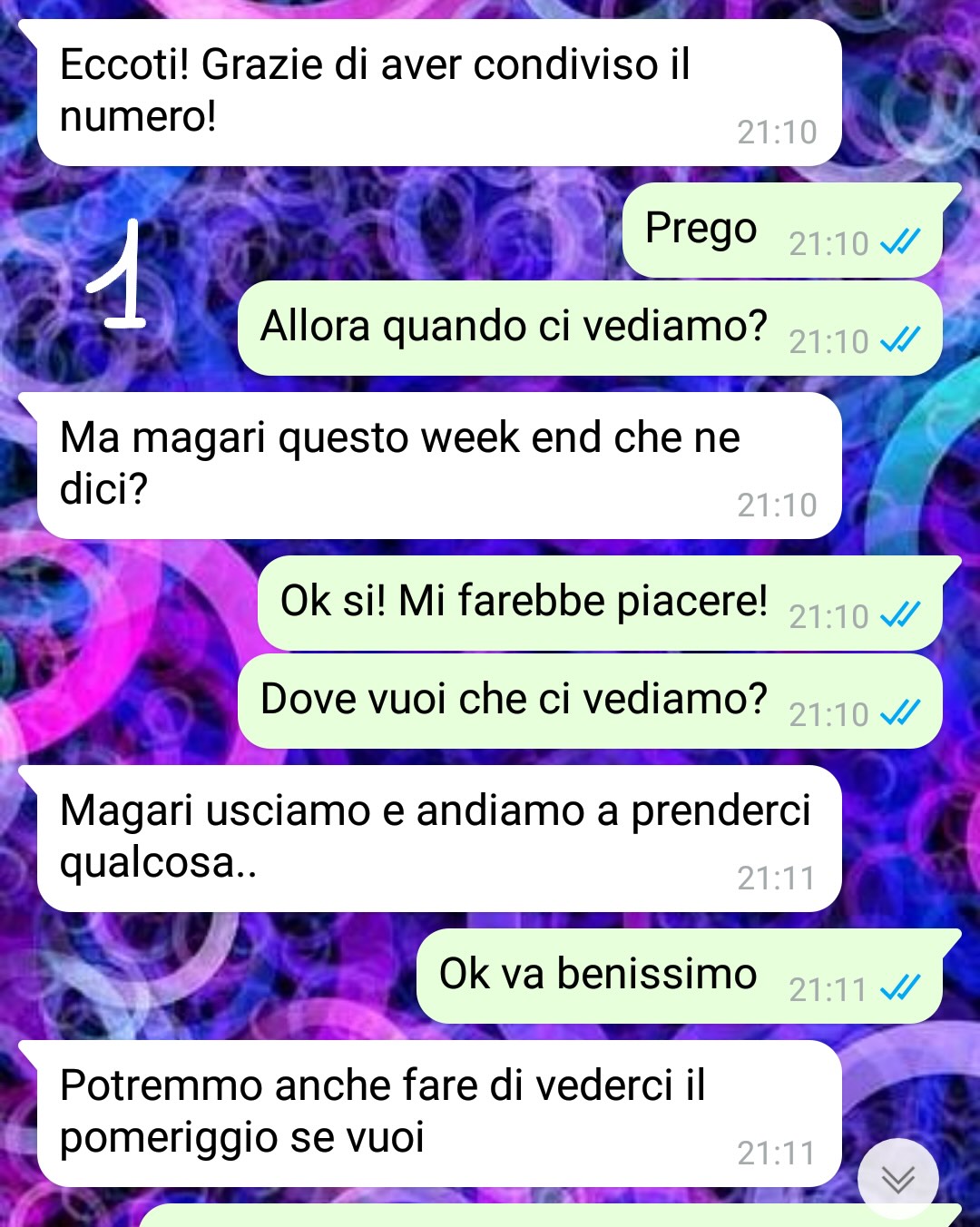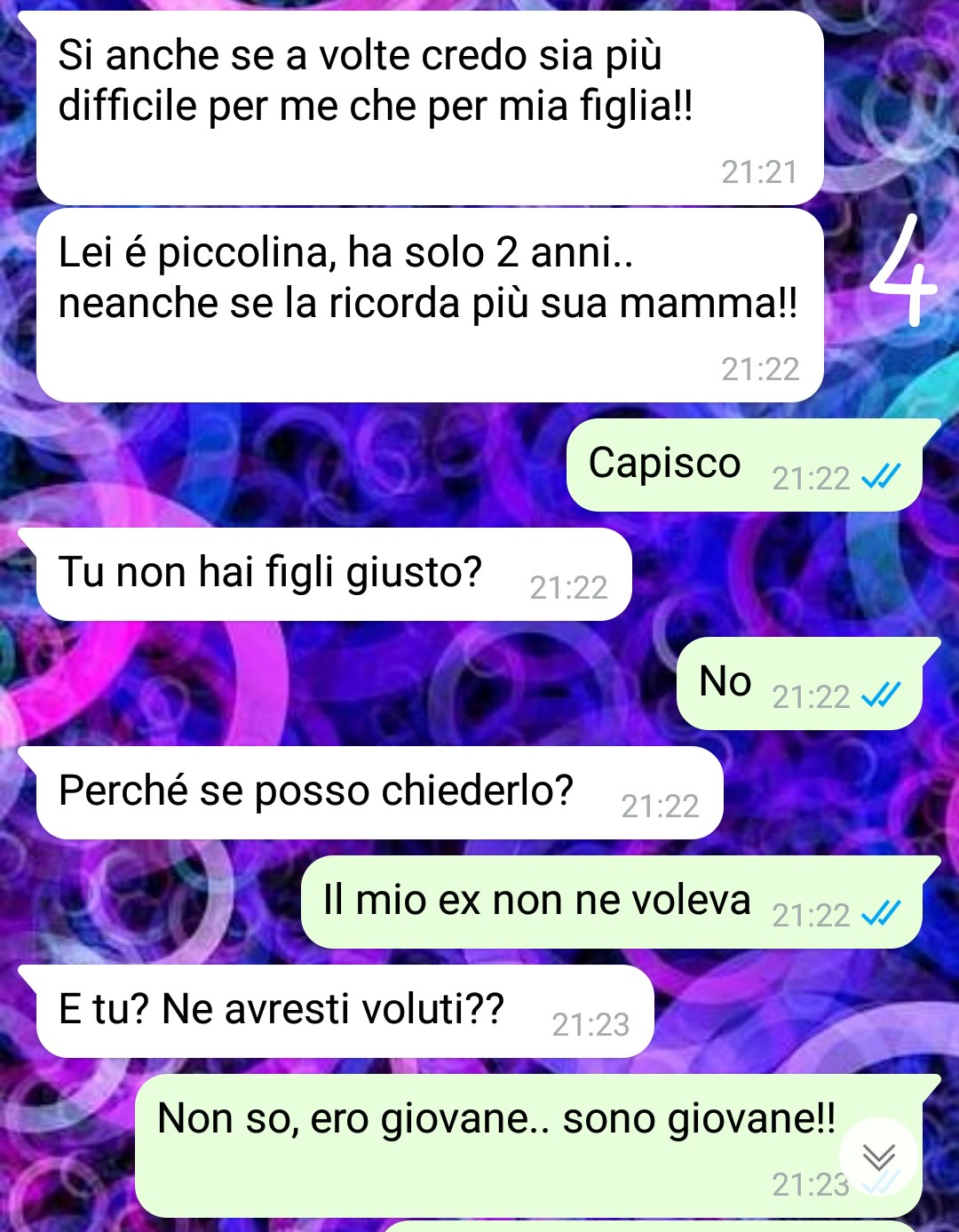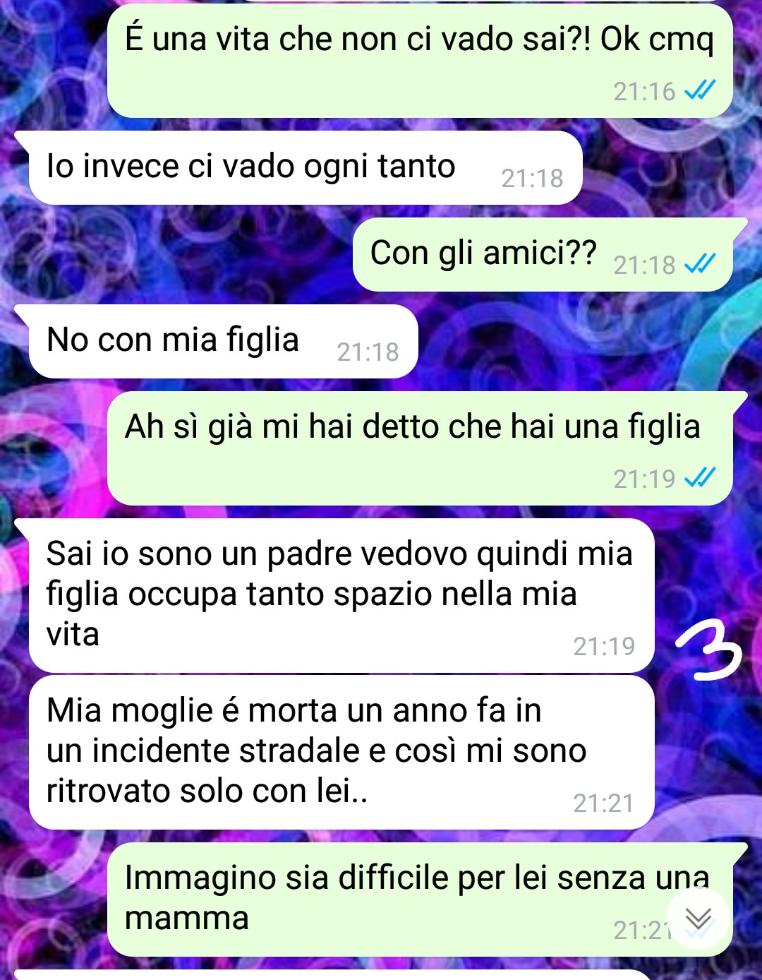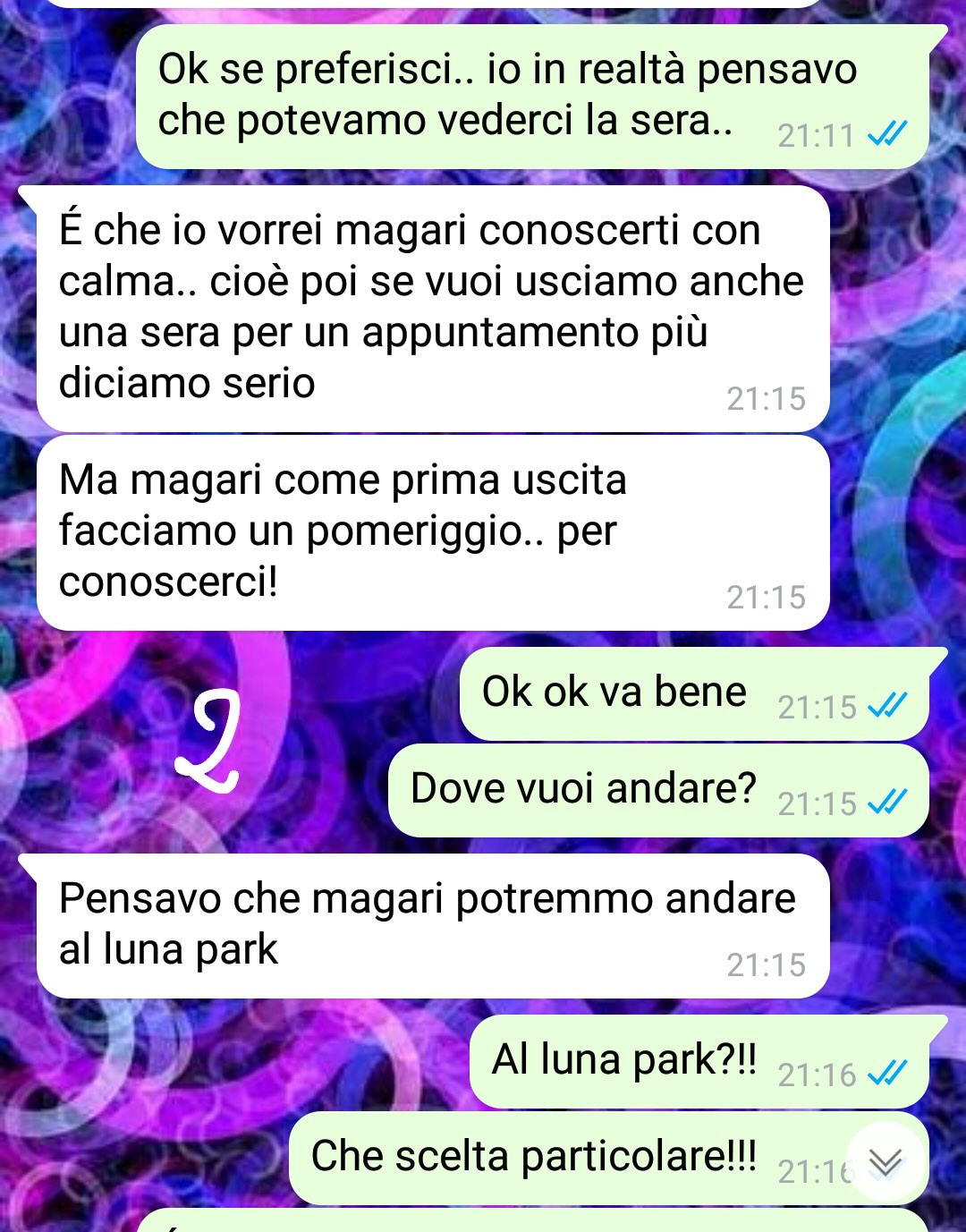 Sono Annalisa, sono stata sposata per 12 anni e dopo il divorzio tornare single è stato.. strano!! Non ricordavo neanche più cosa volesse dire uscire e conoscere persone in quel senso quindi, devo dire, il ritorno a tutto questo è stato davvero surreale e, in un certo senso, completamente nuovo. I tempi saranno cambiati, io sarò più vecchia.. ma neanche tanto dai: mi sono sposata giovanissima!! Ora ho 33 anni!!.. In ogni caso il mondo del dating oggi non me lo aspettavo proprio! Nelle app di incontri ho trovato proprio di tutto: dal tizio sposato che nonostante la pagina pubblica su FB con moglie e figli sorridenti si dichiara libero, agli eterni signorini che a 40 anni non hanno mai avuto relazioni serie.. ai veri e propri casi umani da cui viene voglia solo di scappare!! Insomma non so se sono stata sfortunata io ma devo dire che il quadro è davvero scoraggiante! Comunque dopo un bel po’ di incontri io un fidanzato l’ho trovato ma vorrei condividere con voi la chat con la persona più strana che ho conosciuto on line.. tra l’altro poco prima di conoscere il mio attuale compagno! Fatevi due risate e ricordate che comunque sia tutto va a finire bene e anche ste esperienze servono a qualcosa: tipo a farvi apprezzare la persona giusta quando finalmente la incontrate!!