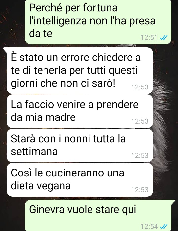 Tuttavia, una recente situazione ha rotto questo equilibrio precario. Poco dopo che la madre ha affidato Ginevra a lui prima di partire per una trasferta, è sorto un nuovo contrasto. La madre, come spesso accade, ha voluto controllare anche a distanza le abitudini quotidiane della figlia, a partire da ciò che avrebbe mangiato.