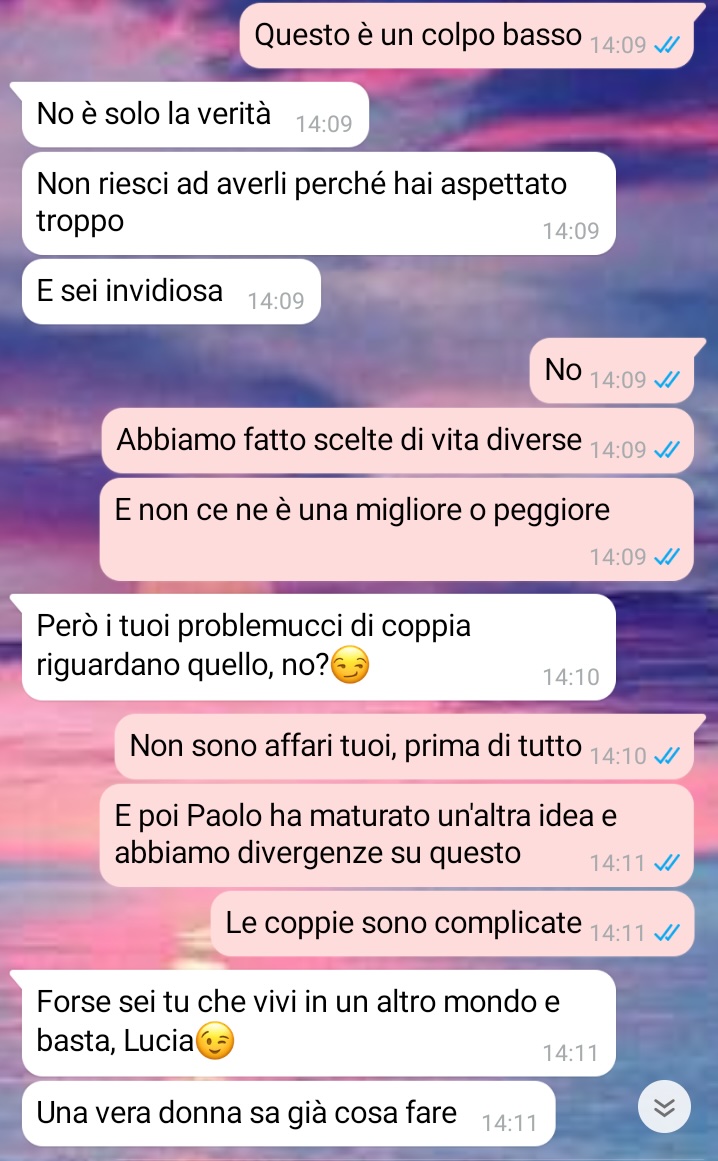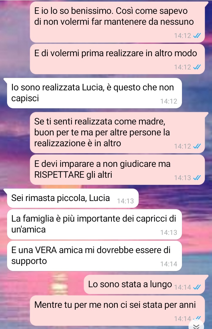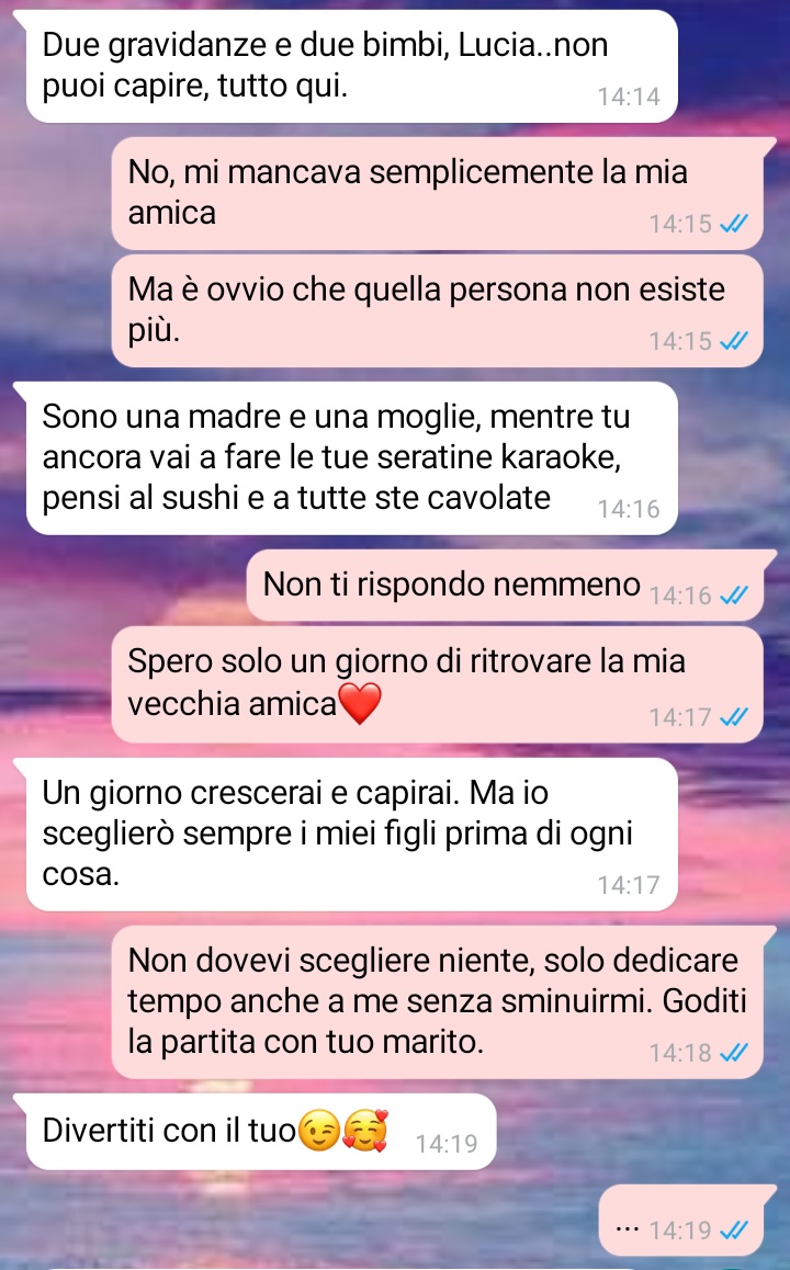 La follower sottolinea l’importanza dell’equilibrio nelle relazioni, spiegando come una buona amica dovrebbe considerare che dall’altra parte c’è anche una madre, ma allo stesso modo ogni madre dovrebbe ricordare che la vita delle altre persone non gira intorno alla propria esperienza genitoriale. L’amica evidenzia come sia fondamentale l’impegno reciproco per mantenere vivo il rapporto, altrimenti questo tende a svanire naturalmente. La nostra lettrice critica l’atteggiamento di superiorità che alcune madri assumono, pensando che chi non ha figli non possa comprendere i loro sforzi o che i problemi altrui siano automaticamente meno importanti, definendo questo comportamento egoistico piuttosto che materno. Conclude rivelando che proprio questa dinamica ha compromesso il rapporto con una delle sue amicizie più care.