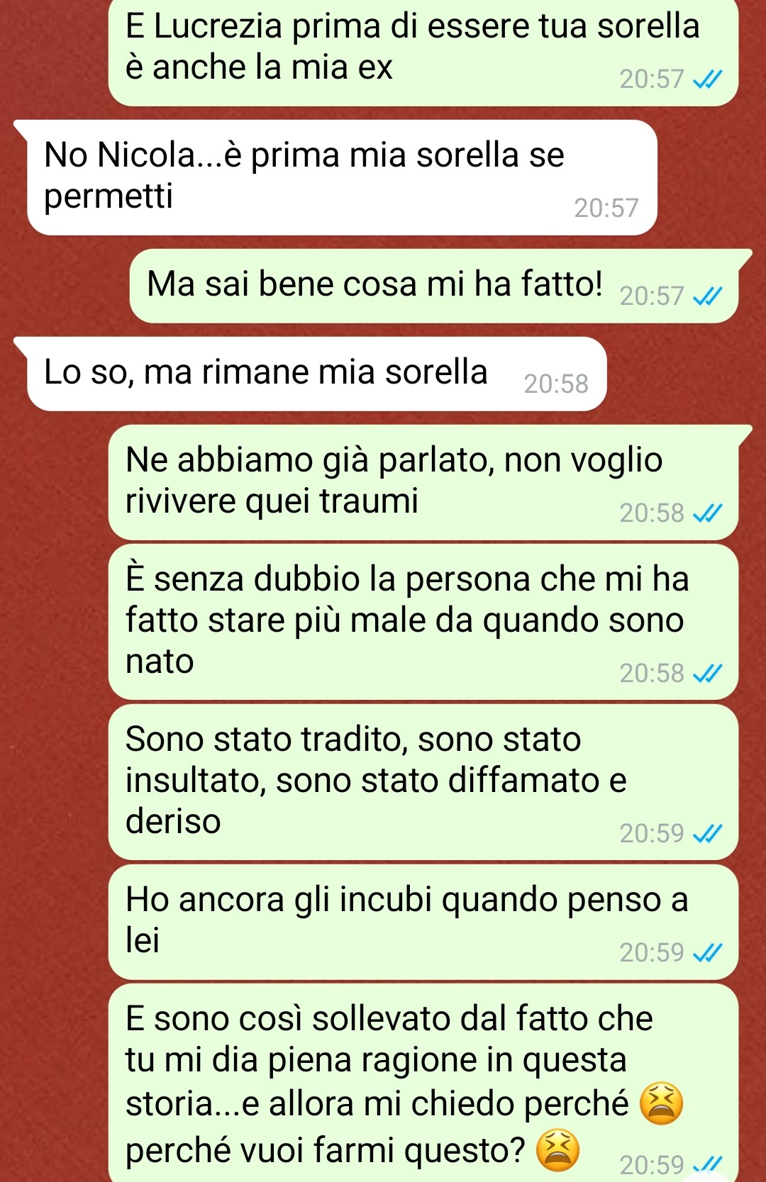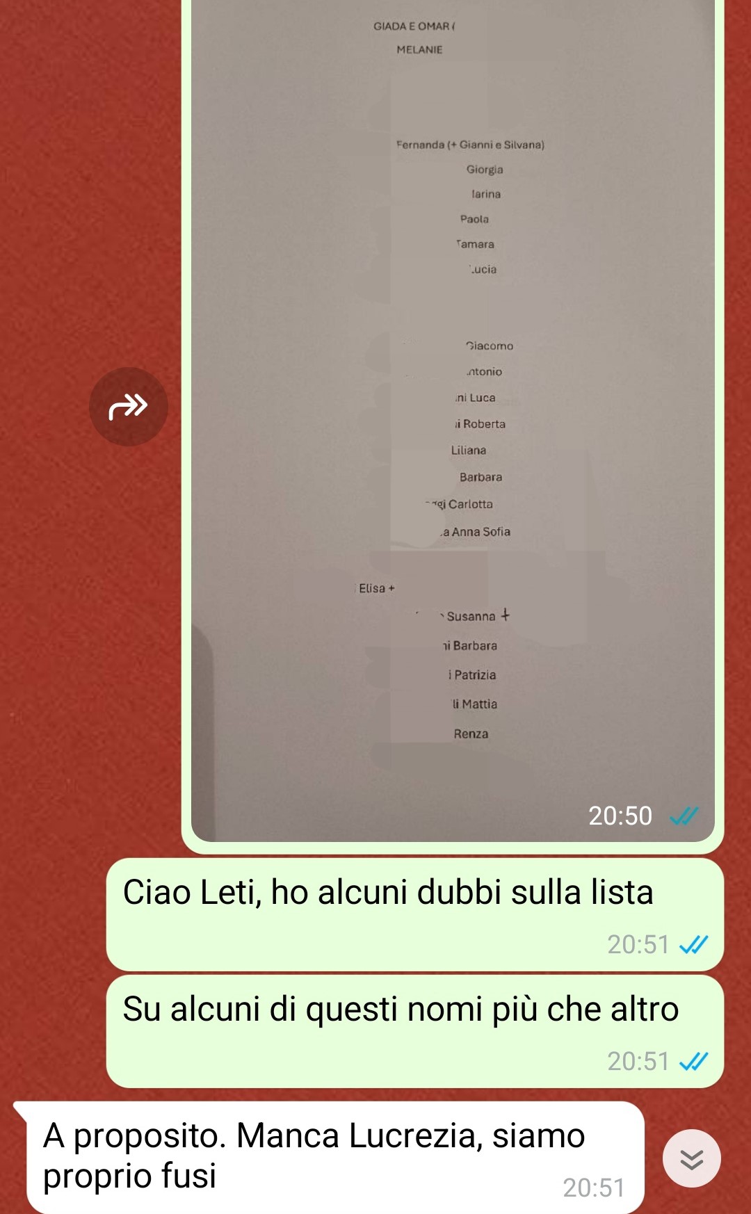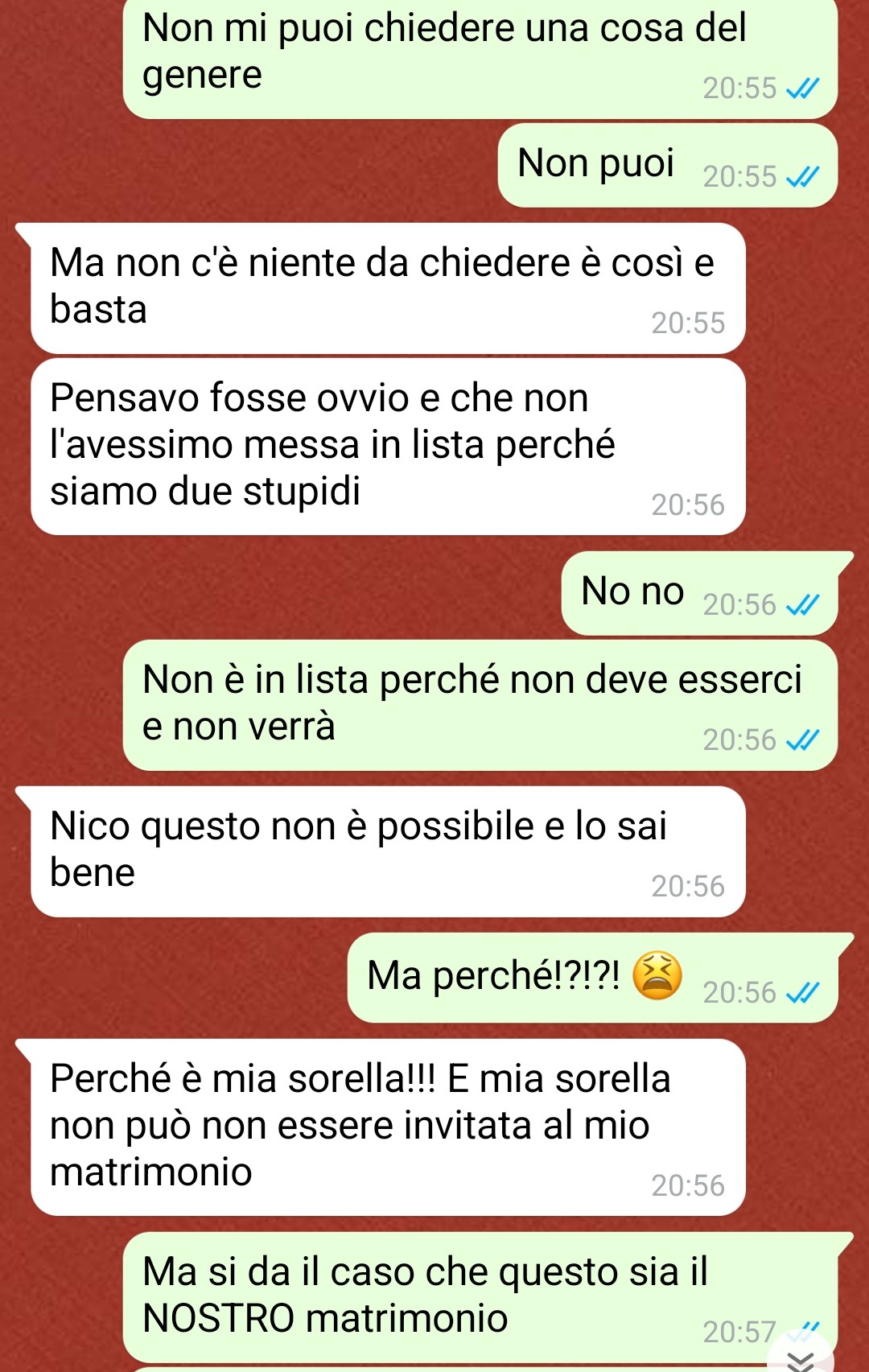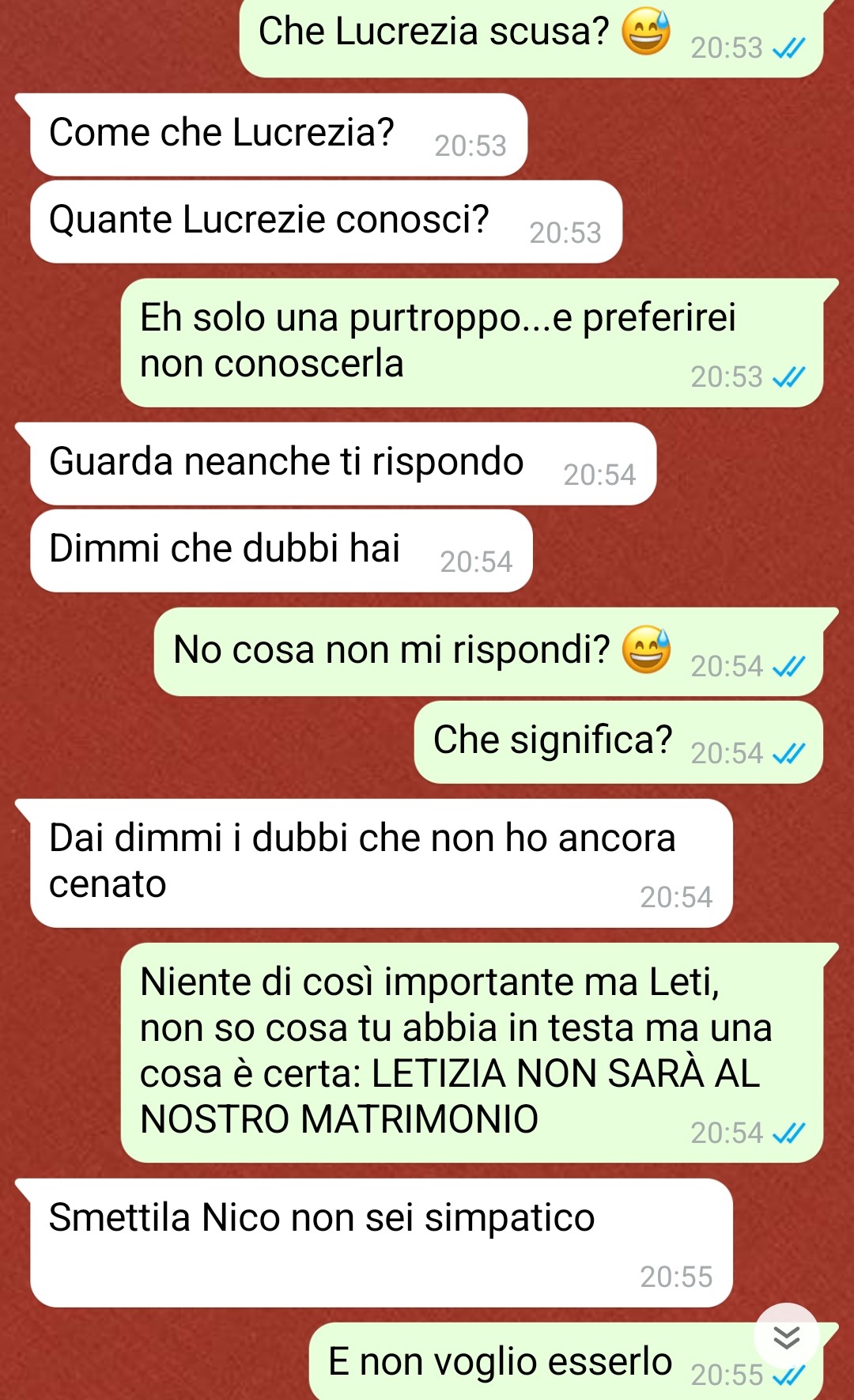 Mi chiamo Nicola e molto presto mi sposerò con Letizia. Lei è sicuramente la donna della mia vita, mi ha aiutato quando avevo veramente bisogno di lei, e anche se ci siamo conosciuti in una situazione alquanto particolare, con il tempo ho imparato ad amarla. Quando ci siamo ritrovati a vivere insieme ed entrambi con un lavoro sicuro mi sono detto: è il momento, la devi sposare. Le ho fatto la proposta e lei ha detto sì. Da quel momento in avanti abbiamo cominciato ad organizzare il matrimonio, dalla location, alla data, al pranzo, passando ovviamente per gli invitati. Purtroppo i costi medi di un matrimonio si sono alzati moltissimo e se cinquanta anni fa si poteva invitare veramente chiunque, adesso, se non si è ricchi e noi non lo siamo, bisogna fare delle scelte. Quindi abbiamo buttato giù una lista e per giorni abbiamo aggiunto e tolto invitati. L’altra sera le scrivo per chiarirmi alcuni ultimi dubbi e lei mi fa notare che in lista manca Lucrezia, una persona purtroppo molto vicina ad entrambi. Ma Lucrezia non mancava per una dimenticanza, io non la volevo e non la voglio al mio matrimonio: da lì è iniziato il caos.
