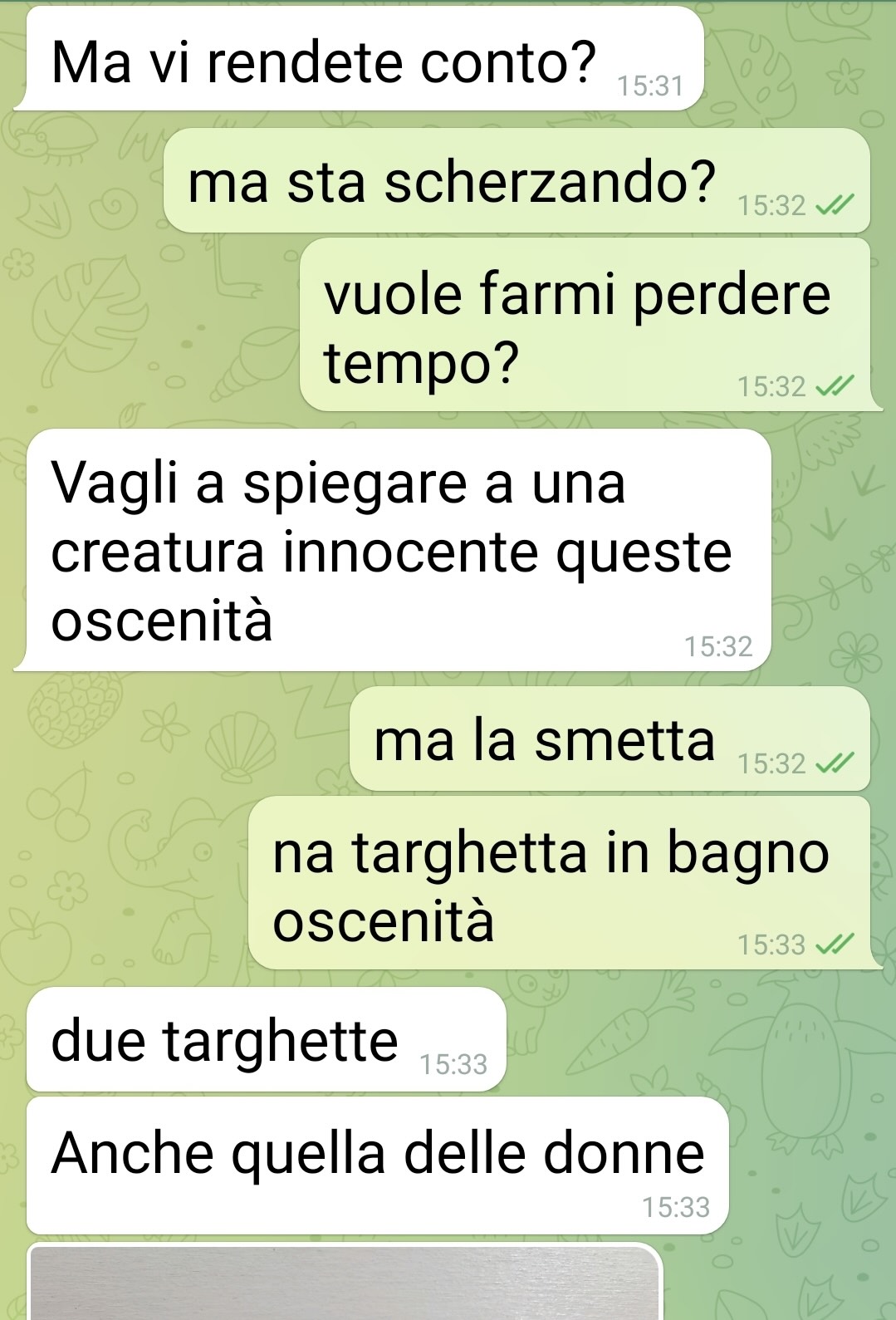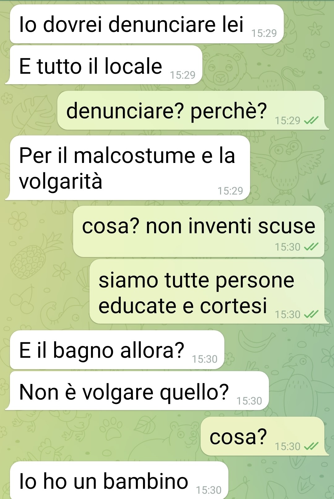 Il nostro fan racconta un episodio avvenuto nel suo locale, un ristopub di cui è proprietario. Spiega che una cliente se n’è andata senza pagare il conto e che l’accaduto lo ha lasciato particolarmente colpito, soprattutto per ciò che è successo successivamente. L’amico si presenta come Giancarlo e decide di condividere gli screen della conversazione avuta con la donna, con l’intento di mostrare il tipo di situazioni che, a volte, possono capitare a chi lavora a contatto con il pubblico.