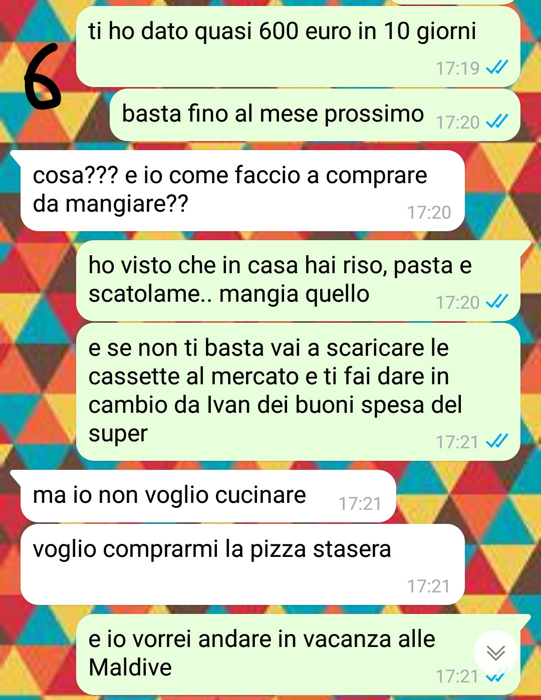 Silvana condivide la sua frustrazione riguardo alla situazione familiare difficile con suo fratello maggiore. Descrive suo fratello come una persona completamente inattiva e dipendente economicamente dalla famiglia. Non solo si rifiuta di cercare lavoro, ma non contribuisce nemmeno alle cure e alle necessità della loro madre anziana. Il fratello di Silvana vive in un appartamento di proprietà della loro defunta nonna, e tutte le spese di vita quotidiana, incluse le utenze e l’internet, sono coperte dalla madre. Silvana, dal canto suo, si occupa di fornirgli denaro per le spese personali come cibo e sigarette.