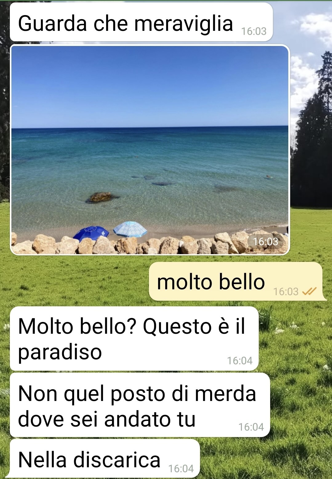 Il mio vicino di casa mi ha scritto mentre entrambi siamo in villeggiatura. Solo che lui è convinto di stare molto meglio di me. Ho resistito finché ho potuto ma alla fine sono esploso. Io sono Biagio amici di spunte blu, e da 5 mesi ho comprato casa, una villetta a schiera in un paesino del centro Italia. Tutto perfetto, tutto fantastico, tranne il vicino di casa! Che se lo avessi conosciuto prima… Si chiama Paolo, e con sua moglie Jolanda sono le persone più viscide e antipatiche che abbia mai visto. Si presentano come amiconi sempre disponibili ma in realtà non fanno altro che trattare con sufficienza e superiorità. La razza peggiore. Sono 5 mesi che con mia moglie li sopportiamo per amore della pace. Ma che fatica, sempre che rompono e propongono cose…e insultano col sorriso… Finalmente sono andati in ferie, in Sicilia, e Paolo voleva che andassimo insieme! Pazzia! Ho detto che già avevo prenotato da un’altra parte. E oggi mi scrive per denigrare…ho perso il mio savoir faire! Finalmente!