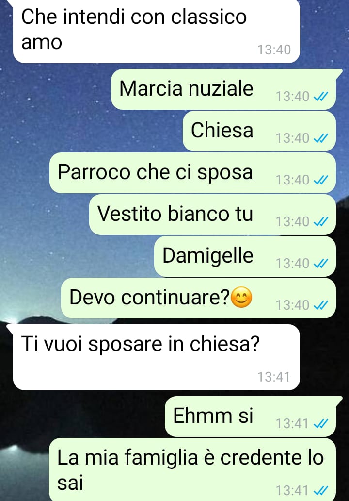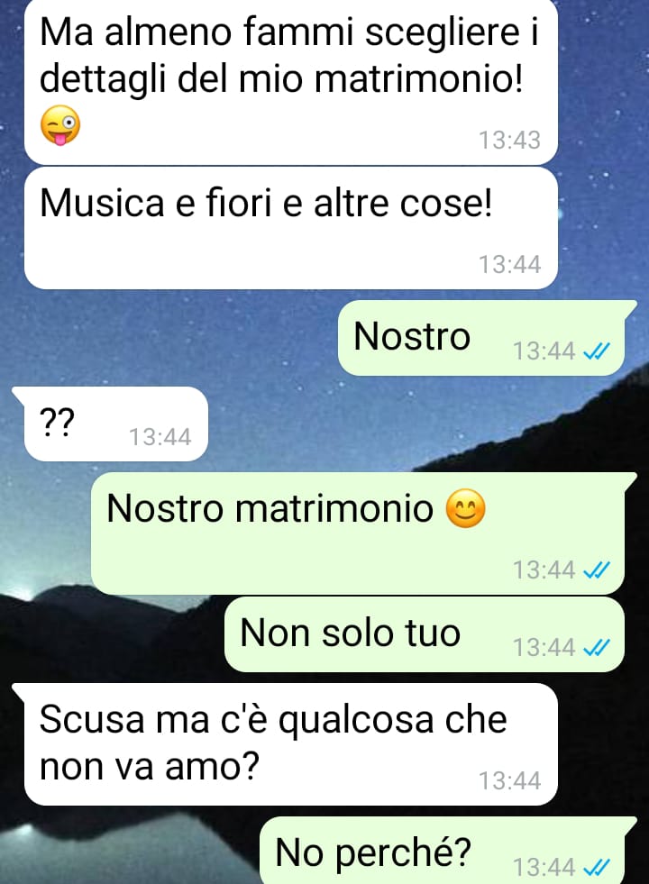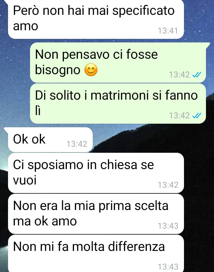 mi chiamo Andrea e ho litigato con la mia fidanzata. Ormai non mi parla da qualche giorno e non so più come convincerla a ripensare alla sua scelta, presa ovviamente senza consapevolezza in un momento di rabbia. Questo lo premetto subito perché dalla chat è piuttosto chiaro che non sta dalla parte della ragione, perché non si reagisce così per una cosa così stupida. Una cosa che ho capito da questa faccenda è che, come prevedibile, sono sempre le donne a voler decidere tutto su questo tipo di eventi, come il matrimonio. Tutto è partito quando mi ha chiesto di usare una canzone diversa dalla classica marcia nuziale per il nostro matrimonio, dopo averle fatto una bellissima proposta romantica circa tre settimane fa. Io credo che sia diritto anche degli uomini avere la possibilità di rispettare il matrimonio che si è sempre sognato e non solo delle donne, ma questo lei non lo vuole proprio capire e adesso nemmeno mi rivolge più la parola. Io ho sempre sognato un matrimonio classico e non so come farle capire quanto sia importante per me.