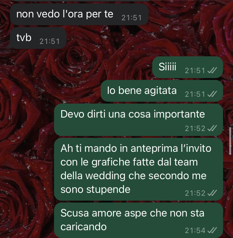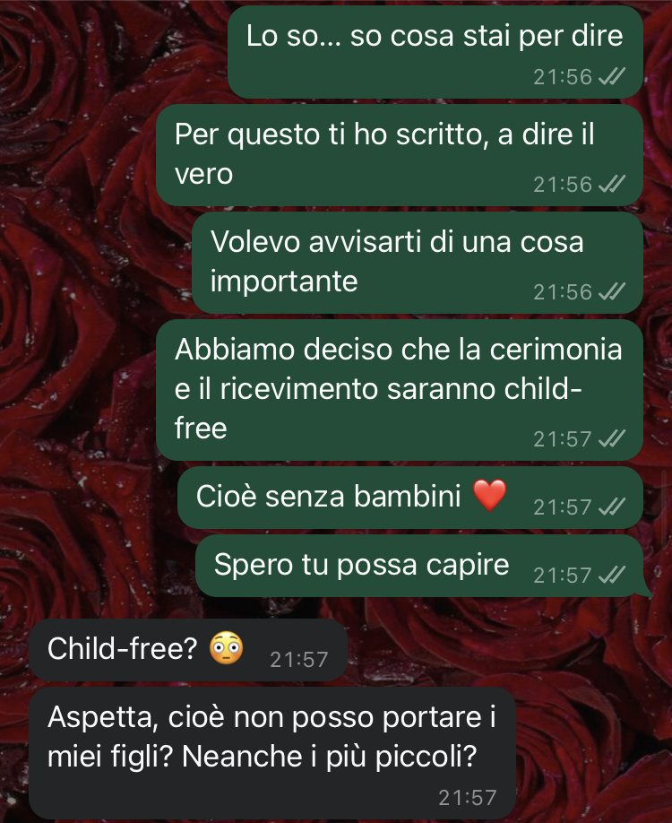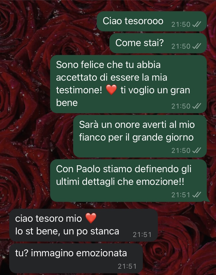 🎉 Io e il mio amore nonché futuro marito ci sposeremo a ottobre, in pieno autunno, e stiamo organizzando ogni dettaglio con tanta emozione. Grazie alla wedding planner stiamo riuscendo a organizzare il nostro giorno speciale in base alle nostre esigenze e aspettative. Non vediamo l’ora di vivere quel giorno con tutte le persone a cui vogliamo bene. Come immaginerete, organizzare un matrimonio è un’avventura piena di scelte difficili. Ecco perché ho deciso di scrivervi: una decisione che abbiamo preso (anche in accordo alla nostra wedding planner) ha scatenato una reazione… diciamo, inaspettata. Abbiamo ricevuto tante critiche da amici e parenti, la mia migliore amica e testimone ha reagito proprio male. Non pensavo che una cosa così semplice potesse diventare un motivo di discussione così accesa, ma è successo… e voglio condividere con voi la nostra chat. Voi cosa ne pensate? Negli Stati Uniti e in Canada so che ormai i matrimoni sono tutti così, forse dovremmo diventare più moderni anche noi. È proprio vero che a volte organizzare il matrimonio dei tuoi sogni significa andare contro le aspettative degli altri… ma i compromessi sul grande giorno anche no. È giusto che ognuno per quel giorno si adatti alle esigenze degli sposi! Aspetto i vostri consigli per decidere se trovare un’altra testimone last minute perché non so proprio come fare…