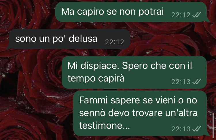 Aurora condivide di voler sottoporre la conversazione avuta con la testimone alla community di Commenti Memorabili per ricevere opinioni. La follower fa riferimento al fatto che negli Stati Uniti e in Canada matrimoni di questo tipo sono ormai la normalità, suggerendo che forse anche in Italia si dovrebbe diventare più moderni. L’amica si trova ora in difficoltà, considerando addirittura la possibilità di cambiare testimone all’ultimo momento, e chiede consigli alla community per decidere come procedere in questa situazione delicata.