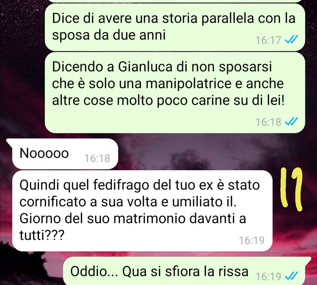 Due anni fa, però, si sono ritrovati per motivi di lavoro. La nostra amica sottolinea di avergli voluto davvero bene, mentre non è certa dei sentimenti che lui abbia provato nei suoi confronti. Nel frattempo, Gianluca si era rifidanzato e, quest’anno, ha chiesto alla nuova compagna di sposarlo.