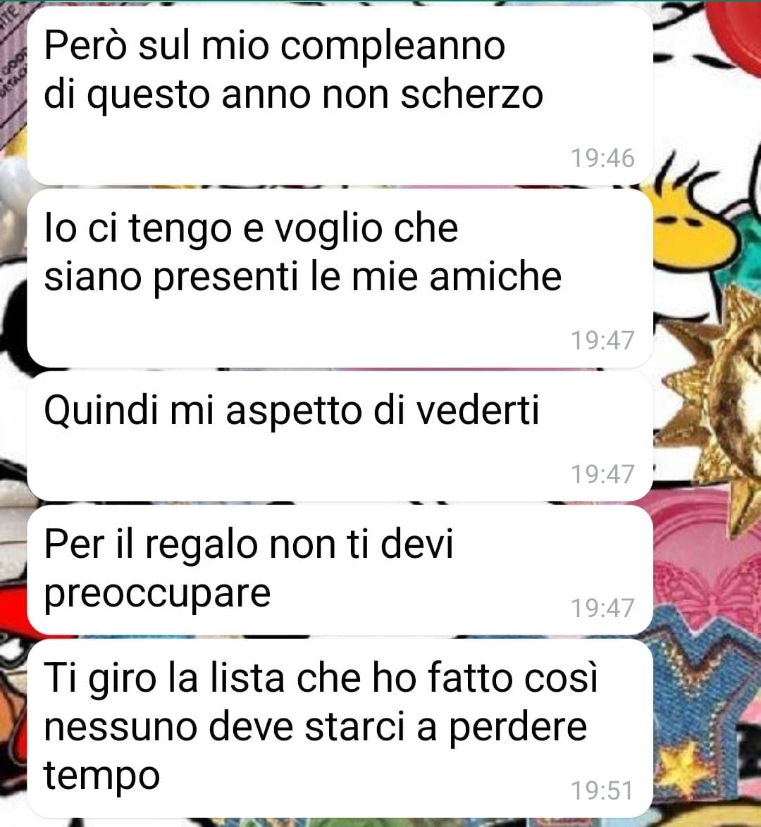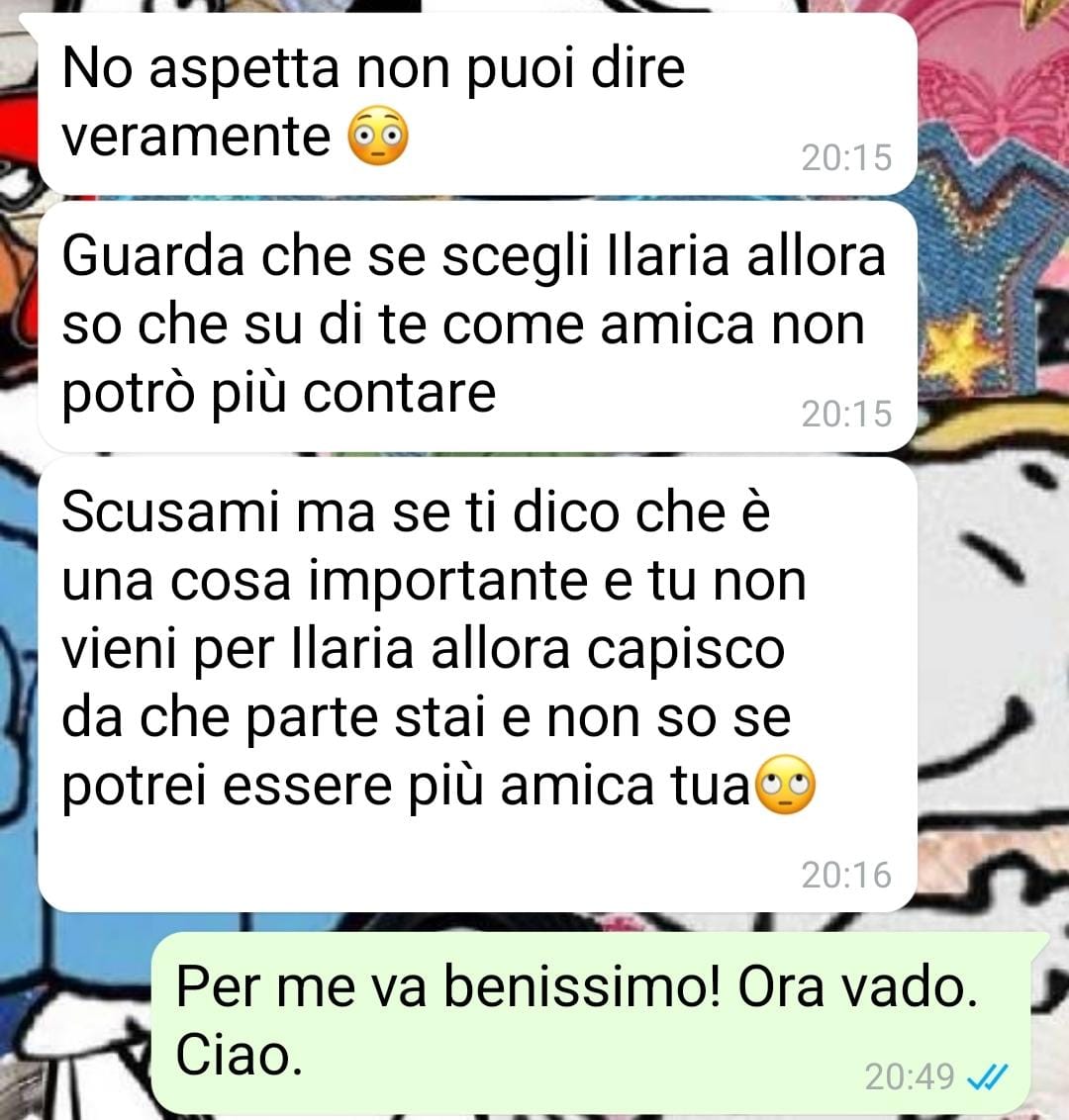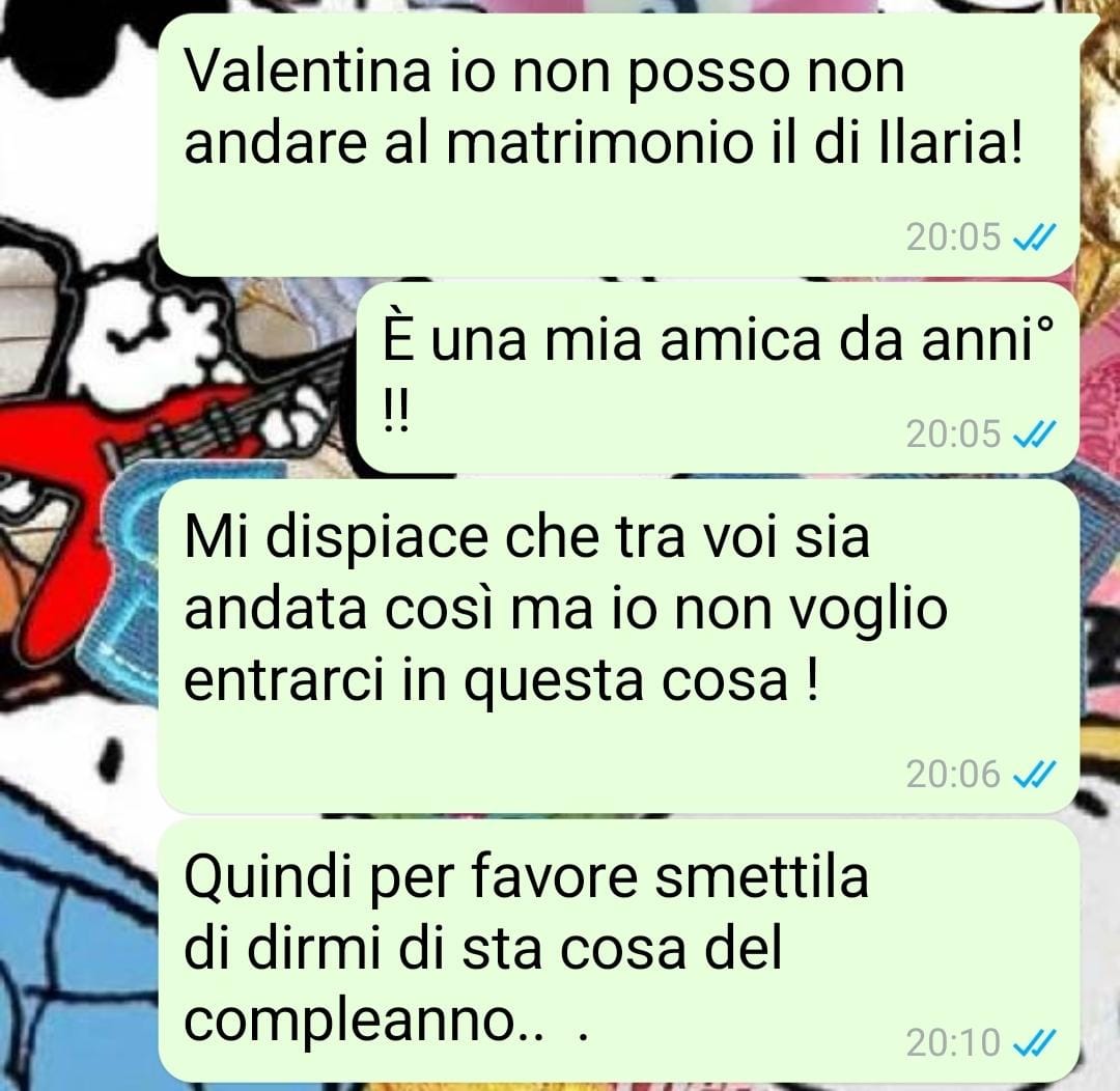 Diversa è invece la situazione con Valentina. Descritta come una persona ancora legata a un certo atteggiamento “capriccioso”, sembra non aver mai abbandonato la convinzione che le persone intorno a lei le debbano qualcosa. Anche da adulte, le aspettative di Valentina verso le amiche sono rimaste alte, se non pretenziose. La nostra amica, pur accorgendosi di queste dinamiche, ha sempre cercato di accettarla per com’è, evitando i conflitti e aspettando che certi atteggiamenti si attenuassero da soli.