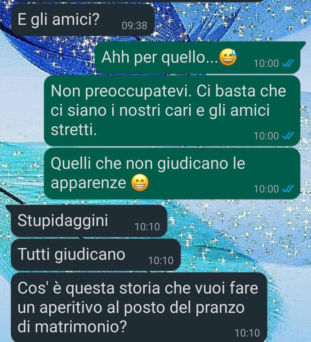 Io e Giorgio abbiamo deciso di sposarci.E non è il momento migliore, perché è vero che lui ha una buona situazione lavorativa, ma la piccola azienda per cui lavoravo io è fallita due anni fa, lasciandomi alla precarietà di contratti a tempo determinato.Abbiamo nel frattempo comprato casa, e tra anticipo e lavori di ristrutturazione abbiamo speso molto. Ma siamo orgogliosi di avercela fatta solo con le nostre forze. Non vogliamo chiedere nulla ai genitori, i miei perché tanto non se lo potrebbero permettere. I suoi perché.. be’, qualcosa mi dice che capirete, leggendo la chat che vi ho mandato, il perché è meglio non avere troppo a che fare con sua mamma Gabriella.Si erano riavvicinati un po’, lei sta facendo qualche lavoro su se stessa pare, ed era effettivamente un po’ migliorata. Però con la storia del matrimonio non so cosa sia successo. Sembra che abbia riattivato alcuni suoi comportamenti e modi di fare, davvero terribili.Pensate che a causa di questo motivo non si erano parlati per anni, questo ancora prima che noi ci mettessimo insieme. Comunque io voglio pensare a noi, quel giorno sarà nostro e voglio che lo gestiamo a modo nostro. Non abbiamo il dovere di impressionare nessuno…