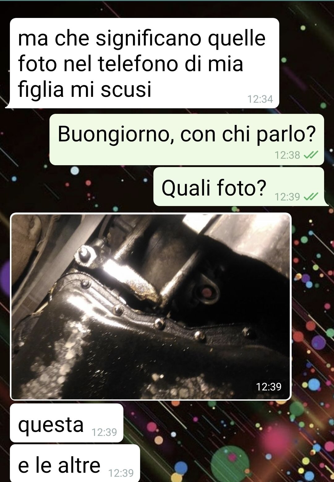 “A volte sogno di cambiare lavoro e diventare un guardiano notturno del cimitero, per non avere niente a che fare con la gente. Faccio di professione il meccanico da ormai 20 anni e di clienti strani, fastidiosi, sospettosi e insopportabili ne ho trovato in abbondanza. Ma la conversazione che ho avuto il (dis)piacere di fare ieri, cari amici di Spunte, le batte tutte, e merita la vostra attenzione. Non vi anticipo niente, voglio che anche voi proviate quel senso straniante che ho provato io mentre leggevo e rispondevo. Vi dico solo come si è giunti a questa chat. Ieri mattina una ragazza (bella e giovane per carità, niente da dire) viene in officina lamentando una perdita di olio dalla macchina. Il motore è tutto sporco e unto e le suggerisco di far lavare prima il motore per individuare meglio le perdite. La ragazza esegue, mi riporta l’auto pulita, io controllo e le dico il problema. Se ne va dicendo che ne parlerà a casa. Un’ora dopo mi ritrovo protagonista degli screen che vi ho allegato.”