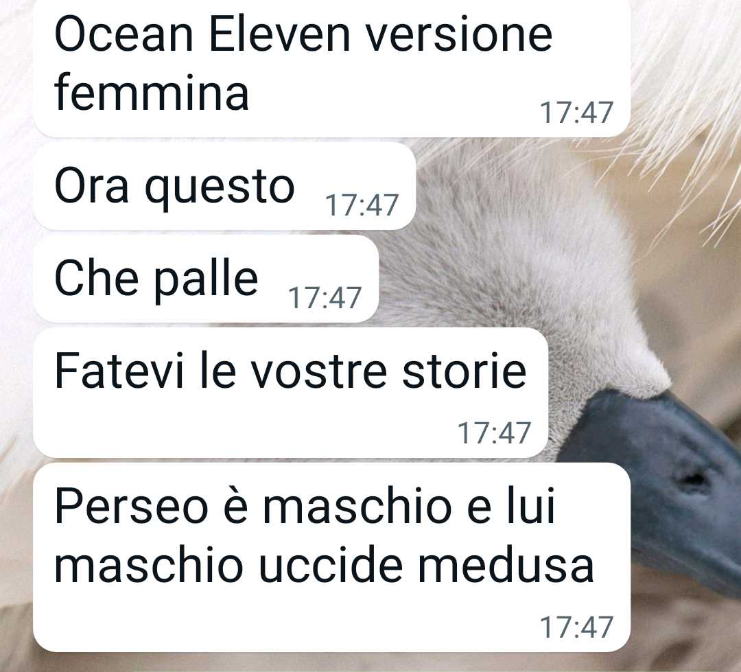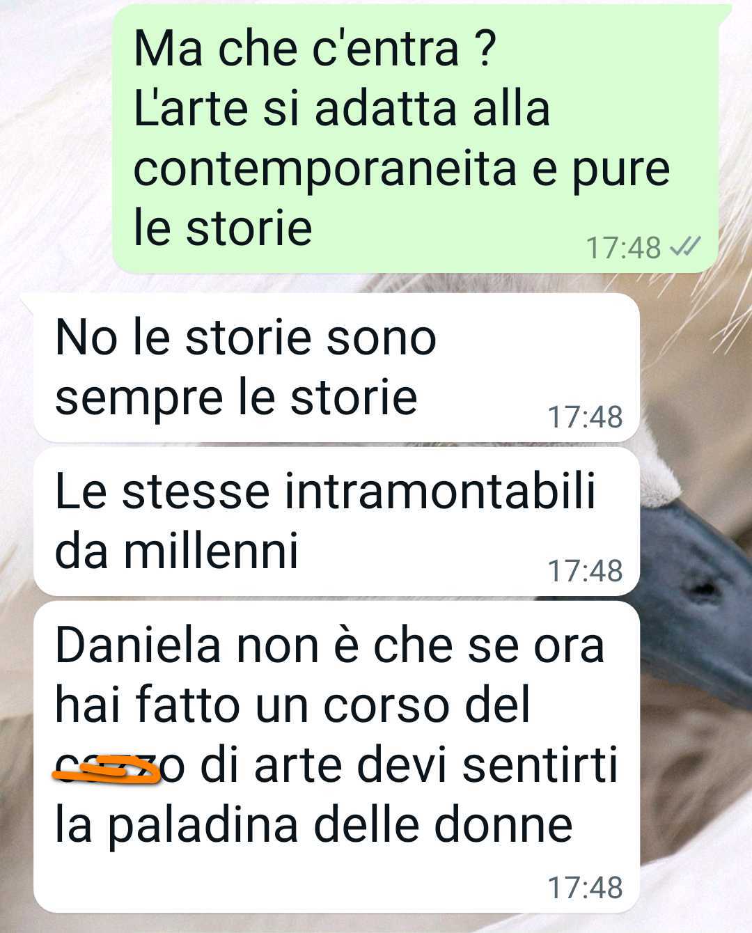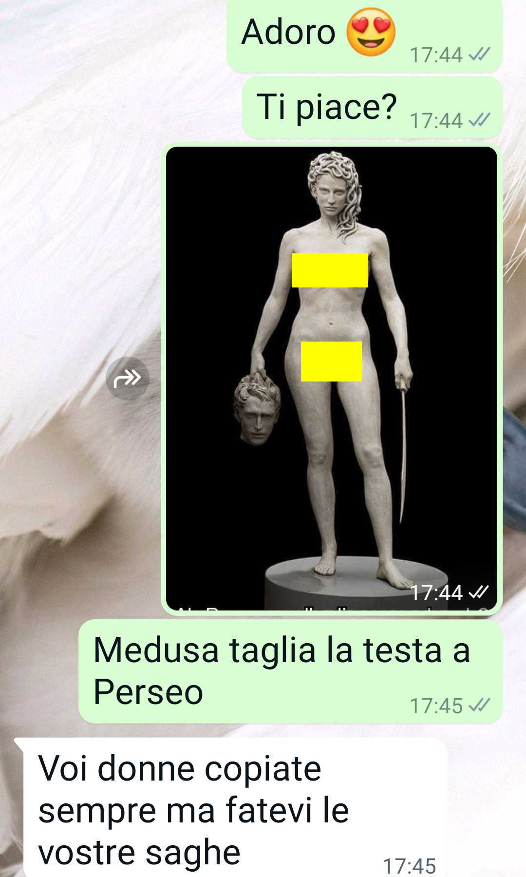 Mio marito non mi fa sentire sminuita. Ho condiviso con lui una bella opera d’arte contemporanea. Ecco quello che mi ha detto. Sono un’appassionata di arte e dopo tanto tempo mi sono regalata un corso su questa materia. Lo desideravo tanto. Durante le lezioni, il prof ci ha fatto vedere l’immagine di questa splendida opera che raffigura Medusa che taglia la testa di Perseo. È un ribaltamento del mito classico. Ma con una differenza. Nella rappresentazione classica Perseo è trionfante e festoso dopo avere tagliato la testa della Gorgone. Medusa è invece risoluta ma non festosa. Si capisce che il suo è un atto di difesa. Non ha avuto il piacere di tagliare la testa di Perseo, ma lo ha fatto perché quello la voleva uccidere. Ha dovuto sguainare la spada per difendersi. è una grande fonte di ispirazione per me. Credo che di fonte di ispirazione ne servano tante per noi donne. Abituate a storie di sottomissione, di sopportazione, di resa. La sento ancora questa resa, nelle canzoni di Sanremo, nei titoli dei libri, nei giornali etc. Voglio che nessuna donna si sminuisca più e che sia pronta ad alzare la testa e a rispondere. Servirà di ispirazione anche per la mia vita di moglie con un marito troglodita??