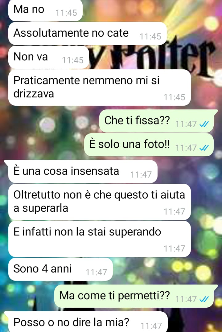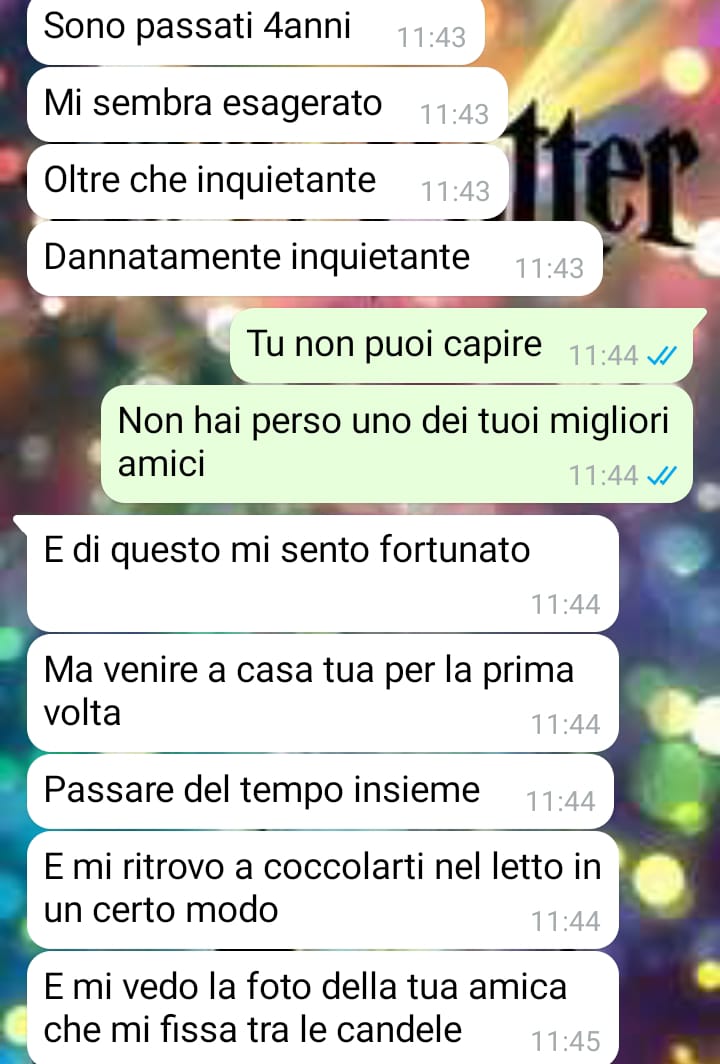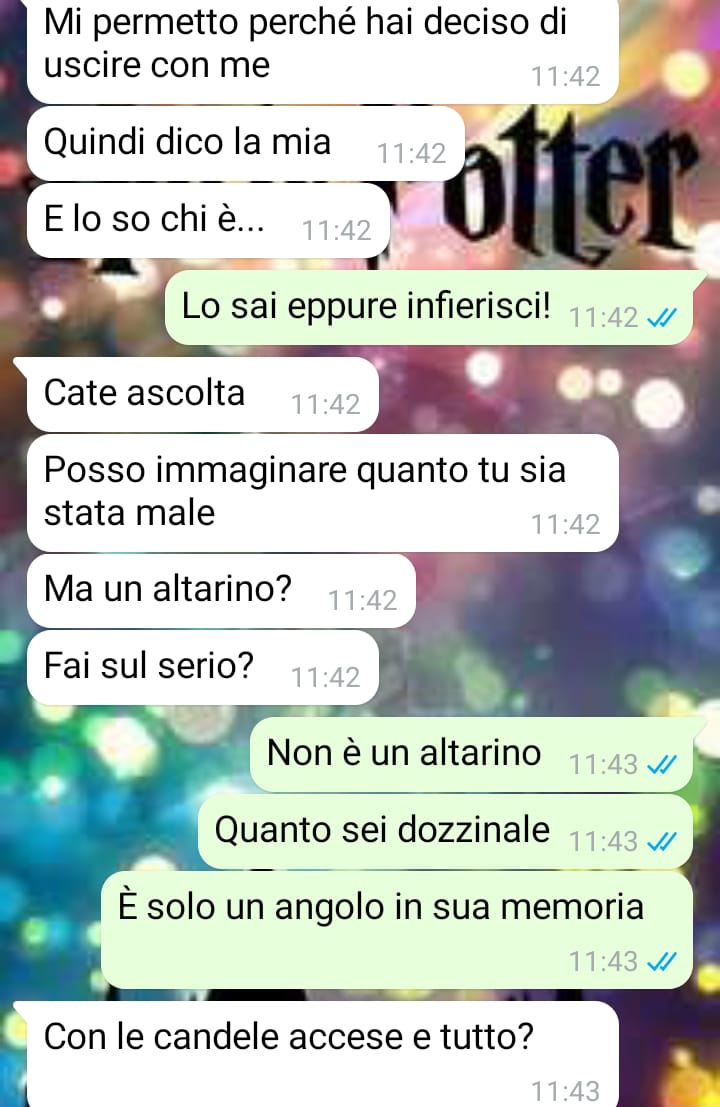 Caterina ha deciso di condividere una chat avuta con l’ultimo ragazzo con cui si è frequentata. Non è sicura se la loro relazione sia finita, perché lui l’ha lasciata dicendo di voler riflettere e da quel momento è sparito. Caterina vuole far leggere il motivo per cui Gianluca ha deciso di allontanarsi da lei da un giorno all’altro. Gianluca e Caterina si conoscevano di vista, essendo dello stesso paese, ma si sono presentati ufficialmente a una serata quattro mesi fa e da lì hanno iniziato a uscire insieme. Erano una coppia a tutti gli effetti, anche se da poco tempo. Domenica scorsa, Caterina ha deciso di invitarlo a casa sua per la prima volta, sperando di passare una serata interessante.