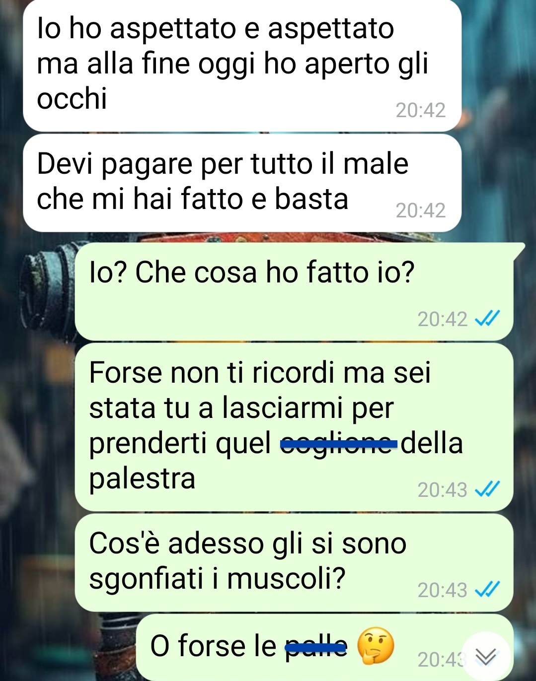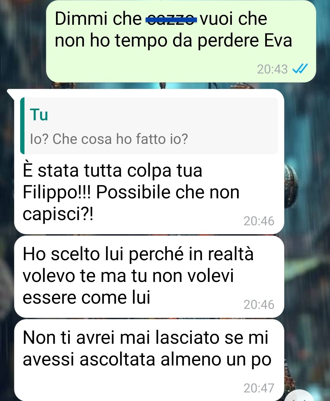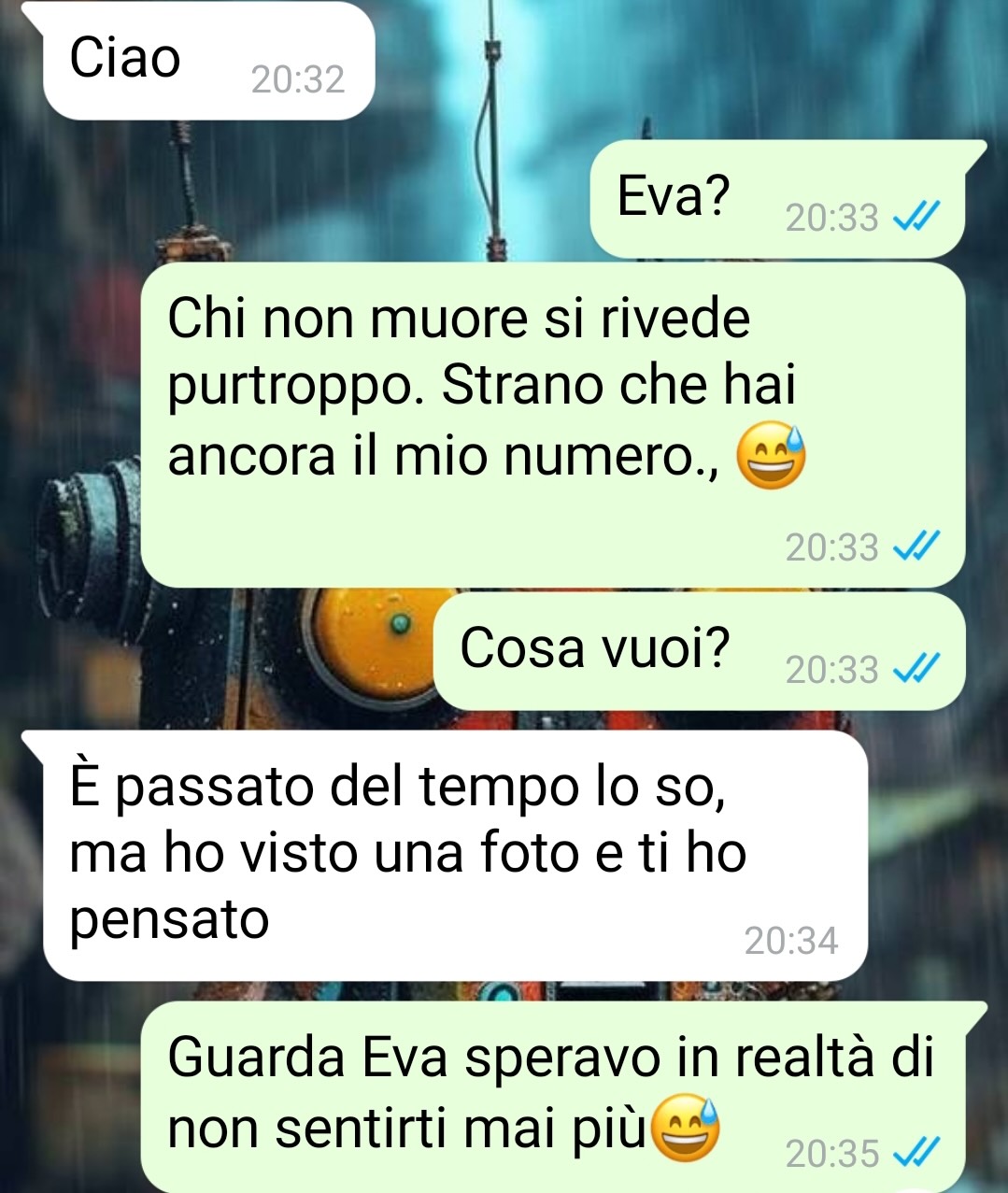 Sono Filippo. Vi sto scrivendo ma vi giuro che sono ancora sotto shock per la conversazione che ho avuto qualche giorno fa con Eva, la mia ex fidanzata . Io e lei siamo stati insieme per qualche mese e ci siamo lasciati un anno fa. Quindi già che è passato un anno, io non mi aspetto di certo che mi riscrivi, ma va bene così, già qui un primo campanello d’allarme si è palesato. Ma non vi dico nient’altro su come è andata avanti la conversazione perché punto primo voglio che lo scopriate man mano e punto secondo, ragazzi, credetemi sono imbarazzato io per lei. Lei è sempre stata una ragazza molto carina, attenta al fisico e all’aspetto esteriore, io un po’ meno, lo ammetto, ma onestamente non ci ho dato mai molto peso. L’importante è stare bene con se stessi, no? A quanto pare no. Ma questa cosa si vede che ha influito molto sul nostro rapporto ed è successo quello che è successo. Però, dopo questa conversazione, sono ancora più convinto che ogni tanto ci voglia anche altro per stare bene con se stessi anche a livello mentale.