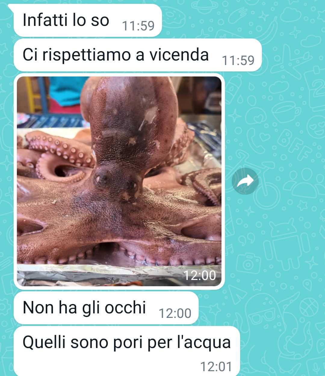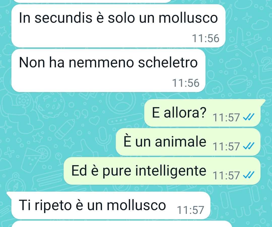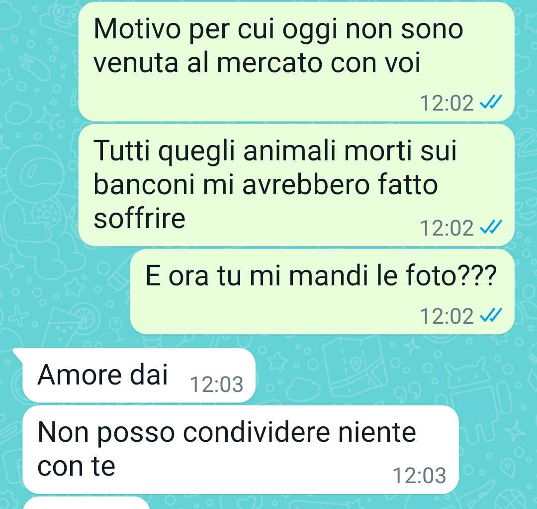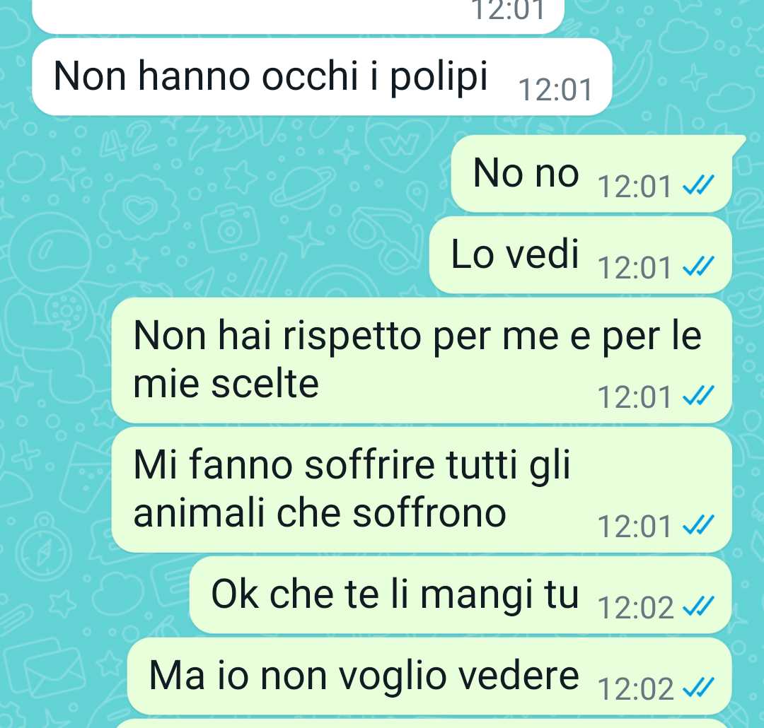 La nostra fan racconta di aver appena lasciato il suo ragazzo, il quale si apprestava a mangiare del polpo, con un tono di dispiacere. Spiega che il suo ragazzo era andato al mercato con degli amici, mentre lei aveva deciso di restare a casa, in quanto trova insopportabile la vista degli animali morti sui banconi, pronti per essere consumati. La nostra follower è vegetariana per motivi etici, poiché la sofferenza degli animali le provoca grande dolore. Nonostante ciò, ci tiene a precisare che non impone le sue scelte agli altri, sia al suo ragazzo che ai suoi amici, e accetta che le persone intorno a lei mangino carne, pur non condividendo tale abitudine.