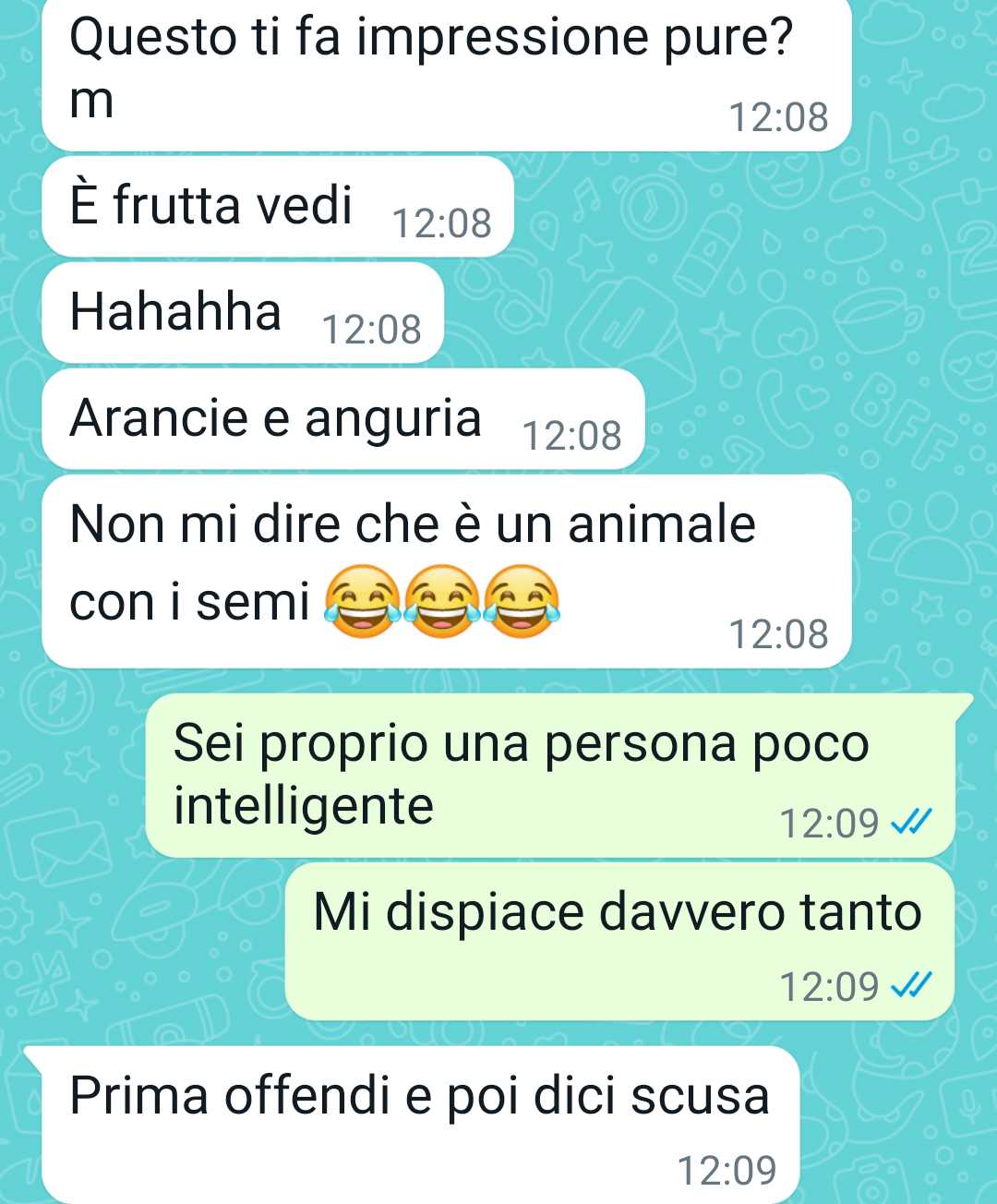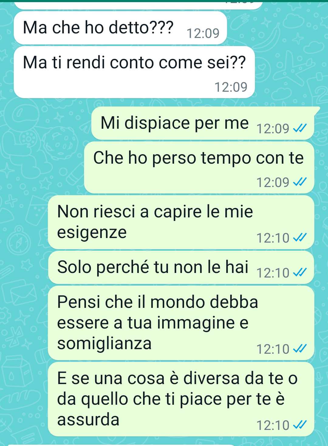 Infine, la nostra fan decide di inviare la conversazione avuta con il suo ragazzo, chiedendo l’opinione di chi segue la pagina. Vorrebbe sapere se la sua reazione e le sue convinzioni siano troppo rigide o se, al contrario, sia il suo ragazzo a comportarsi in modo insensibile verso i suoi sentimenti e il suo stile di vita.