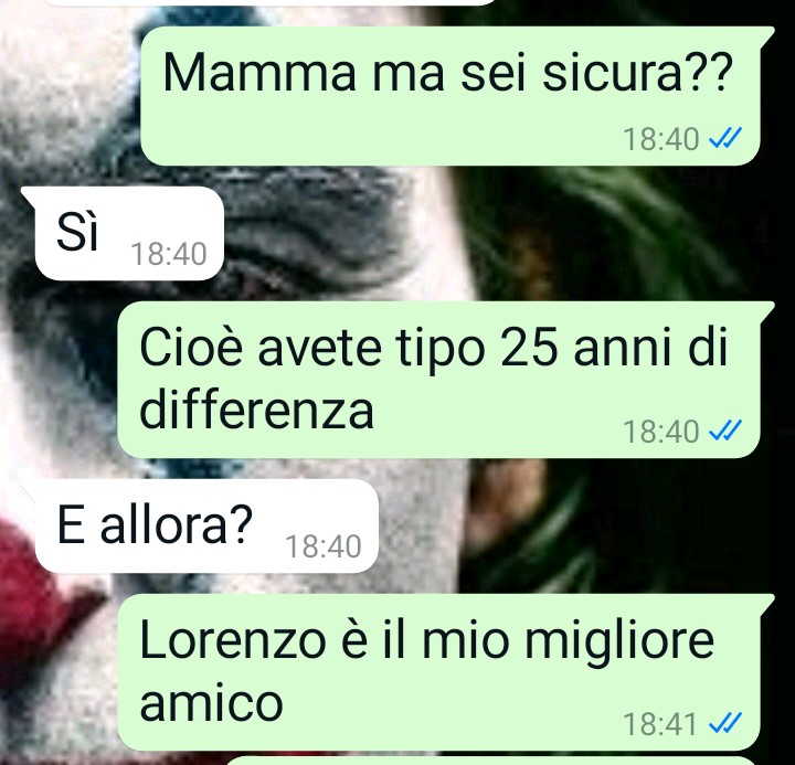 Mia mamma è incinta del mio amico Lorenzo. Ma le sorprese non sono finite qui. Mi sento malissimo. Ho già avuto un attacco di panico da poco. Mia madre è incinta del mio amico. Ma non pensate che io sia uno di quei bigotti che non sopportano che la propria madre sia felice e si rifaccia una vita. Prima di giudicarmi brutalmente vi invito a leggere la chat. Così capite perché sto così male. Vi scrivo per trovare uno sfogo, dato che col mio migliore amico per ovvi motivi non posso parlare. Non so perché lo continuo a chiamare amico. Quell’essere merdoso ha distrutto la mia vita. Io non so cosa fare e cosa pensare. Non so come è possibile essere pugnalato così alle spalle da una persona di cui mi fidavo ciecamente. Ma che merda di persona è?? Non so come comportarmi. Mia madre mi ha rivelato un poco alla volta dei segreti, delle bugie, e delle cose schifose su Lorenzo. Ora mia madre è incinta di quell’animale da monta, di quel pezzo di merda che si è scopato non solo mia madre….