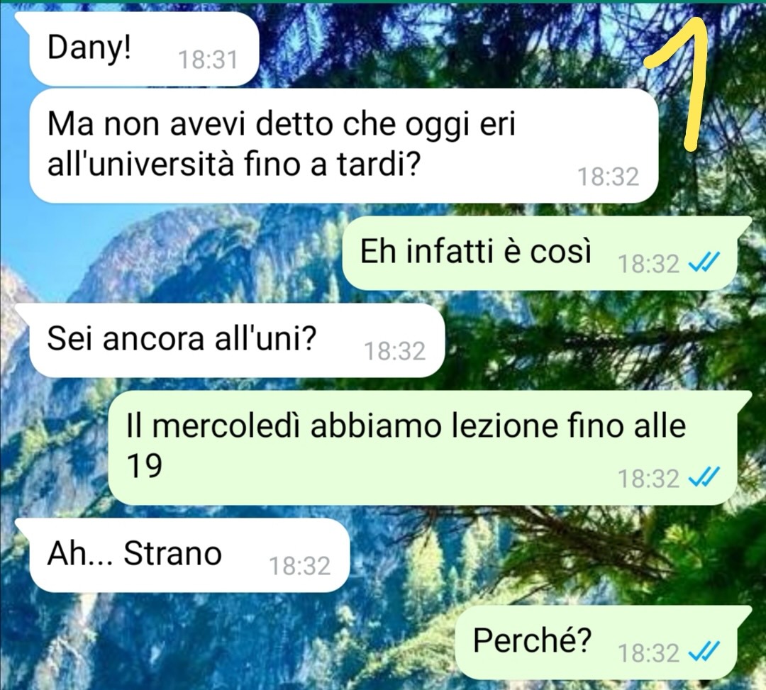 Mi chiamo Daniele e da due anni circa sono fidanzato con Vera. La mia fidanzata ha un problema, che non vi anticipo ma che capirete perfettamente leggendo la chat.E io davvero non so più come fare per arginare questa cosa.L’altro giorno le avevo ricordato che avrei avuto lezione fino a tardi all’università e che non sarei uscito prima delle 19:00. Lei ha sempre questa cosa che deve sapere dove sto e con chi, specie dopo una sciocchezza successa settimane fa che però per lei è diventata una cosa importantissima, e posso assicurare che non lo sia.Come vi dicevo appunto io le avevo detto di essere all’università ma circa mezz’ora prima della fine delle lezioni mi manda un messaggio chiedendomi dove sia.Già lì comincio a insospettirmi, capisco che ci sia qualcosa che non va…E quando le chiedo il perché, ecco che mi risponde come leggerete all’inizio dei messaggi.Capisco che ci risiamo, siamo ricaduti nel problema…ma questa volta la cosa si fa un po’ più seria e io sento che è arrivato il momento di metterla di fronte alla realtà…
