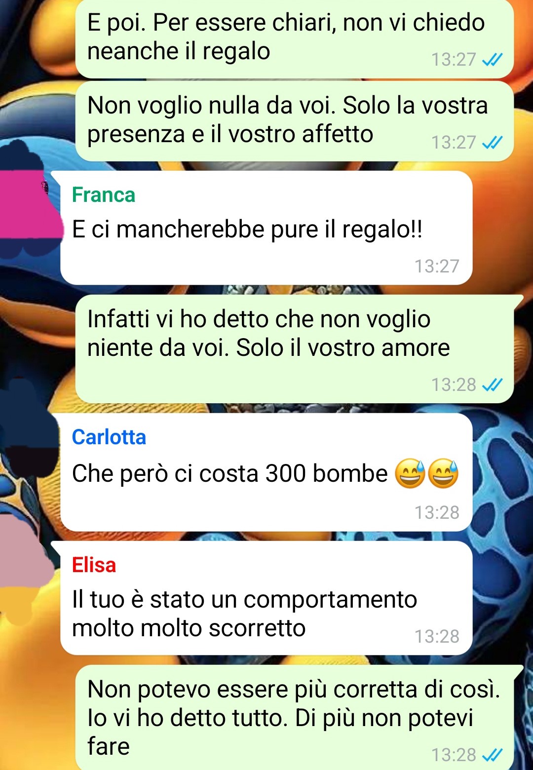 Secondo quanto riferisce la nostra amica, la reazione ricevuta nel gruppo è stata del tutto inaspettata. Quello che doveva essere uno scambio affettuoso si è trasformato in qualcosa che l’ha profondamente ferita. Non entra nei particolari, ma lascia intendere che le risposte abbiano messo in discussione non solo l’organizzazione dell’evento, ma anche il rapporto di amicizia costruito negli anni.