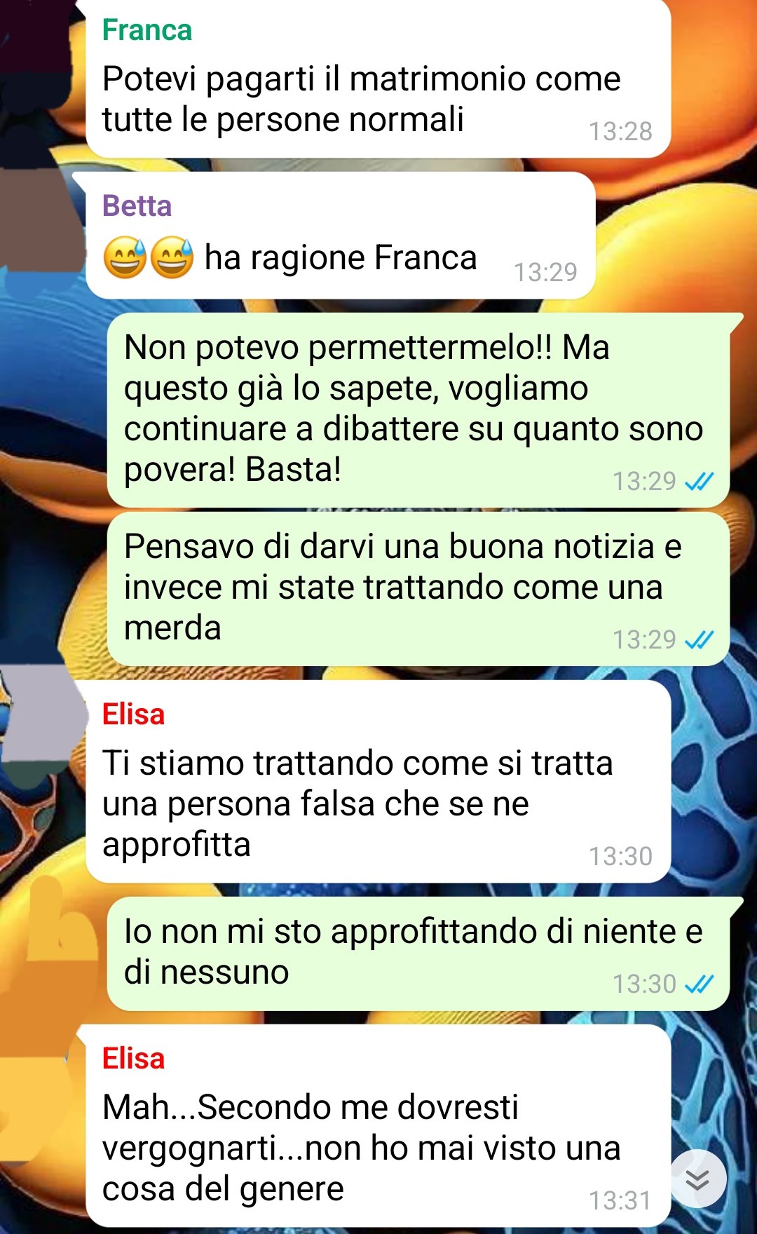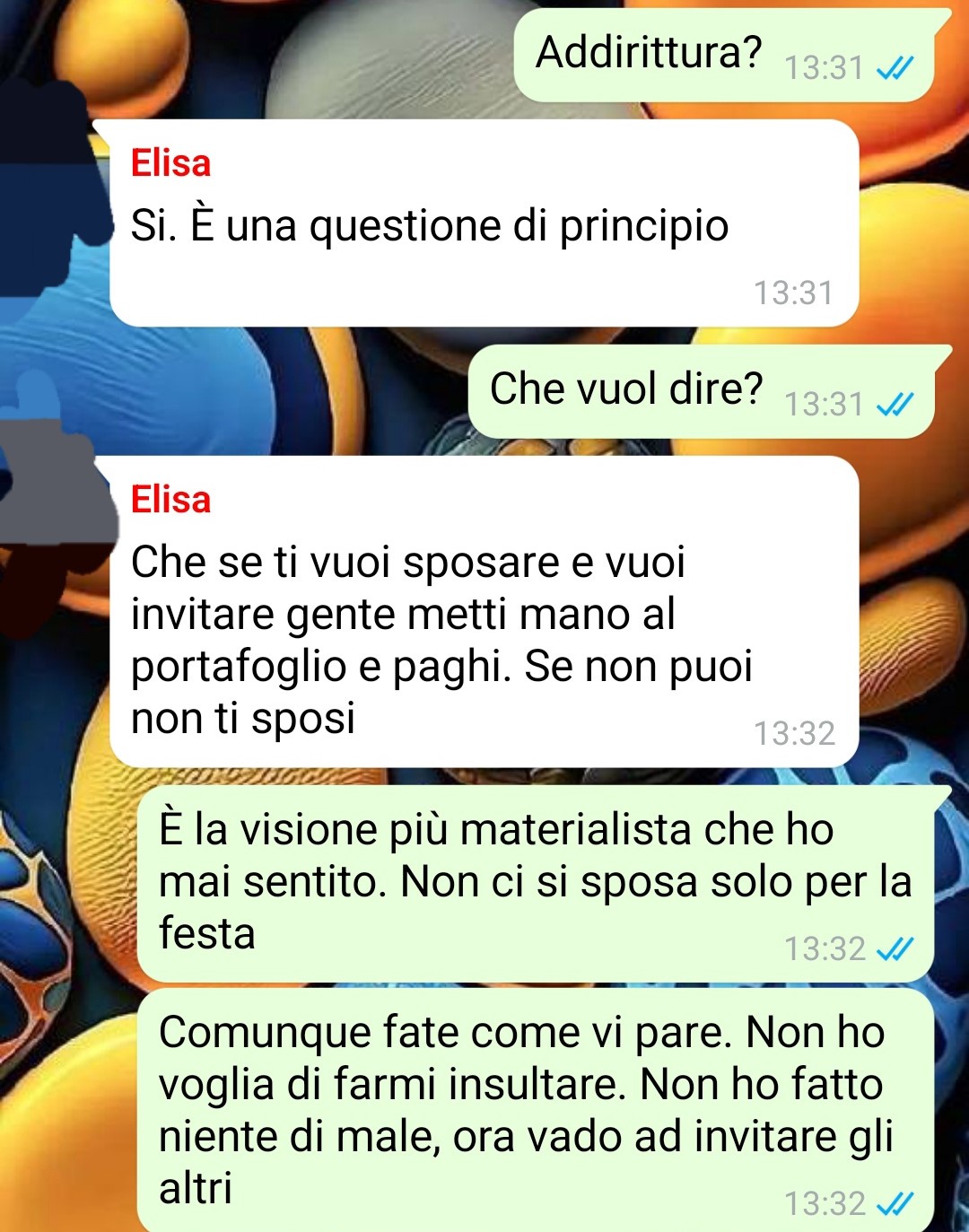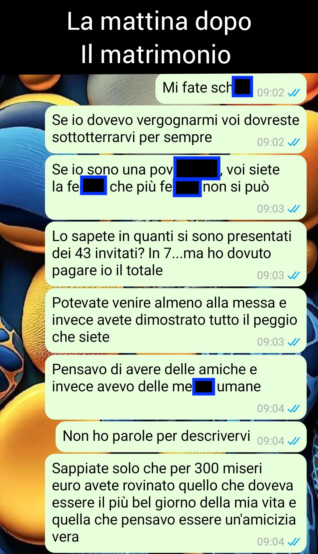 La nostra follower riflette sul fatto che, forse, con il senno di poi, sia stato meglio scoprire certe dinamiche prima del matrimonio piuttosto che dopo. Tuttavia, il senso di tradimento resta forte. La chat che ha deciso di condividere documenta proprio quel momento in cui, cercando sostegno e complicità, si è trovata invece davanti a parole che hanno fatto crollare molte certezze.