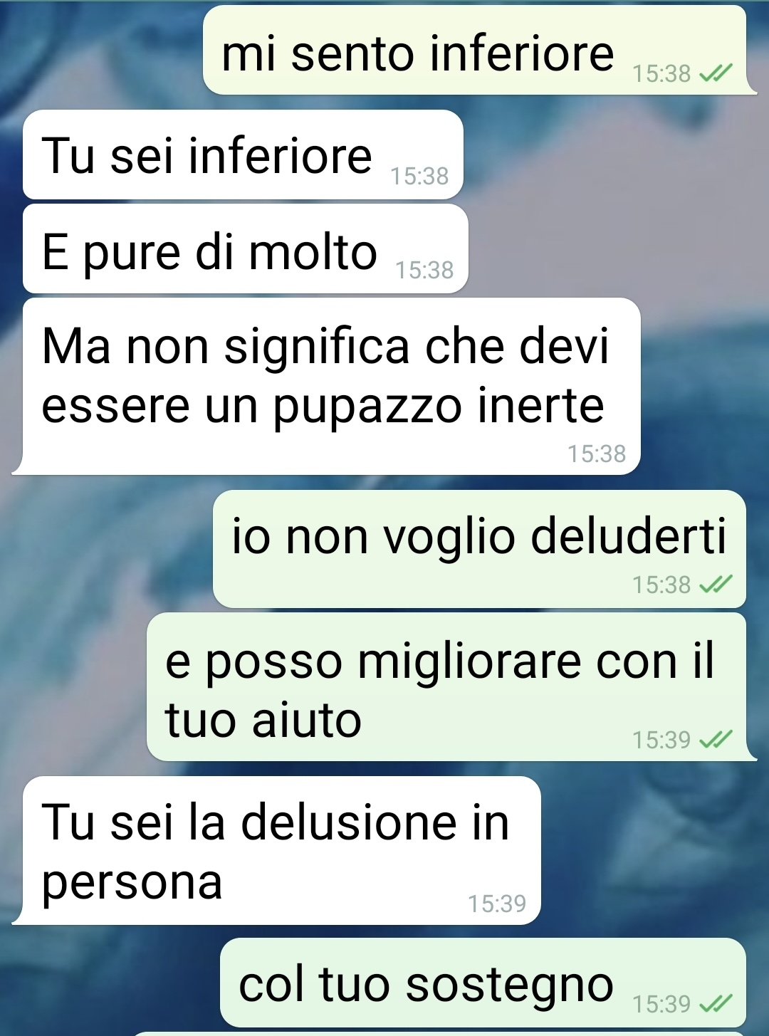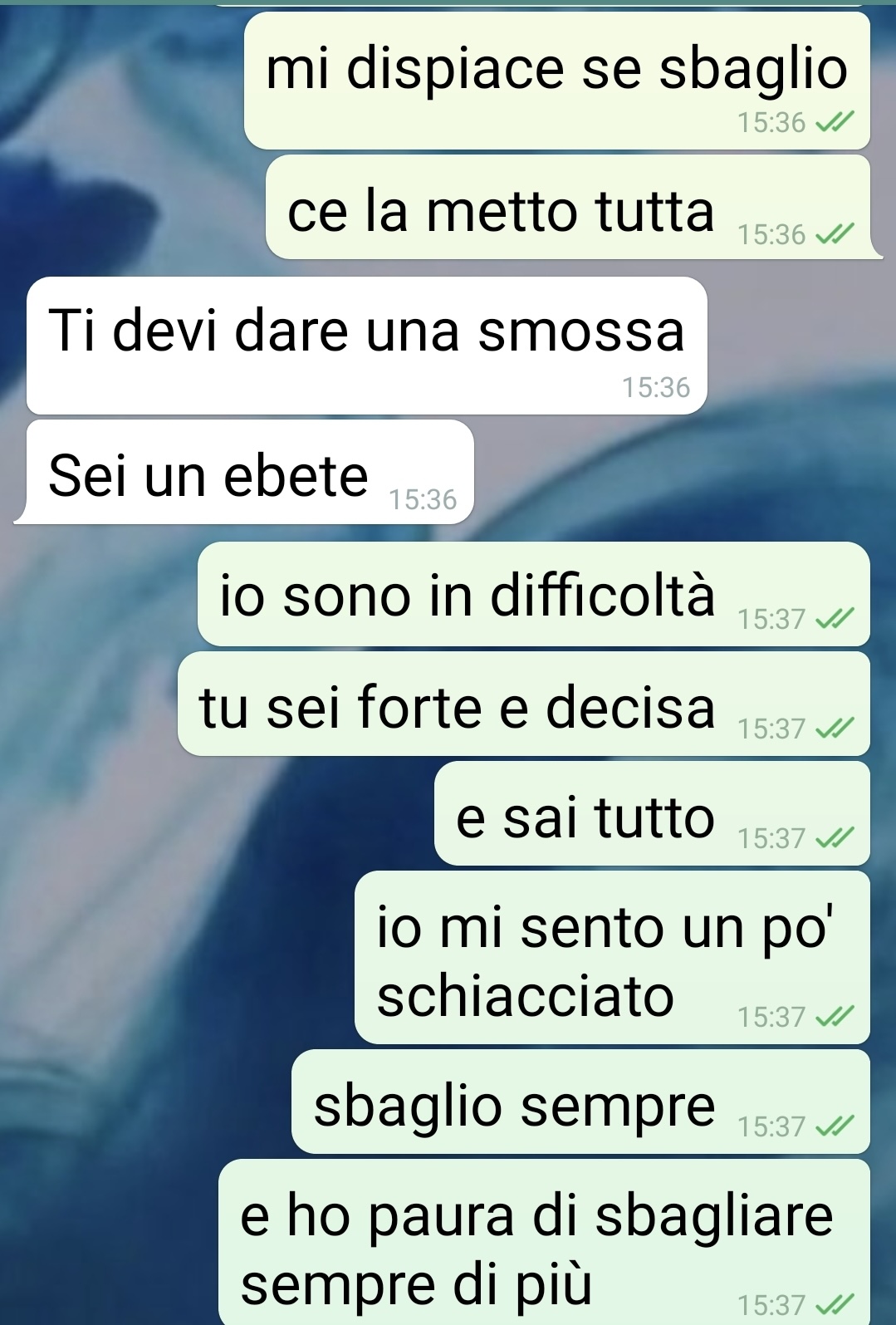 Spiega di impegnarsi sinceramente per migliorare, ma ammette che la paura di sbagliare lo blocca. Più si sente sotto pressione, più diventa insicuro, fino quasi a non riuscire a muoversi. Dice che la compagna non lo tratta male, ma che il suo atteggiamento deciso lo fa sentire ancora più piccolo, come se non riuscisse mai a raggiungere il livello che lei si aspetta da lui.