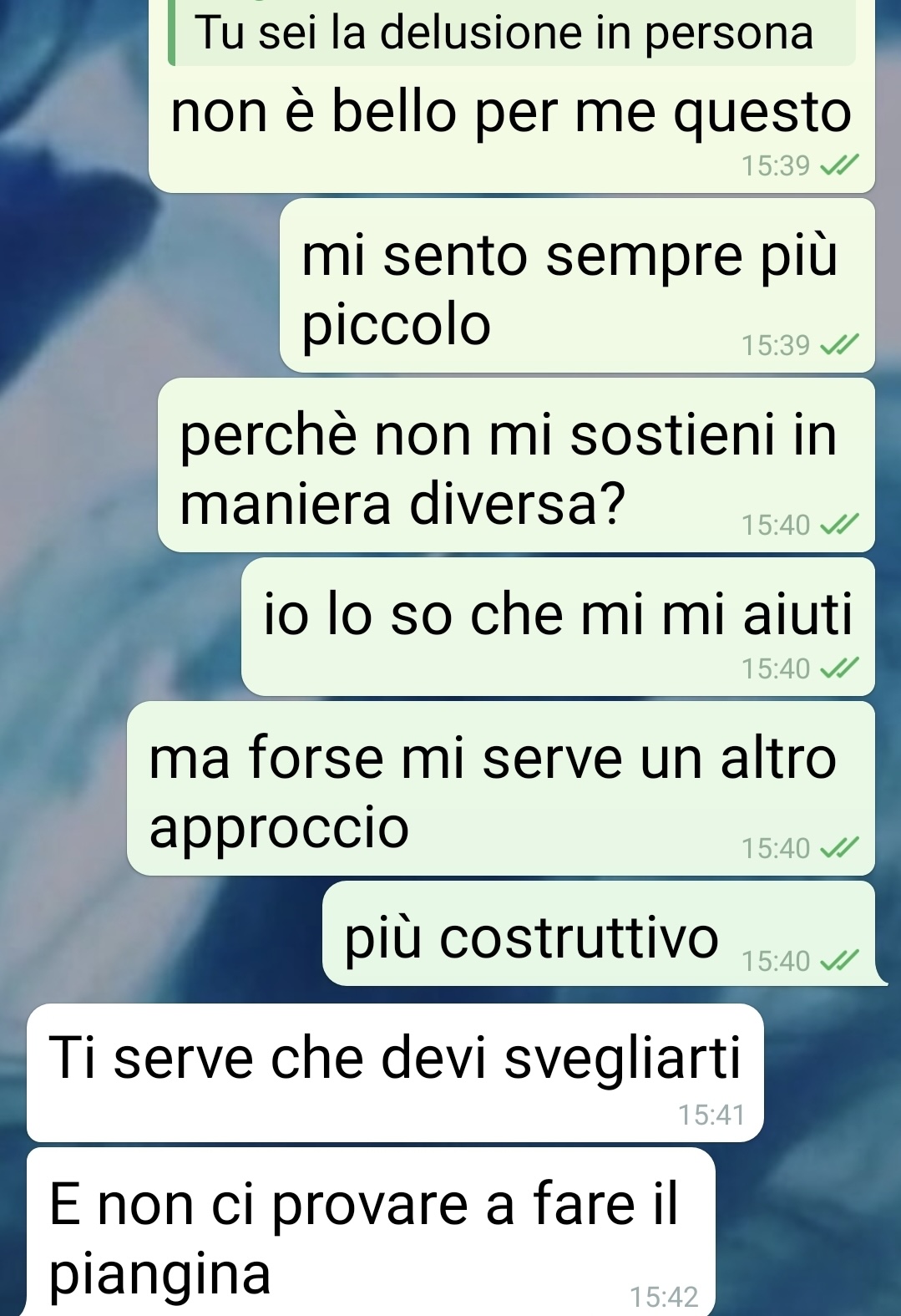 Conclude il suo racconto chiedendo aiuto e confronto, spiegando di non cercare giustificazioni ma solo un modo per migliorarsi, per sentirsi finalmente all’altezza della persona che ama.