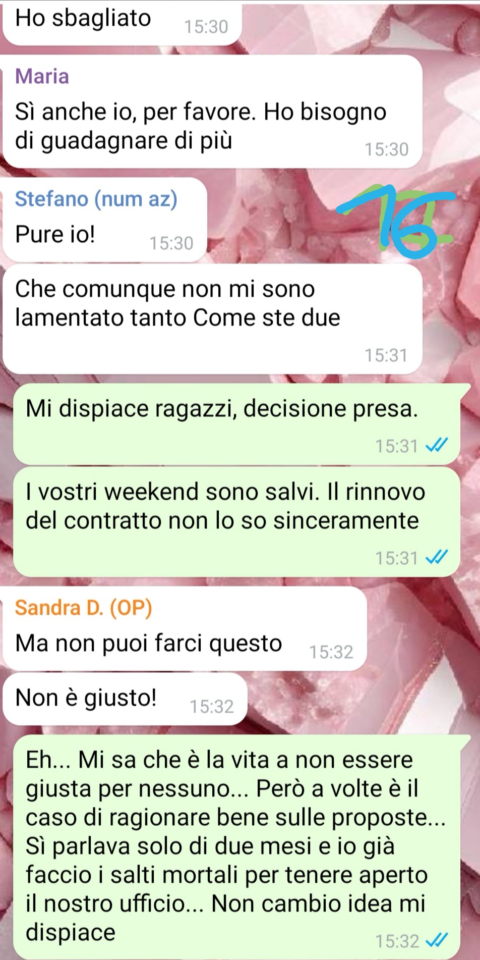 L’amica si prepara quindi a scrivere sulla chat di gruppo aziendale, il canale attraverso il quale il team si scambia abitualmente tutte le informazioni relative all’ufficio e alle attività lavorative. Tuttavia, mentre si accinge a comunicare la richiesta della sede centrale, si trova ad assistere a una situazione che preferisce non anticipare ai lettori. Rebecca riconosce che l’argomento del lavoro rappresenta una questione delicata nel nostro paese e per questo motivo desidera confrontarsi con la community di Commenti Memorabili, cercando opinioni esterne per valutare se il suo operato sia stato corretto.