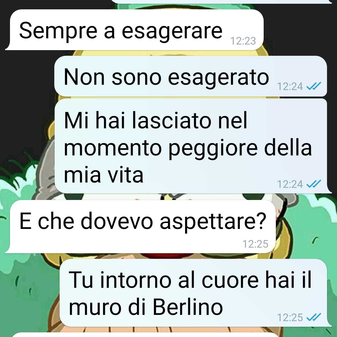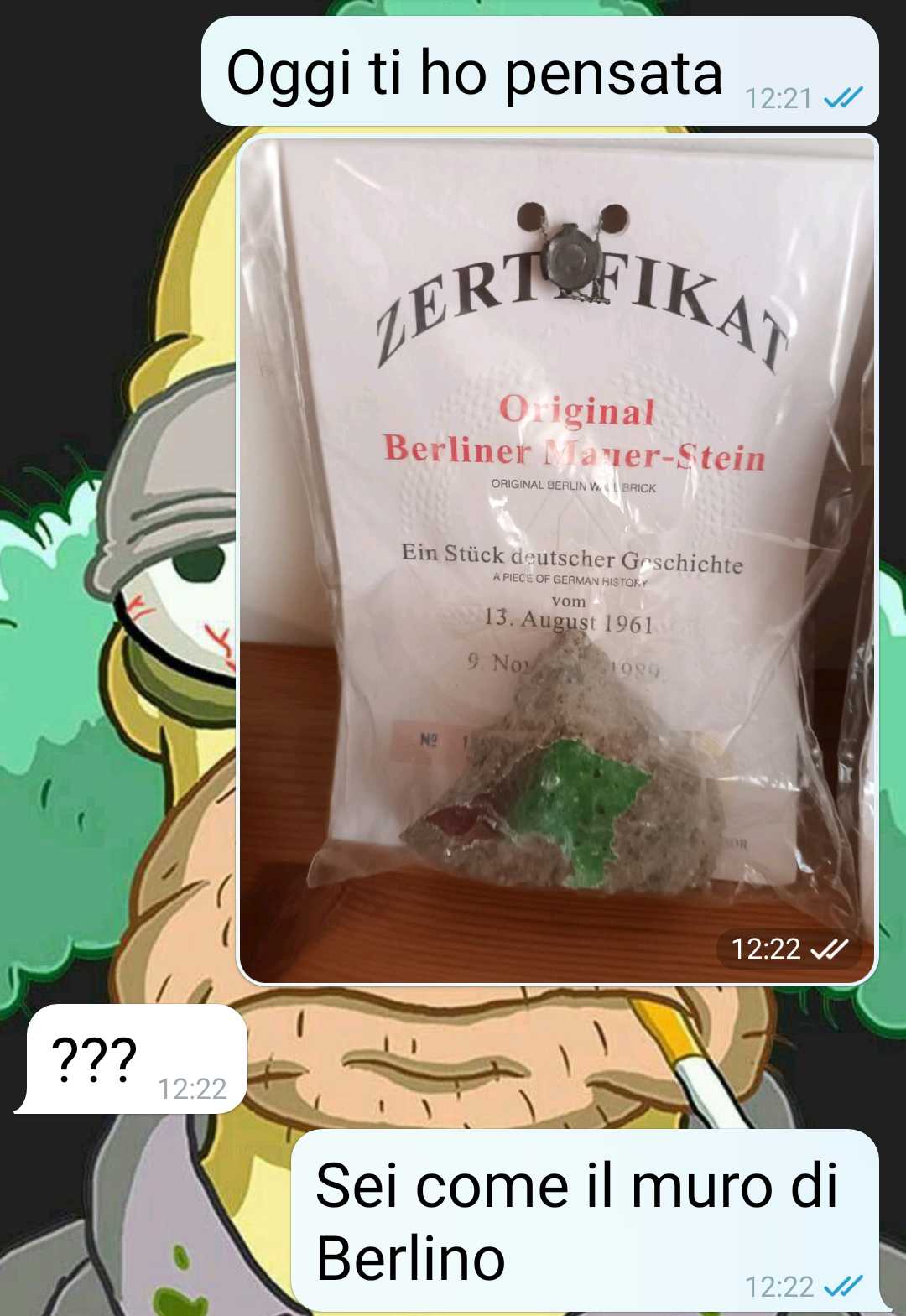 La mia ragazza è come il muro di Berlino. Oggi sono andato a casa di un mio amico. Aveva su un ripiano in salotto questa pietra che vedete in uno screen. È una pietra del muro di Berlino, una pietra di cemento, triste e grigia che ha tenuto una città divisa in due, contenendo le persone, creando una barriera al circolo di persone e sentimenti. Mi è venuta in mente la mia ragazza. Sono stato con lei sei anni e ora? È stato un periodo nero per me, è un periodo nero per me. Ho toccato il fondo di ogni disperazione umana, ho pianto fino a prosciugare i miei occhi cercando altre lacrime nel deserto dei miei occhi. Esagerato? Non credo. Dico in chat tutto alla mia ragazza. Continuo a chiamarla così anche se pure lei non fa più parte della mia vita. Quando un palazzo sta per crollare, i topi sono i primi a scappare. Scappano per prime le persone vigliacche, le persone senza un cuore o quelle che hanno un muro di Berlino intorno al cuore…