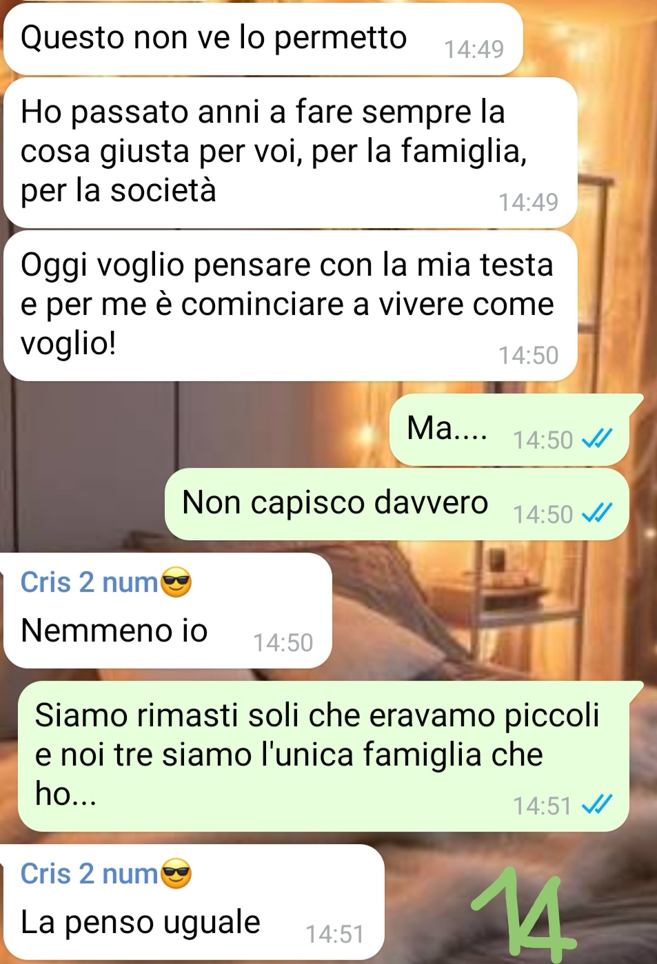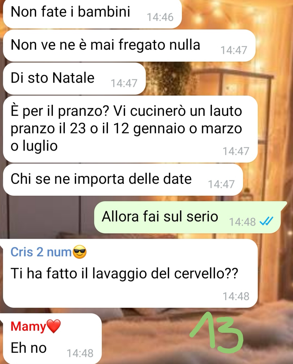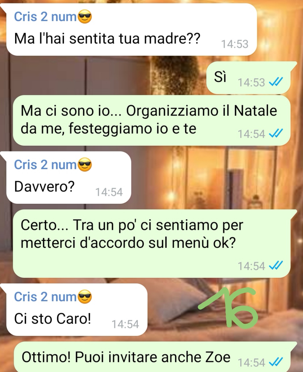 La traduttrice scrive nel gruppo famiglia per proporre l’idea di accorciare il pranzo natalizio, in modo da poter conciliare la tradizione con i suoi piani di viaggio. La richiesta viene formulata con largo anticipo, dimostrando la volontà di pianificare con attenzione e rispetto per le abitudini consolidate della famiglia. L’amica si aspetta una risposta comprensiva o al massimo qualche resistenza da parte della madre, data l’importanza che questa ha sempre dato al momento conviviale del Natale.