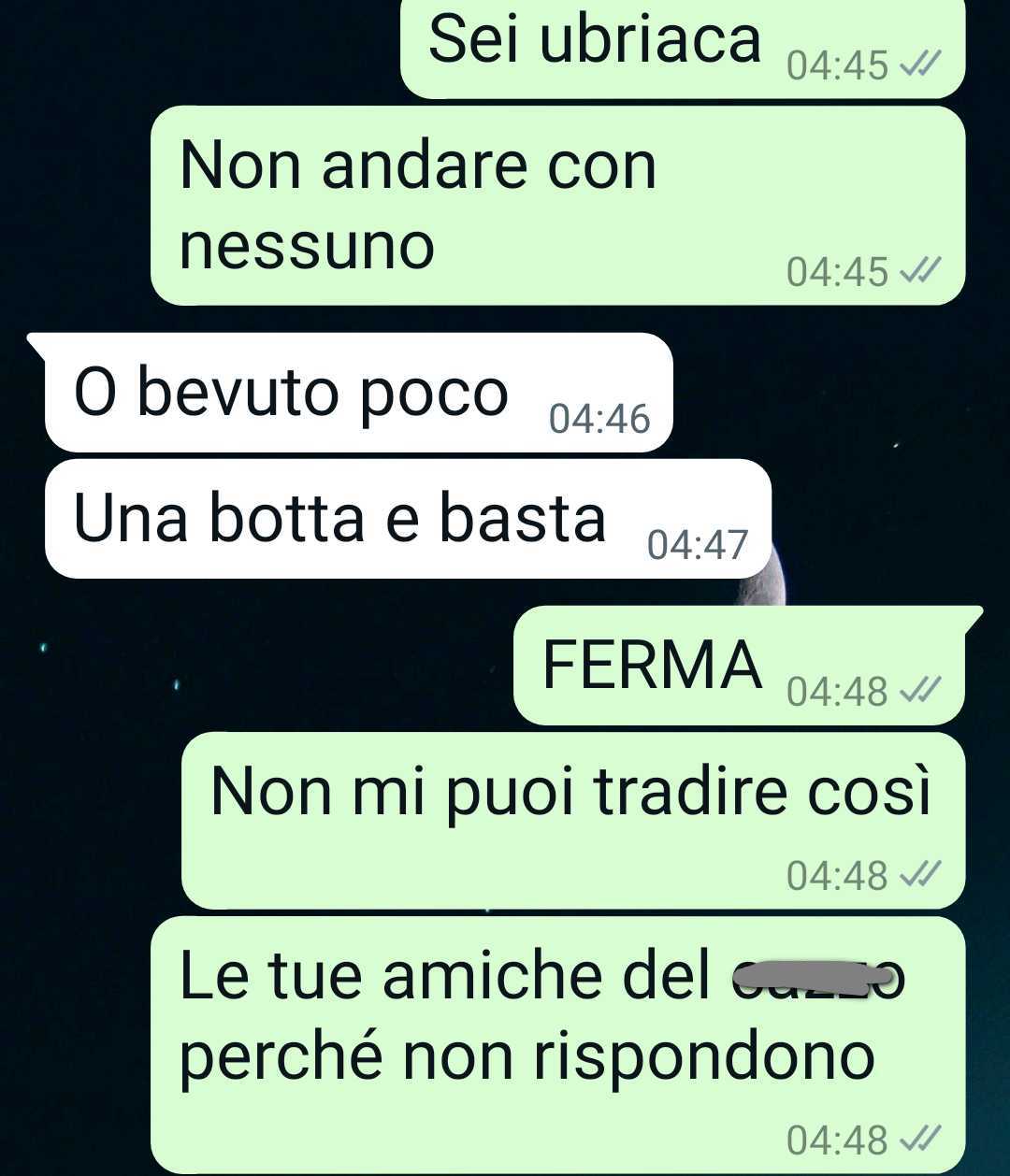 La mia futura moglie si è ubriacata al suo addio al nubilato e in piena no5e è andata con uno. Ma quello che ha sbagliato sono io. Sono io ovviamente lo stronzo, quello che per primo si è comportato male, quello che ha l’ardire di non voler essere tradito e di considerare certe cose tradimento. Sì, sono io lo stronzo!! Vi mando questa chat in un momento di grandissima disperazione per me. Ve la mando per mostrare quanto poco conosciamo chi ci sta accanto a volte, quanto basB un de5aglio stupidissimo a far crollare tu5o. La mia testa è un alveare piano di api che ronzano. Sono i miei pensieri che fanno il rumore di una segheria. Come ho fa5o a non capire niente? Come in quesB anni non ho capito che Bpo avessi accanto?? Come può la persona che sto per sposare e che dice di amarmi comportarsi così?? Come potrò mai più fidarmi di qualcuuno?? Sto malissimo perché tu5o sembra essere andato all’aria e se guardo la mia mani vedo i buchi dei chiodi che la mia ex futura moglie ha scavato sui miei palmi.