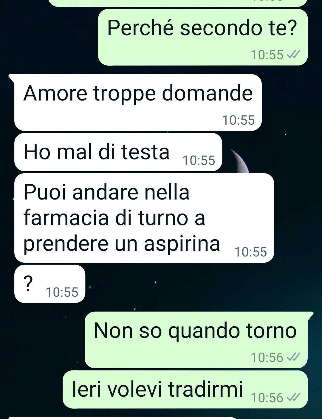 L’amico racconta di aver ricevuto conferma dell’accaduto attraverso una chat, quella stessa conversazione che ha deciso di condividere, nella speranza di riuscire a dare un senso a quanto accaduto. Le parole che usa sono piene di amarezza: dice di sentirsi come se la testa fosse un alveare, un rumore continuo di pensieri che non riesce a zittire. Parla di un dolore fisico, di una ferita che non è solo nel cuore, ma che sente fin dentro le mani, “come buchi di chiodi”, scrive, lasciati dalla persona che amava.