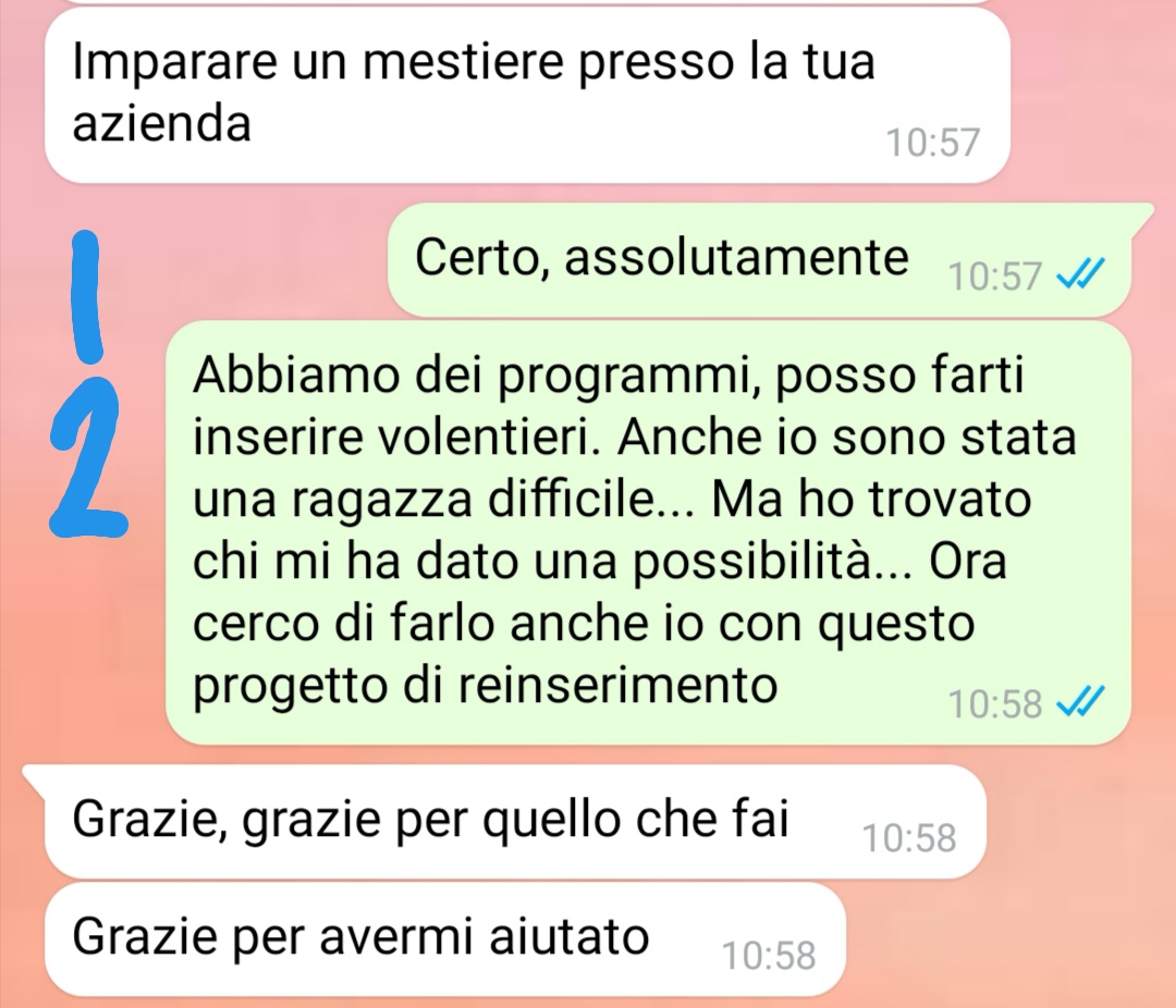 Lei stessa sa bene cosa significa trovarsi in quei panni, perché li ha indossati. E forse è proprio per questo che riesce a tendere la mano con autentica empatia. Sa che non è facile conquistare la fiducia di chi ha smesso di credere in sé stesso e negli altri. Le comunità con cui collabora inviano giovani che non sempre sono pronti ad accogliere l’opportunità che viene loro offerta. Serve tempo, pazienza, costanza.