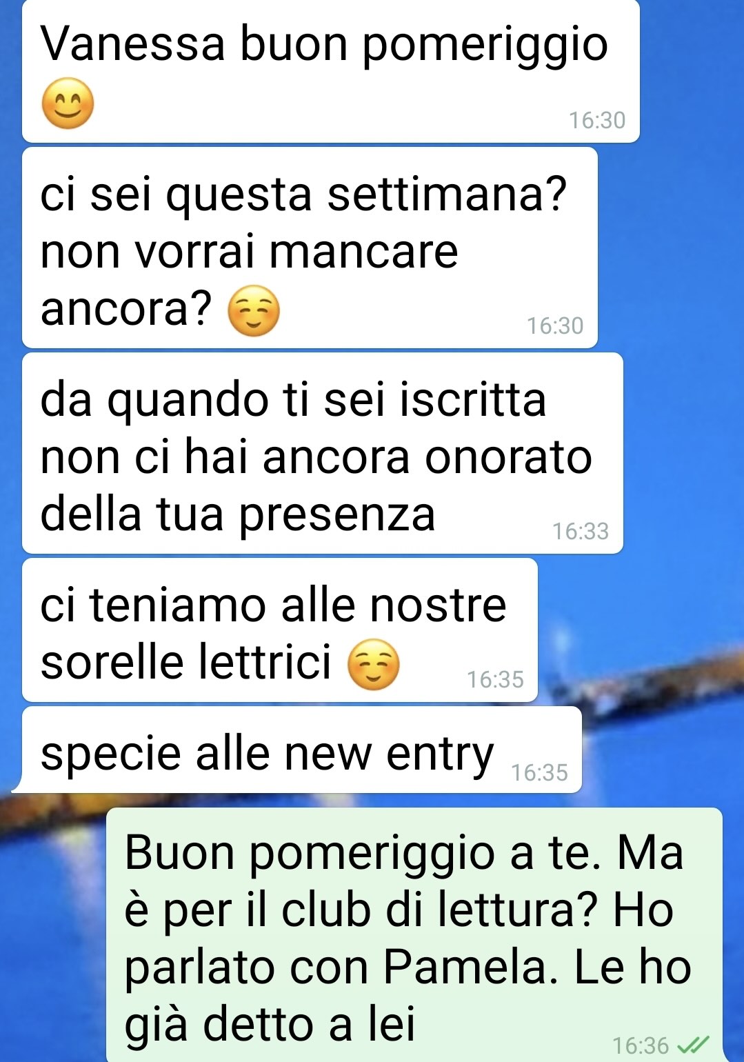 Mi ero iscritta d’istinto ad un club di lettura ma forse era troppo elitario o “ristretto” a una categoria. La presidentessa mi ha spiegato come stanno in realtà le cose. Decisamente peggio… Non trovo altre parole, si manifesta anche in quelle attività che vorrebbero essere in qualche modo culturali. Sono un’appassionata di libri e quasi non ci credevo quando una mia amica (mannaggia a lei…) mi porta a conoscenza di un club di lettura. Ci si riunisce, si legge assieme, si parla e si dibatte sui libri. Fantastico, penso. Faccio una pre-iscrizione gratuita e vado al meeting conoscitivo. Sai che bello poi andare col fidanzato, anche lui appassionato. Ma forse ho sbagliato qualcosa. Mi pare un club per sole donne. Niente di male, ma non inizio neanche a partecipare. Ma dopo 2 cortesi rifiuti eco che mi scrive Laura, la presidente. Che mi spiega come ho capito male. La realtà è ben peggiore. Anche gli uomini possono partecipare. Ops… non-donne