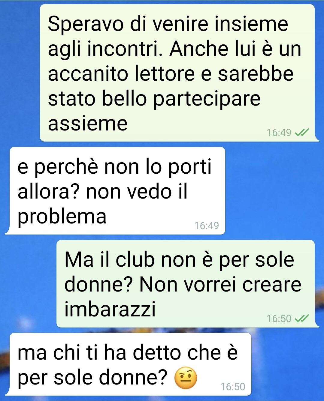 La nostra fan racconta di essersi iscritta d’istinto a un club di lettura dopo averne sentito parlare da un’amica. Descrive il progetto come interessante e stimolante: un gruppo in cui leggere insieme, confrontarsi sui testi e discutere di letteratura. Da appassionata di libri, l’idea le sembrava perfetta. Decide così di fare una pre-iscrizione gratuita e di partecipare al primo incontro conoscitivo, immaginando anche la possibilità di coinvolgere il proprio fidanzato, anch’egli appassionato.