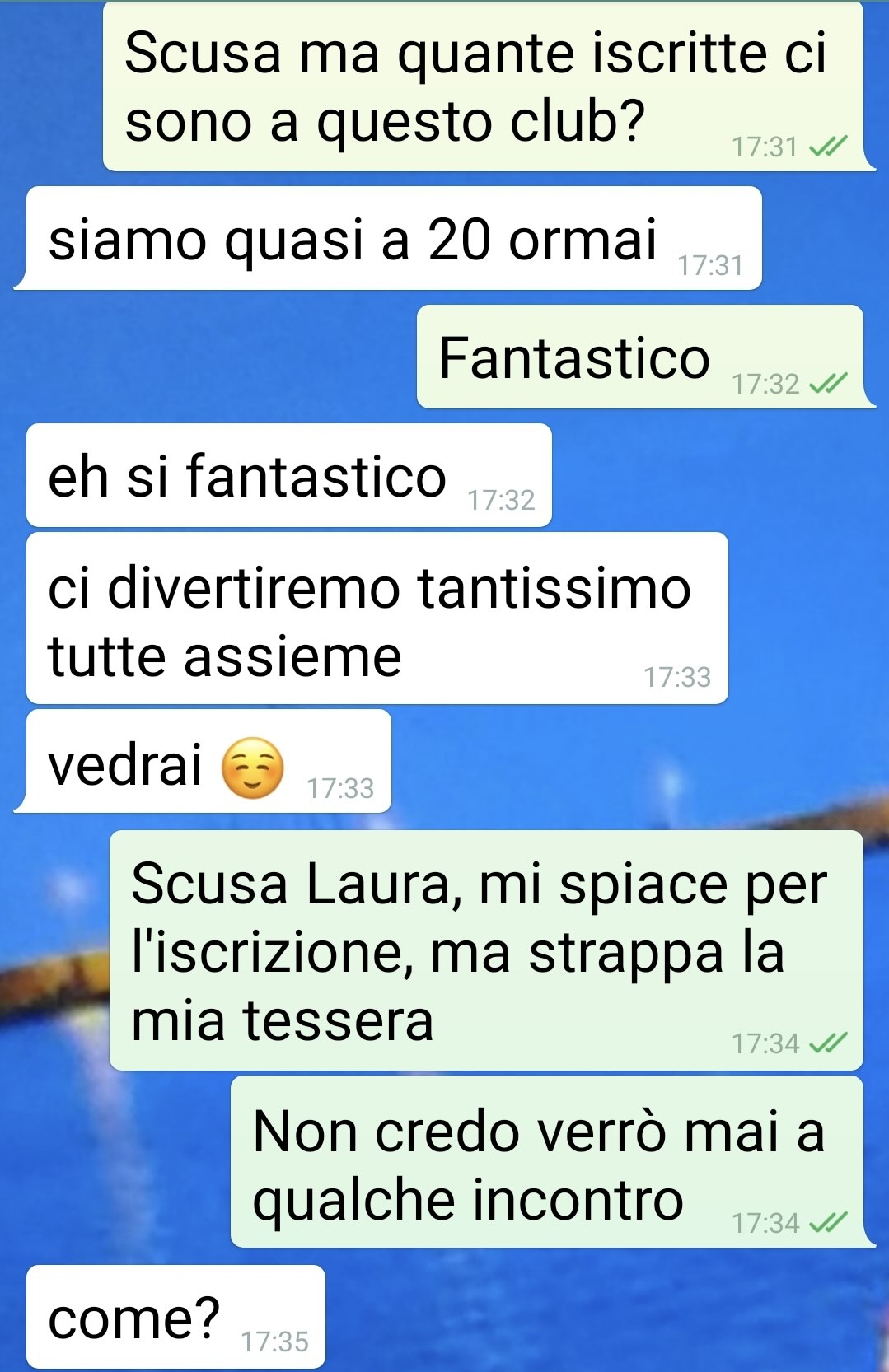 Racconta di essere rimasta perplessa dalla formulazione utilizzata, in particolare dal riferimento ai “non-donne”, espressione che le è sembrata ambigua e rivelatrice di una chiusura più complessa di quella che si aspettava. L’esperienza, nata con entusiasmo e curiosità, si è così trasformata in una delusione. Non ha nemmeno iniziato a partecipare alle attività, sentendosi fuori posto ancor prima di cominciare.