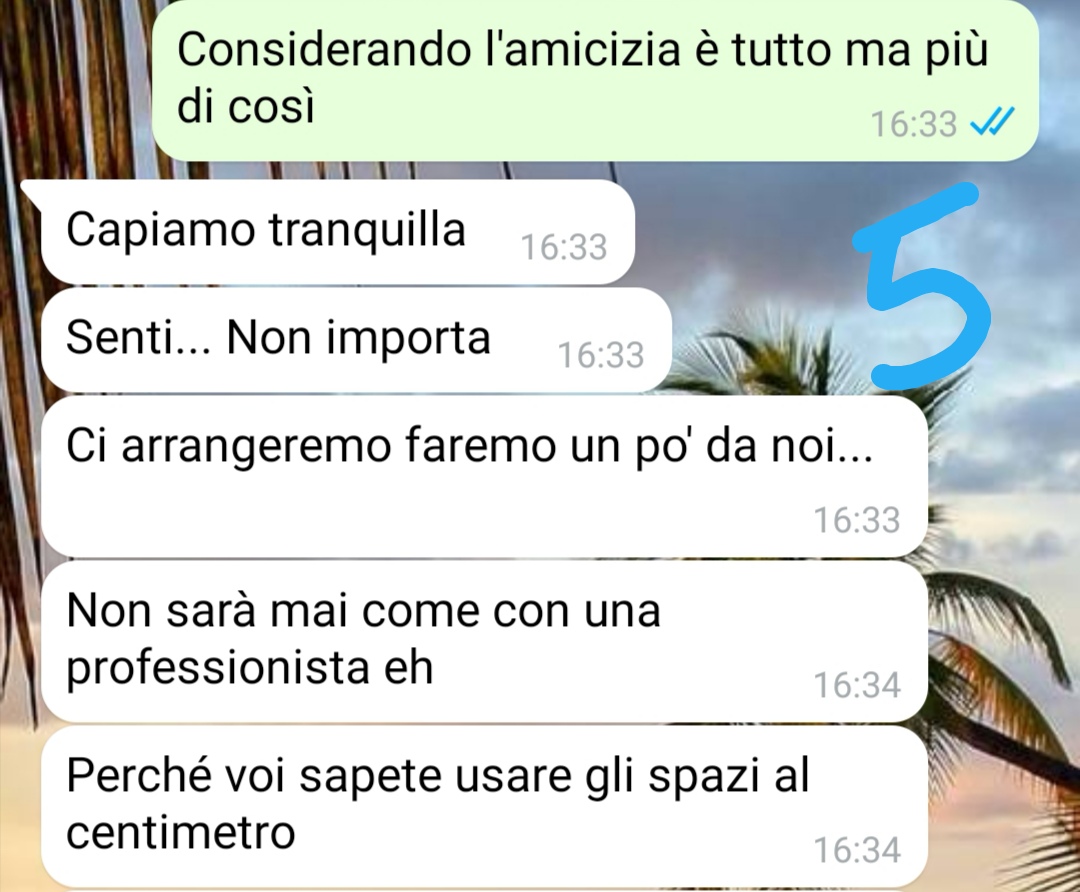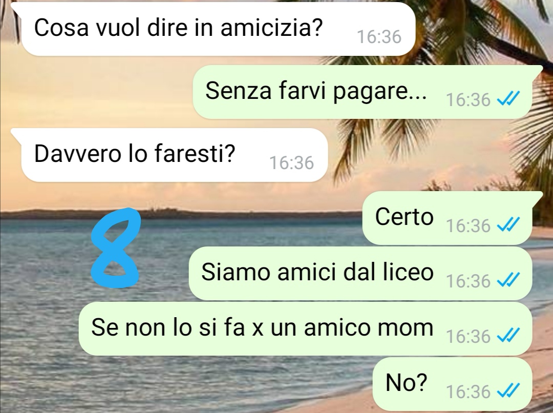 La nostra fan Lorella, interior designer di professione, ci ha inviato una conversazione che rappresenta per lei un esempio lampante delle stranezze e contraddizioni con cui ci si confronta ogni giorno, anche nei rapporti personali più consolidati. A suggerirle di condividere la chat è stato il marito, lettore abituale della pagina, colpito dall’assurdità della vicenda.