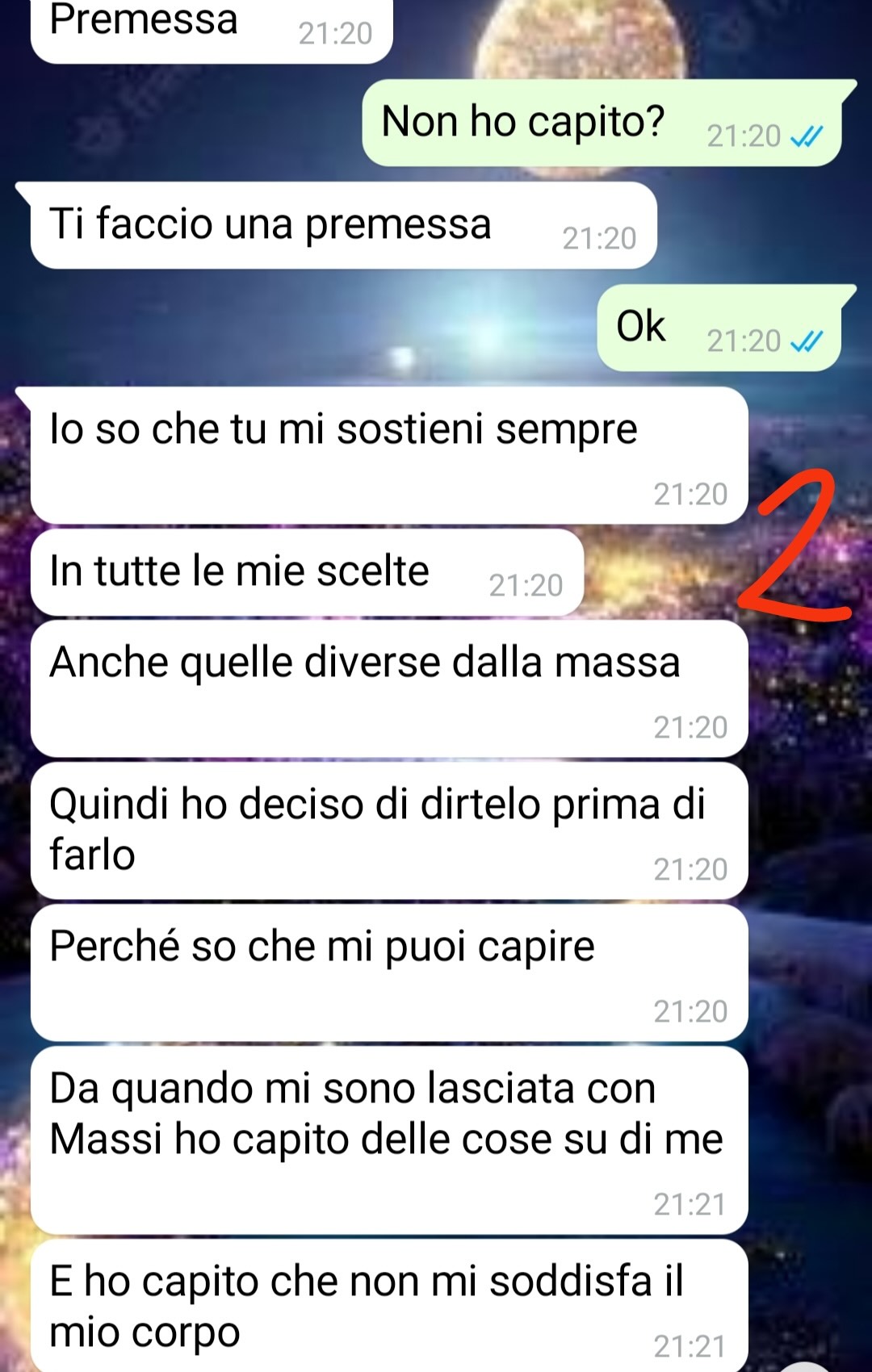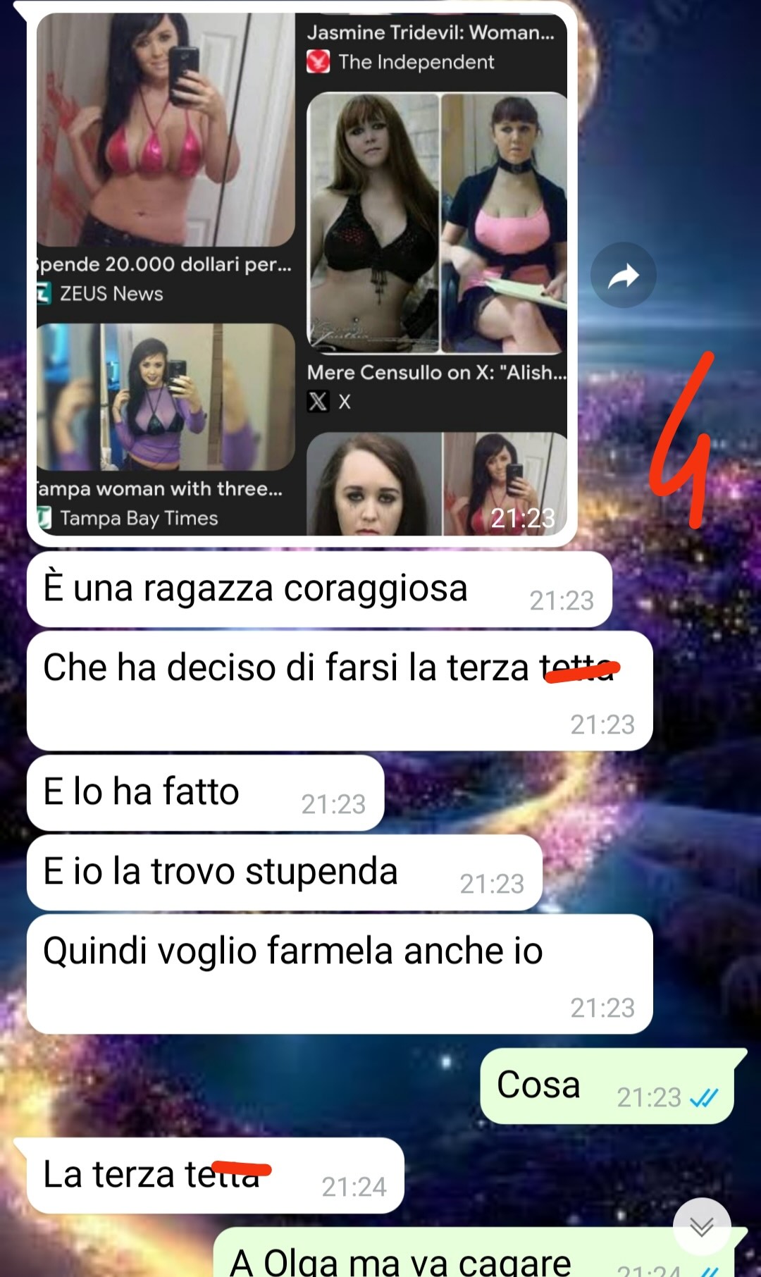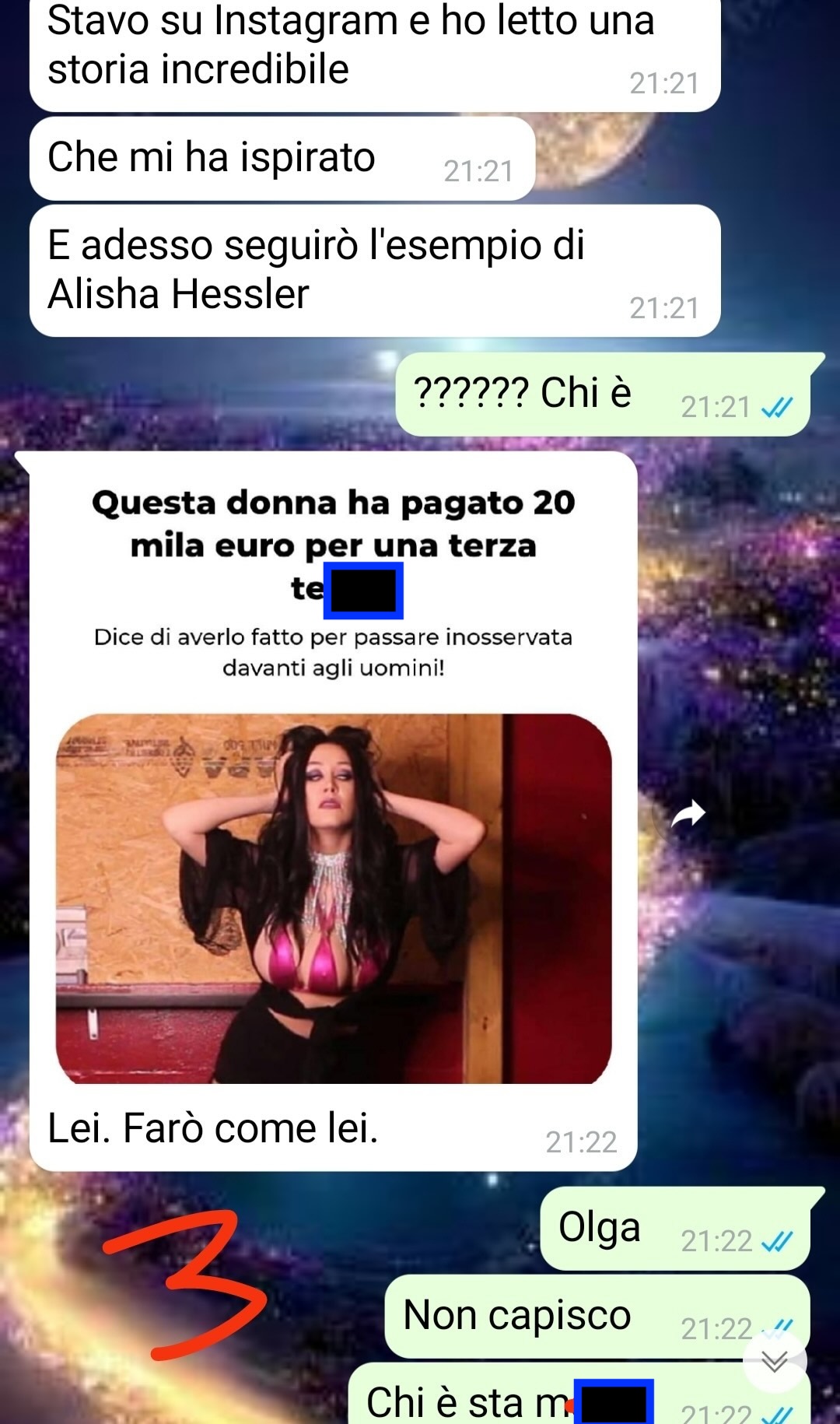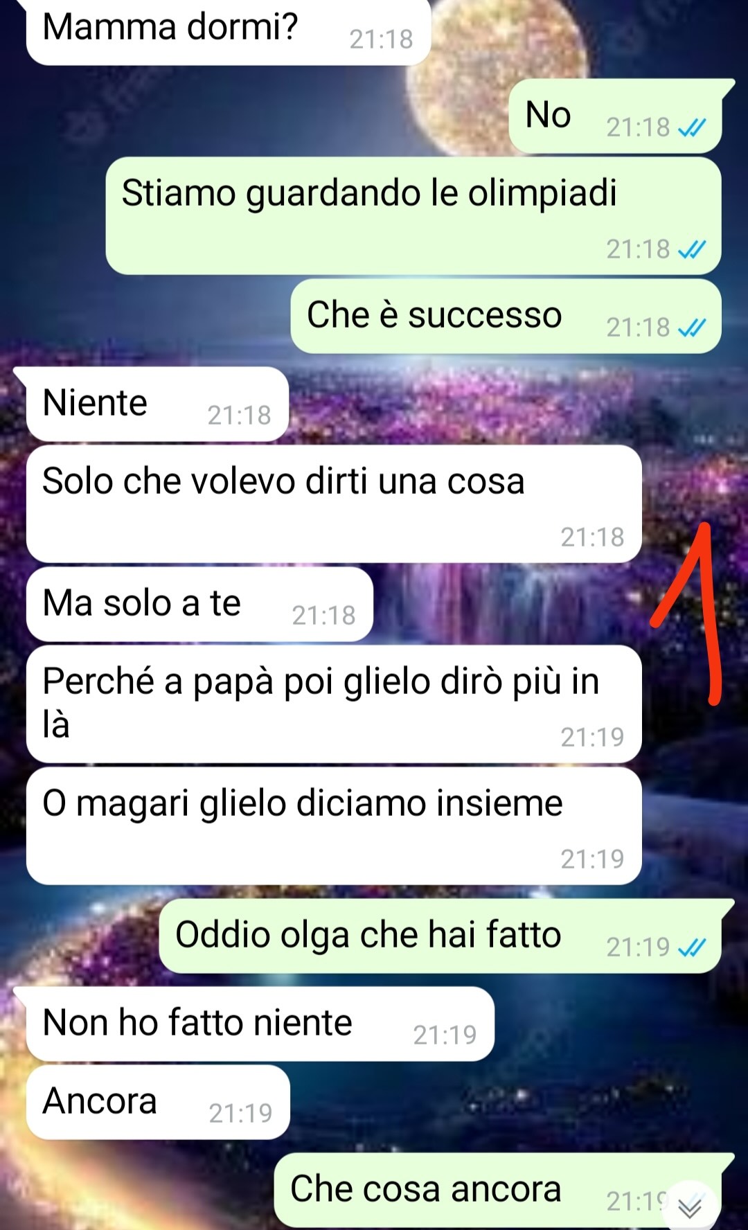 Mi chiamo Silvana e sono una seguace un po’ “attempata” ma vi conosco grazie a mia figlia Olga che mi fa sempre leggere le conversazioni che pubblicate….ho trovato il contatto su facebook e vi mando una conversazione anche io proprio con mia figlia Olga….lei è un po’ allegra come ragazza ed è sempre stata molto originale e piena di desideri fuori dal comune…Io l’ho sempre aiutata, quando possibile, a realizzare quello che voleva, però quando mi ha scritto l’altra sera mi ha veramente fatto tremare. Quella serata nella nostra famiglia non se la scorderà mai nessuno….Dopo che Olga mi ha raccontato del suo nuovo sogno nel cassetto ho veramente sentito un certo brivido lungo la schiena, soprattutto pensando che prima o poi avrei dovuto dirlo al padre (mio marito) che tra i due è il meno tollerante sulle idee stravaganti di olga…Che pazienza che ci vuole ragazzi miei…!!!!!!!