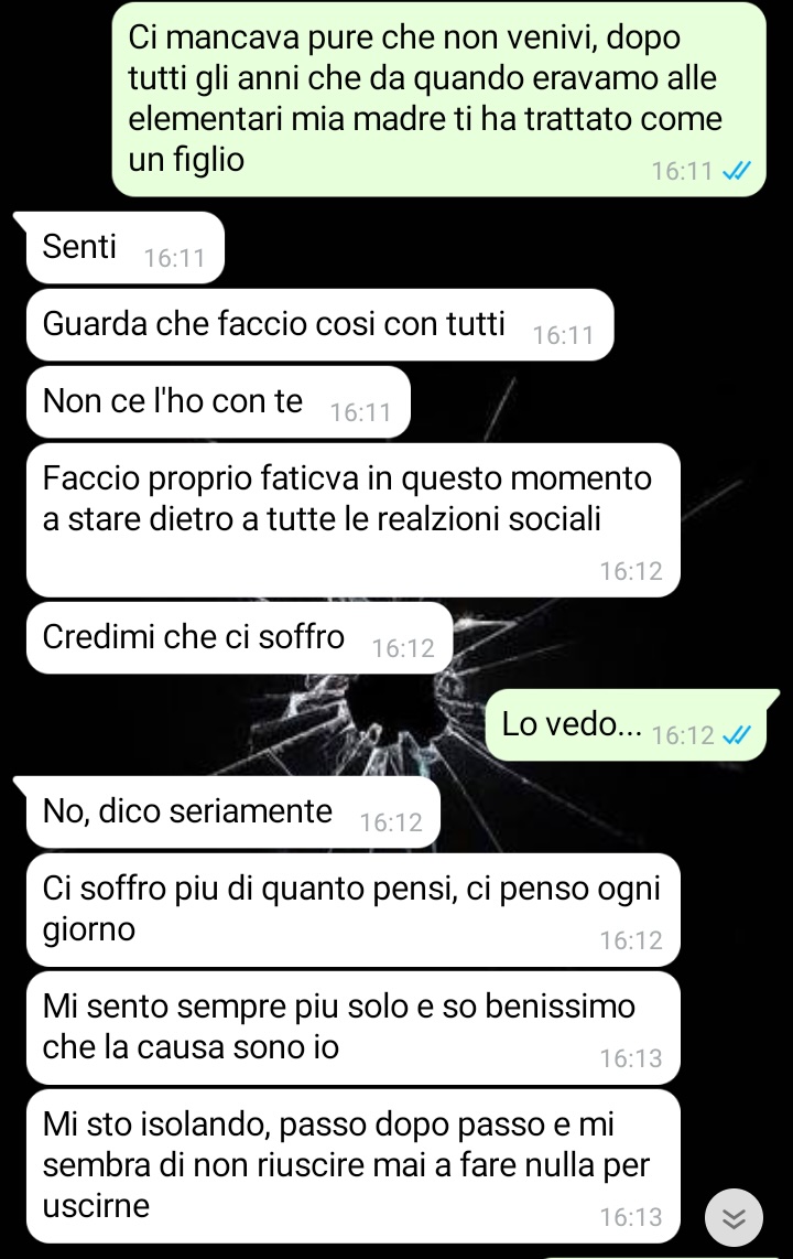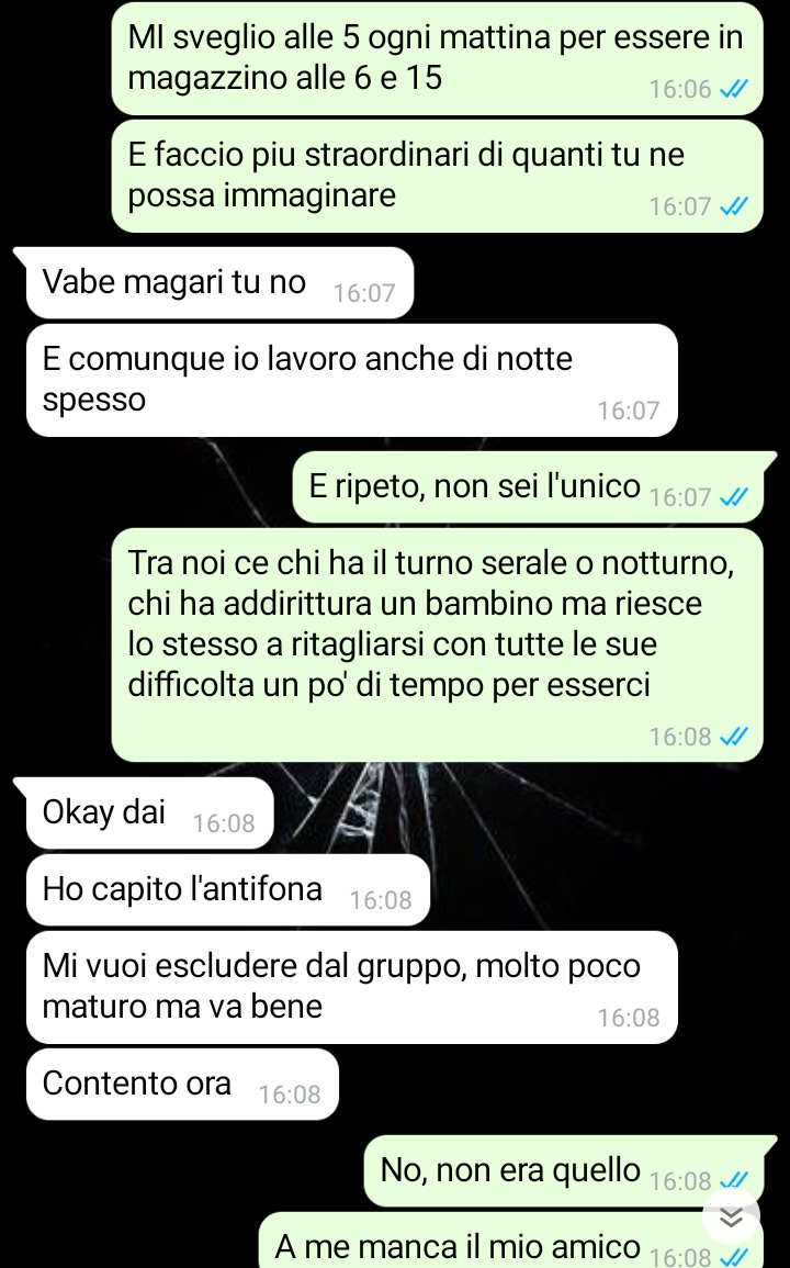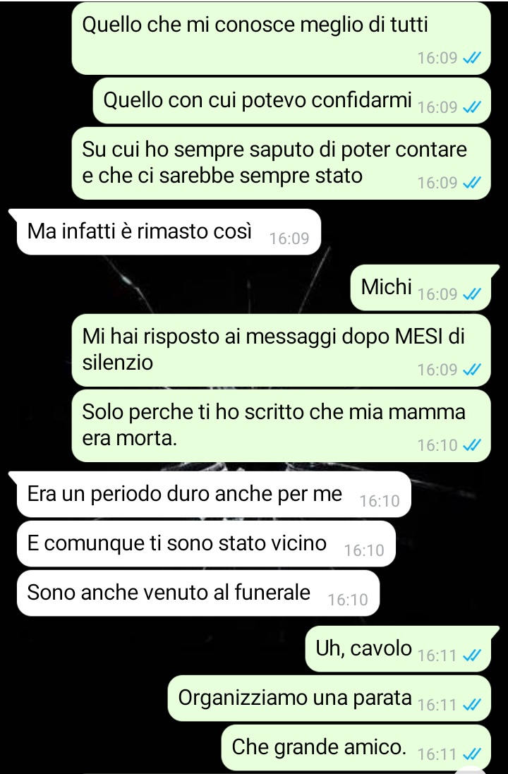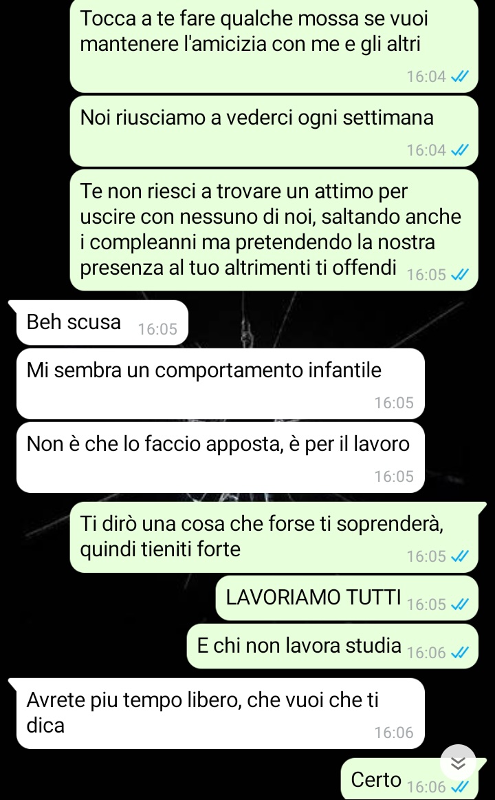 Il nostro fan ha deciso di condividere una situazione delicata riguardante il suo migliore amico Michele, con cui è riuscito a vedersi solamente tre volte nell’arco di un intero anno. Inizialmente l’amico pensava che si trattasse di semplici impegni, ma col tempo ha iniziato a notare un pattern preoccupante: ad ogni proposta di incontro arrivavano scuse sempre più assurde e poco credibili. La situazione ha raggiunto il punto di rottura quando il follower, insieme agli altri amici del gruppo, si è stancato di dover continuamente ‘corteggiare’ Michele come se stessero chiedendo un favore. All’ennesimo rifiuto, la nostra fan è esplosa e ha deciso di affrontare direttamente la situazione, ricevendo però l’ennesima bugia come risposta.