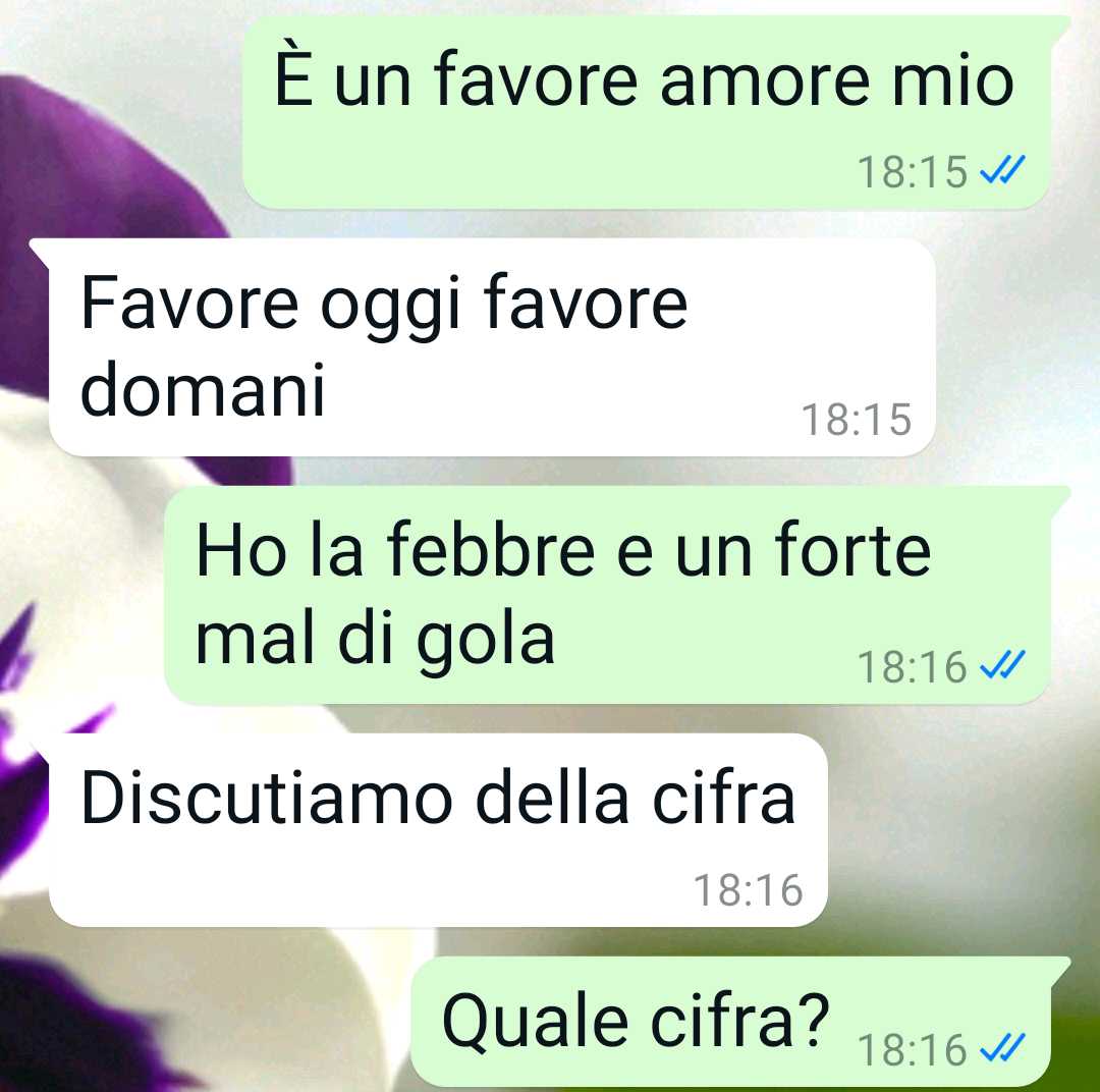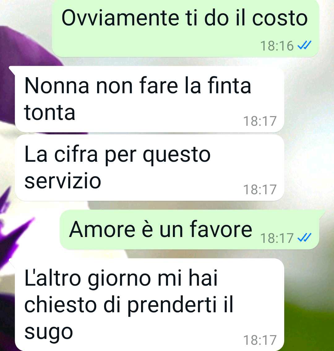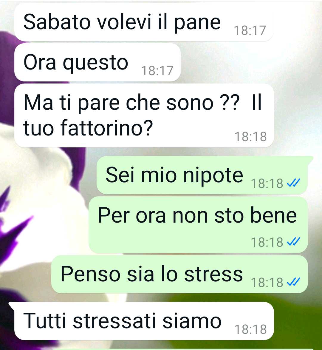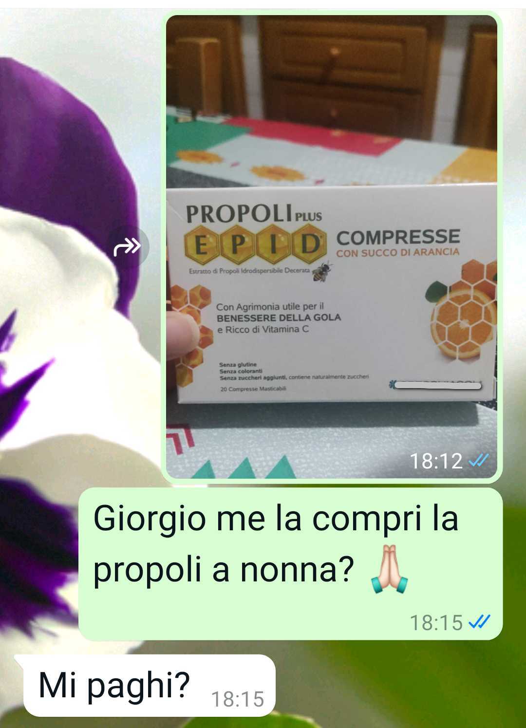 Mio nipote vuole essere pagato per prendermi la propoli. Non sto bene per ora. Sono nonna di Giorgio, un ragazzo che per adesso non lavora e non studia. Mi sono permessa di chiedergli alcuni favori. Non sto bene in questo periodo. Sto vivendo un grande stress e per questo ho le difese immunitarie basse e spesso ho febbre. Non voglio usarlo, non voglio farlo sentire male. Mi spiace di chiedere a lui, ma mio figlio e mia nuora lavorano tutto il giorno e non mi rimane che chiedere a lui un favore. Forse ho esagerato, forse ho sbagliato tutto. Non lo so. So solo che ho bisogno di aiuto in questo periodo. Lo so che la vita è transitoria, che siamo qui di passaggio, lo so che tutti ce ne dobbiamo andare prima o poi. Non è la mia morte che mi spaventa, ma quella dei miei cari. Quello che più mi spaventa è la solitudine, è un grande letto freddo e vuoto, è una tavola apparecchiata senza nessuno a riempirla, è il lunedì, il martedì e tutti gli altri giorni della settimana in compagnia di pensieri grigi come nuvole. Scusate per questi pensieri tristi. Scusate. Mio nipote mi ha chiesto dei soldi per aiutarmi e io ho risposto così. Buona giornata, Rosa