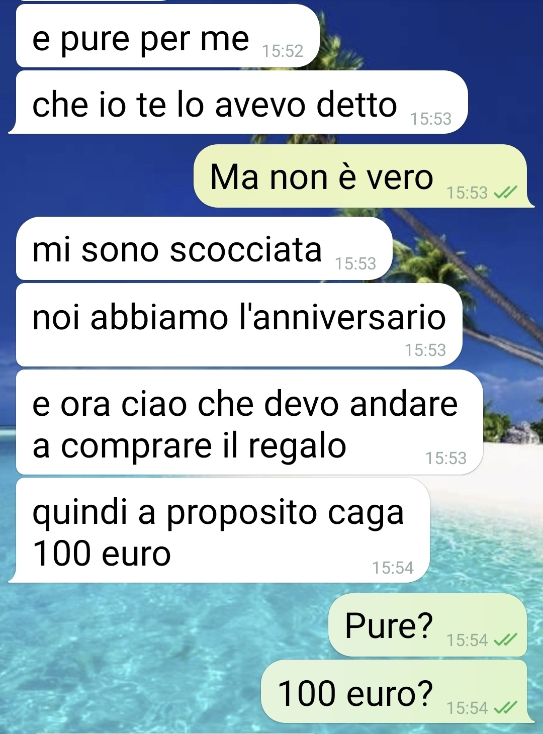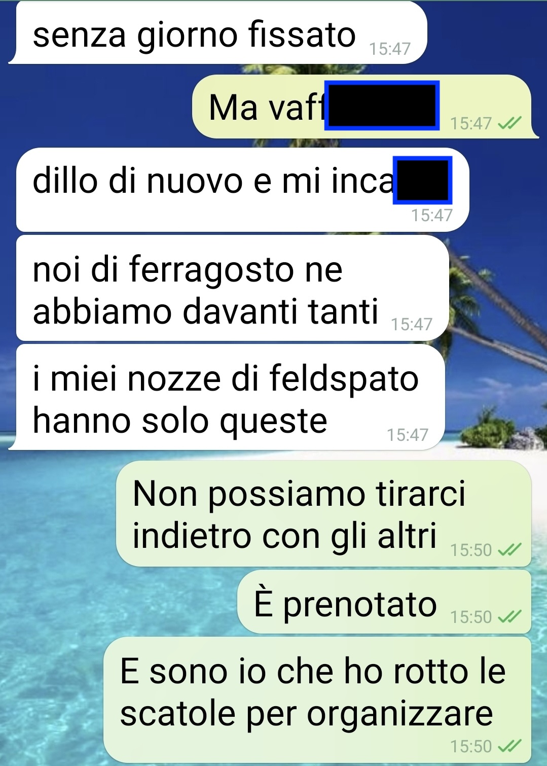 Tuttavia, nel giro di pochi messaggi, l’atmosfera da sogno si è trasformata in un incubo. La sua compagna gli ha infatti comunicato che proprio in quei giorni i suoi genitori festeggeranno un importante anniversario: le nozze di feldespato. Un evento che, a quanto pare, non è rinviabile né evitabile.