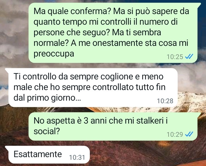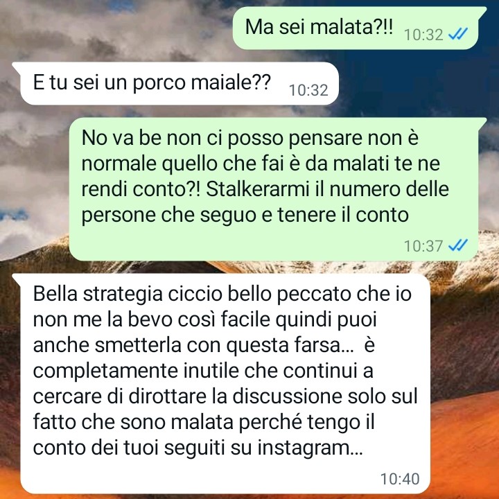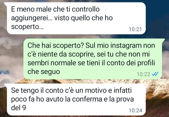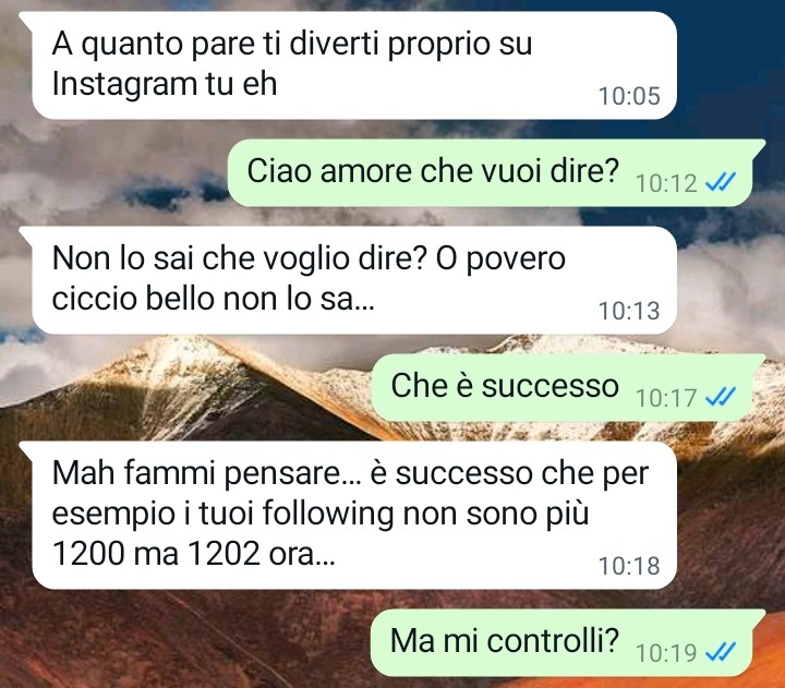 Mi chiamo Alessandro e sto con Angela da 3 anni. Io e la mia ragazza siamo la classica coppia standard, piena di alti e bassi e di qualche discussione ogni tanto, un po’ di gelosia si, ma a parte questo io e Angela ci amiamo molto e ci siamo sempre voluti un gran bene, ecco perché quello che è successo stamattina mi sciocca il doppio; non mi aspettavo proprio che la mia ragazza potesse mai attaccarmi per una cosa del genere, anche perché vi garantisco che io ho la coscienza pulita e non ho davvero fatto niente di male. Vi chiedo di leggere la chat che ho inviato per favore e vi renderete conto da voi che stiamo parlando veramente di sciocchezze, di cose che non contano niente nel mondo di oggi, soprattutto quando si tratta di social e di mondo virtuale. Il vero dramma però è che stamattina ho scoperto una Angela diversa, una persona che ho capito di non conoscere per niente e questo mi ha sconvolto di brutto. Vi mando la chat perché seguo sempre la vostra pagina e mi piacerebbe avere un vostro parere sincero data la frustrazione che sto provando in questo momento.