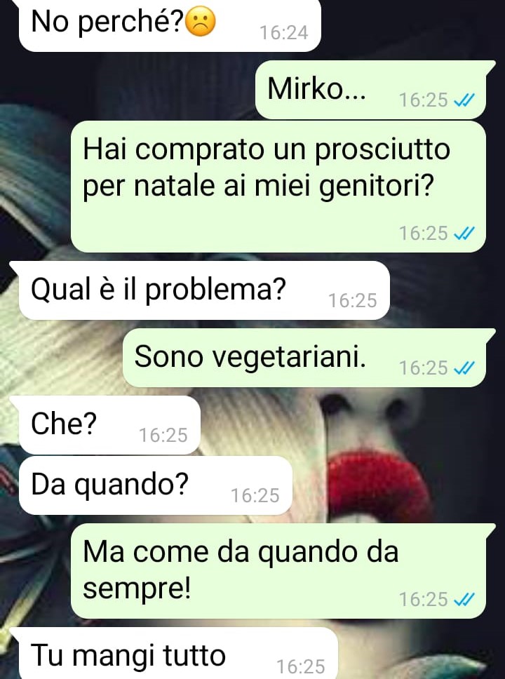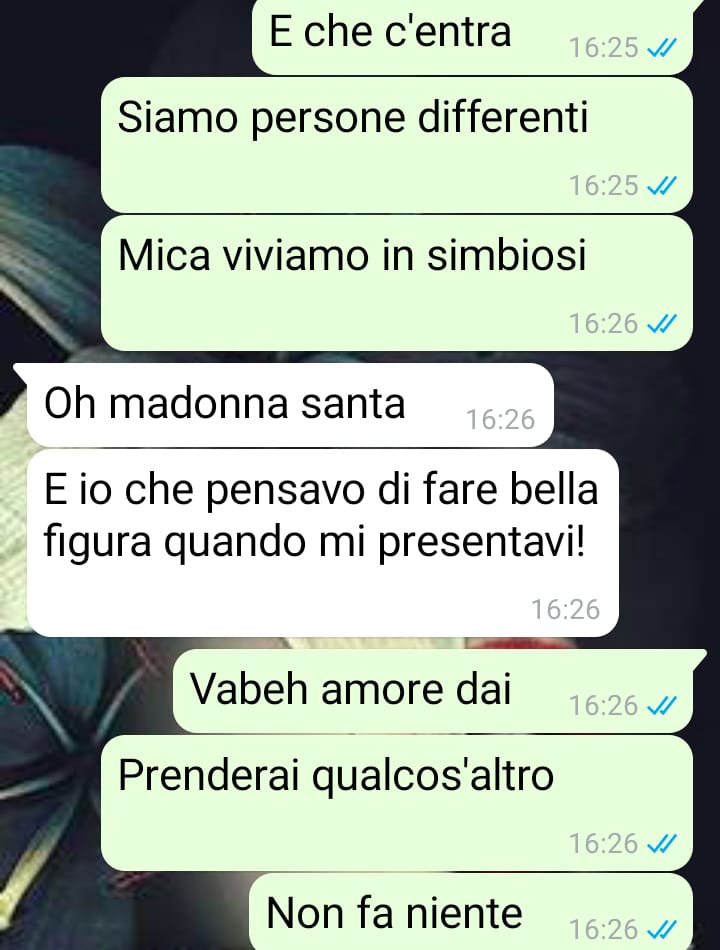 Buongiorno Commenti Memorabili, è dicembre e come ogni anno è arrivata la corsa ai regali. Ormai sembra essere un vero e proprio obbligo quello di dover fare qualcosa per natale alle persone e il ragazzo con cui mi sto vedendo da qualche mese incarna perfettamente questo concetto consumistico del natale. Il problema è venuto fuori quando io e i miei genitori gli abbiamo proposto di venire a mangiare da noi in occasione del natale, in modo da potergli presentare appunto i miei. Mirko ha pensato subito di prendergli un regalo e mi ha scritto non appena è tornato a casa. Che male c’è, penserete. Il problema? Non è un regalo adatto ai miei genitori. Quando gli ho spiegato la motivazione, la sua reazione mi ha lasciata letteralmente allibita. Ma la cosa peggiore è che questa è stata solo la scintilla per far partire tutta la discussione su come la pensiamo diversamente sul natale, fino a quando Mirko non se ne è uscito con dei messaggi così assurdi che sono andata su tutte le furie. Leggete i messaggi e guardate come mi ha dato dell’egoista per una cosa così stupida, ma sul quale ormai si stanno attaccando tutte le persone che pensano soltanto ai soldi e ai regali.