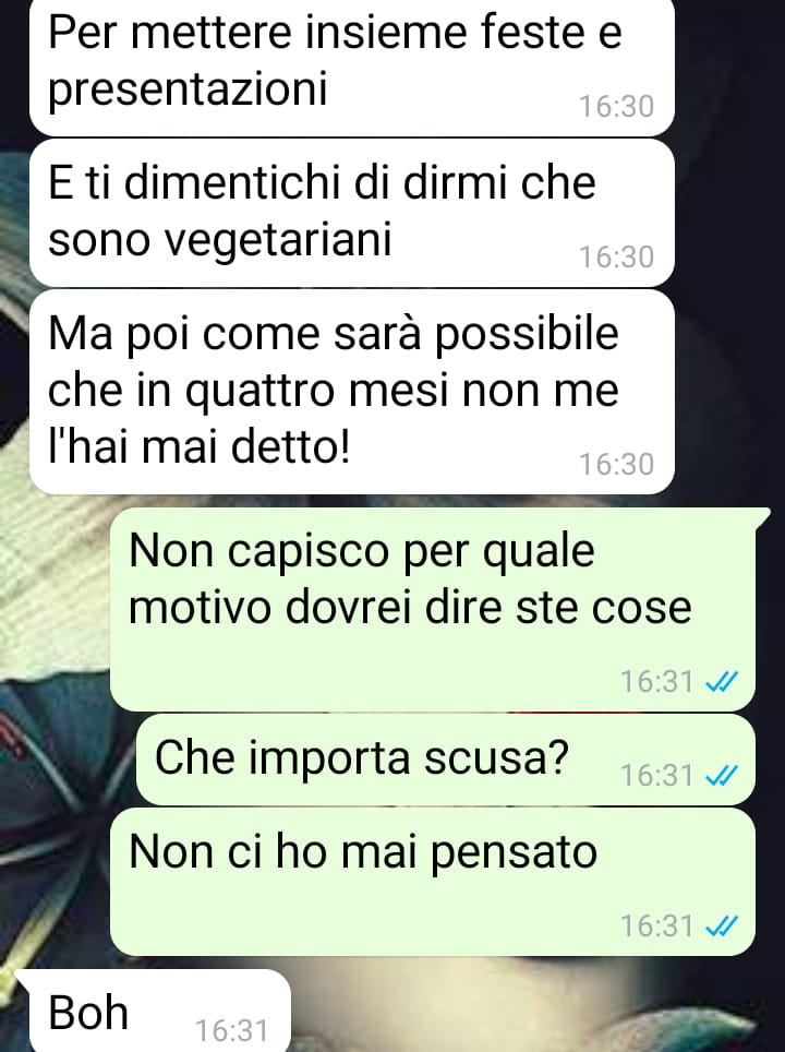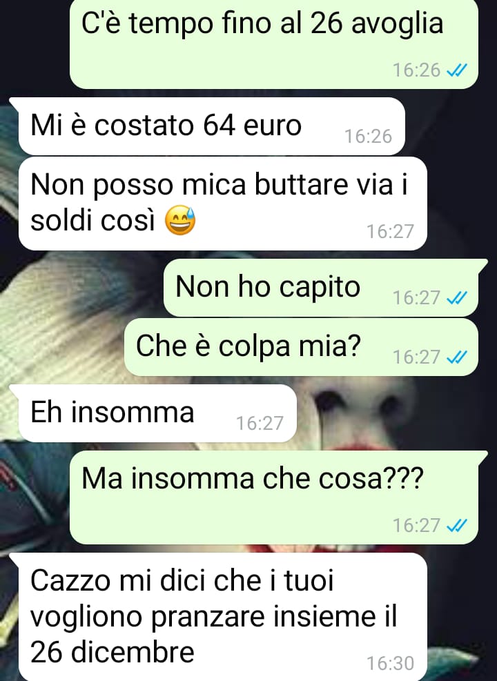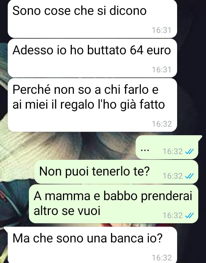 La nostra fan racconta di come dicembre abbia portato con sé la consueta corsa ai regali natalizi, trasformandosi in quello che considera un vero e proprio obbligo sociale. Il ragazzo con cui si frequenta da alcuni mesi, Mirko, sembra incarnare perfettamente questa concezione consumistica del Natale. La situazione si è complicata quando l’amica e i suoi genitori hanno invitato il giovane a trascorrere il pranzo di Natale insieme a loro, offrendogli l’opportunità di conoscere finalmente la famiglia della ragazza.