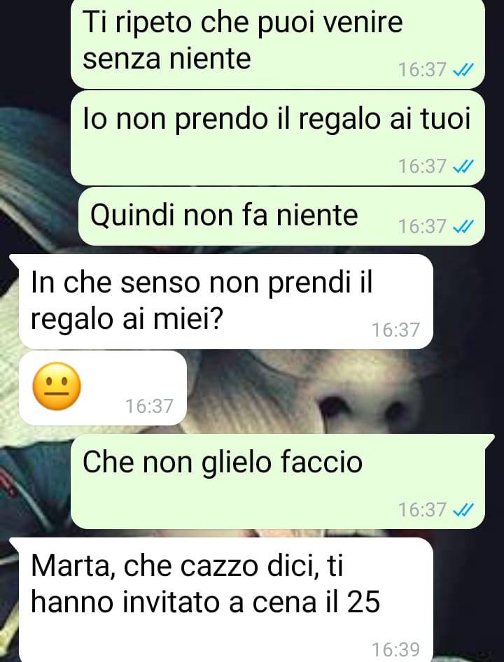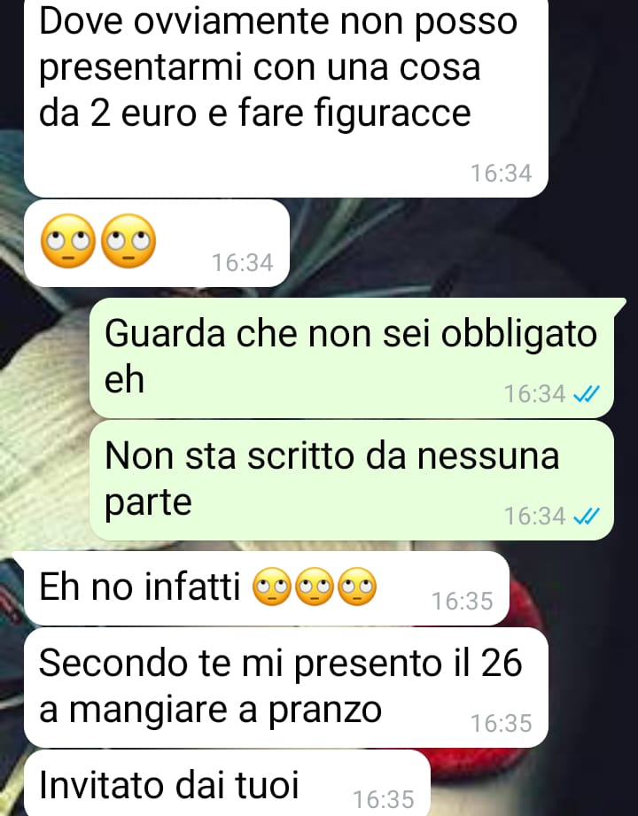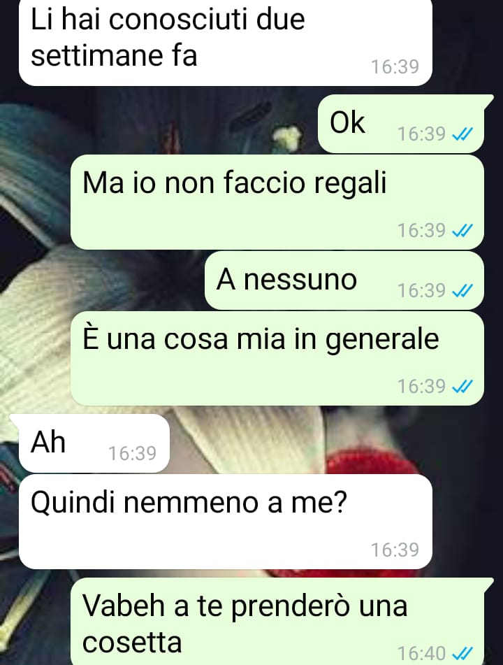 Mirko ha immediatamente pensato di acquistare un regalo per i genitori della follower e le ha scritto non appena è rientrato a casa per comunicarle questa intenzione. Tuttavia, secondo il racconto della nostra amica, il presente che il ragazzo aveva in mente non era appropriato per l’occasione o per le persone a cui era destinato. La fan ha quindi cercato di spiegargli i motivi per cui quella scelta non fosse adeguata.