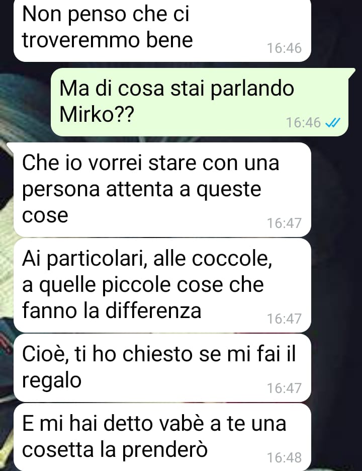 La situazione è degenerata quando Mirko ha inviato dei messaggi che la nostra fan definisce assurdi, arrivando persino ad accusarla di egoismo per quella che lei considera una questione banale. L’amica si è infuriata per essere stata etichettata in questo modo, soprattutto considerando che il problema riguardava una differenza di vedute su qualcosa che ritiene insignificante. La follower conclude il suo racconto sottolineando come questa mentalità consumistica stia contagiando sempre più persone che sembrano concentrarsi esclusivamente su denaro e regali.